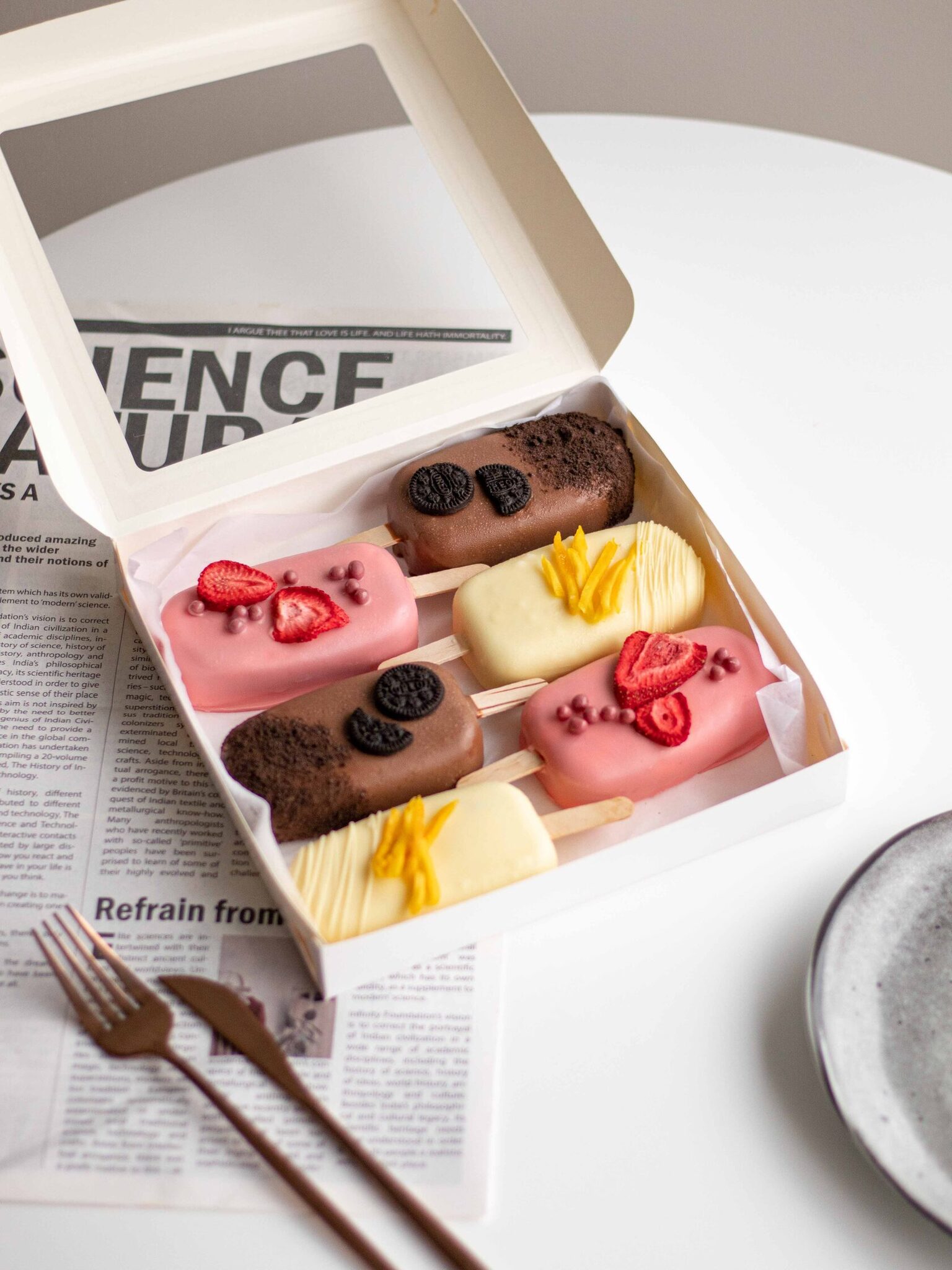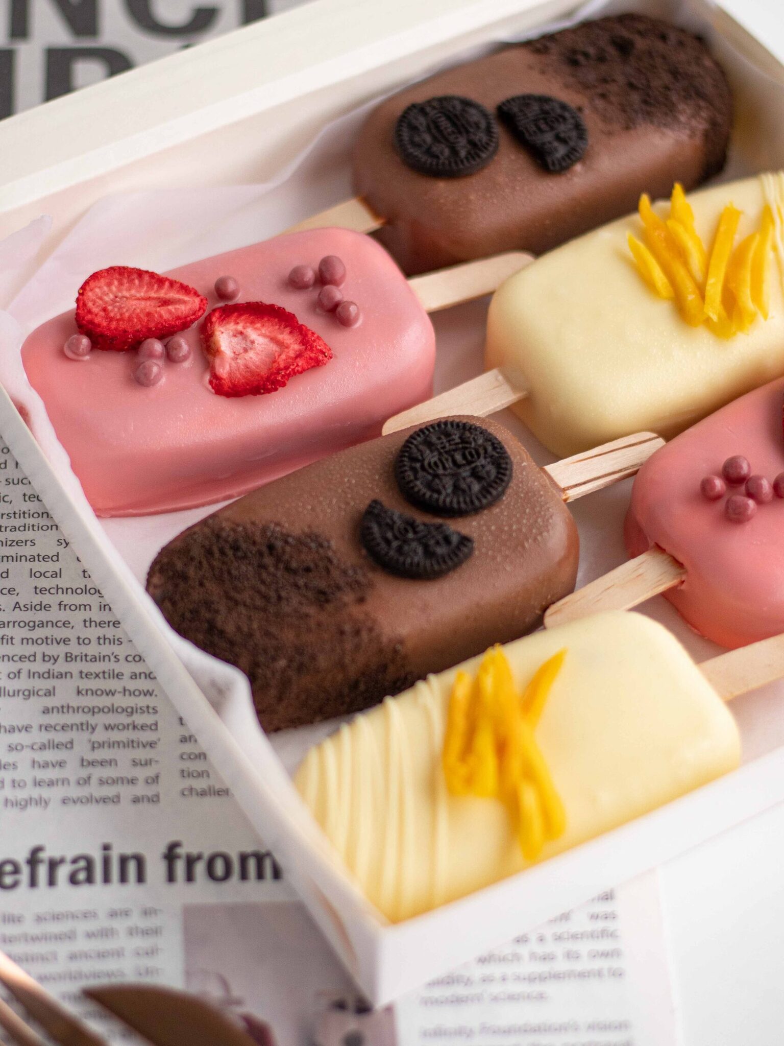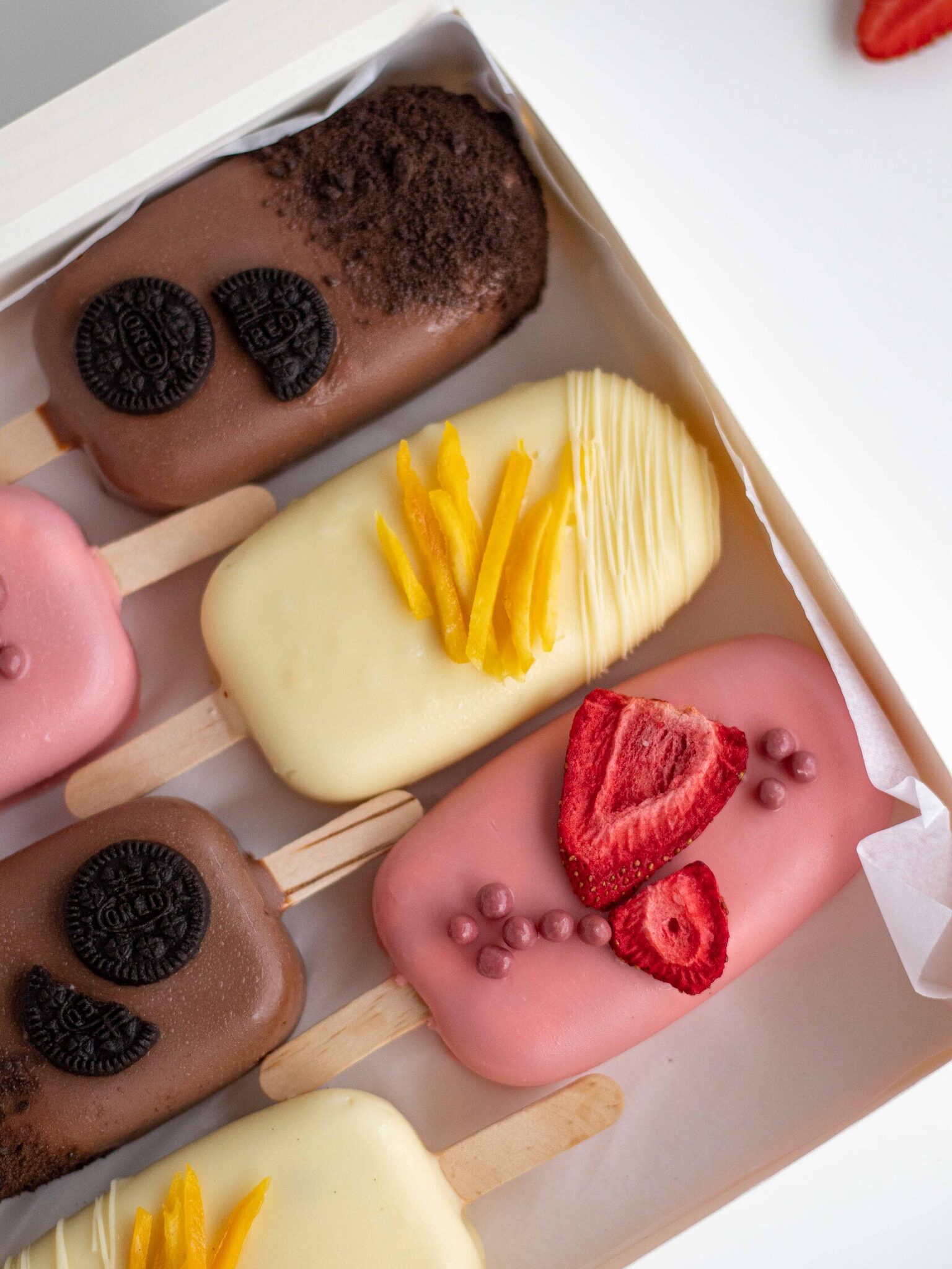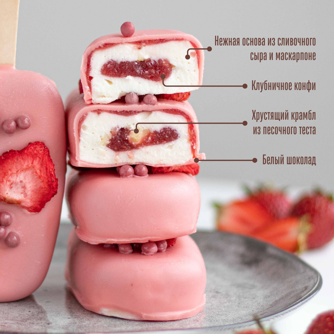 Чизкейк-эскимо на палочке - это нежнейший муссовый десерт в форме эскимо с начинкой, покрытый шоколадом. Набор состоит из 3 вкусов: Oreo, манго-маракуйя, клубника