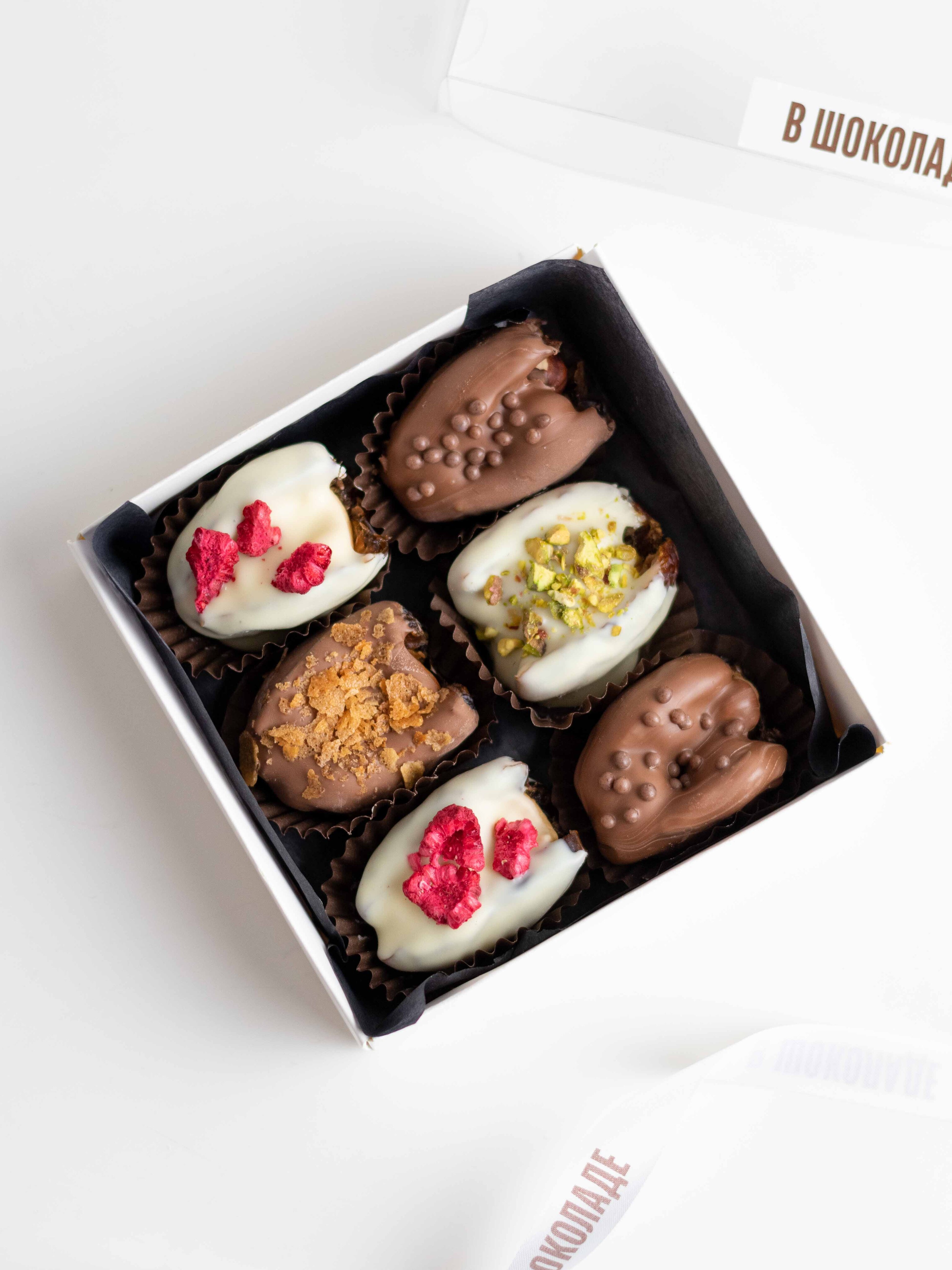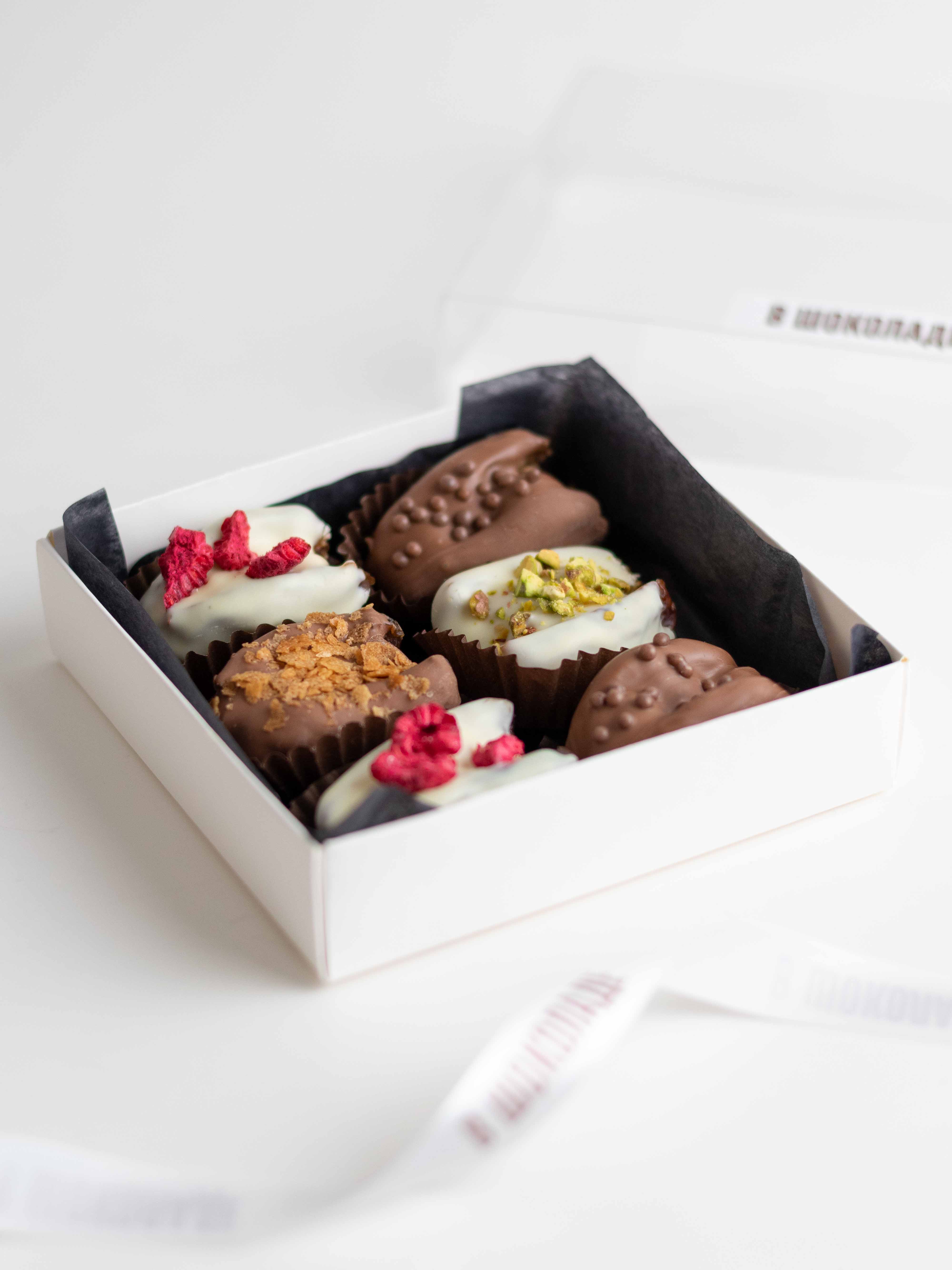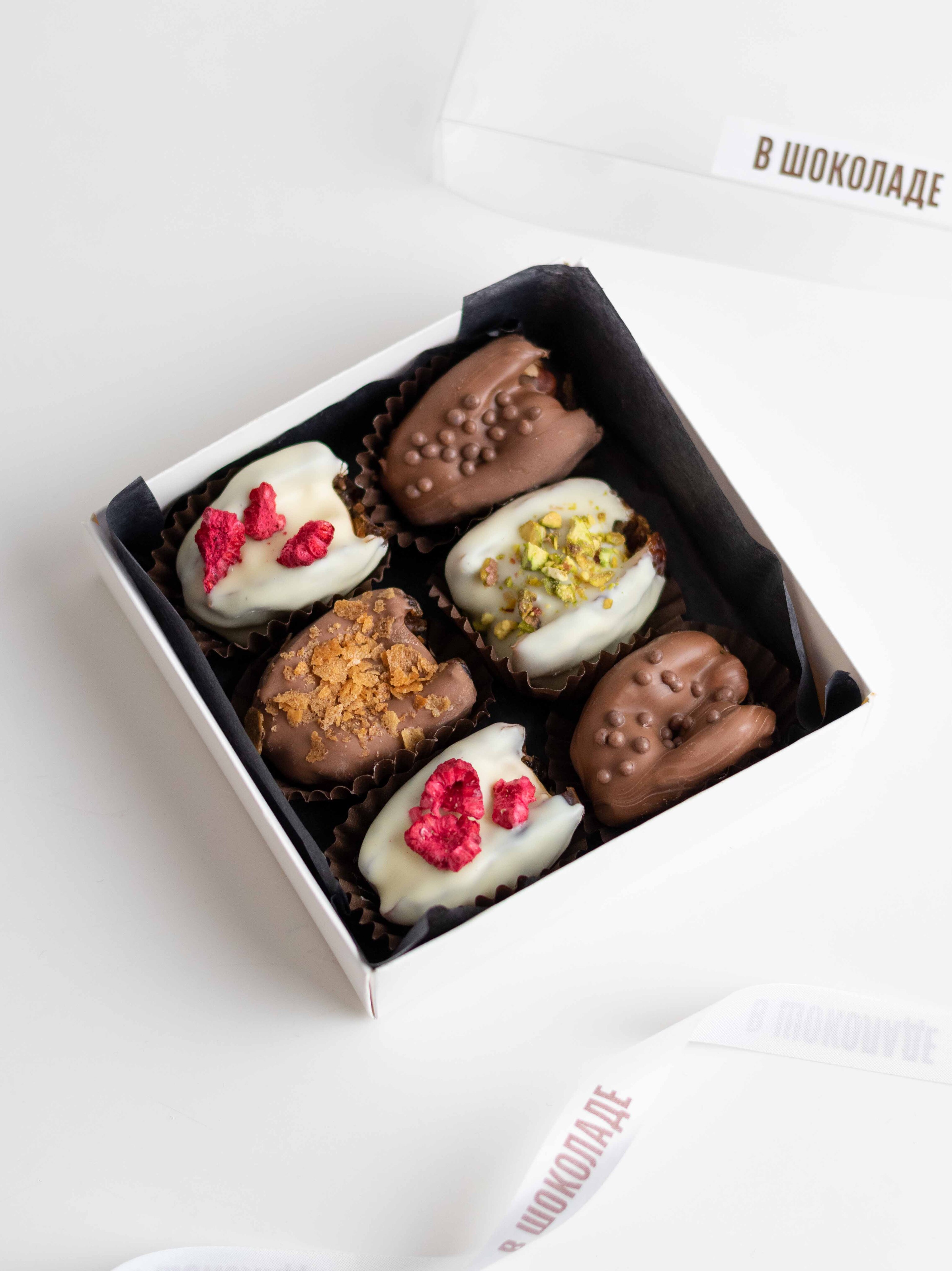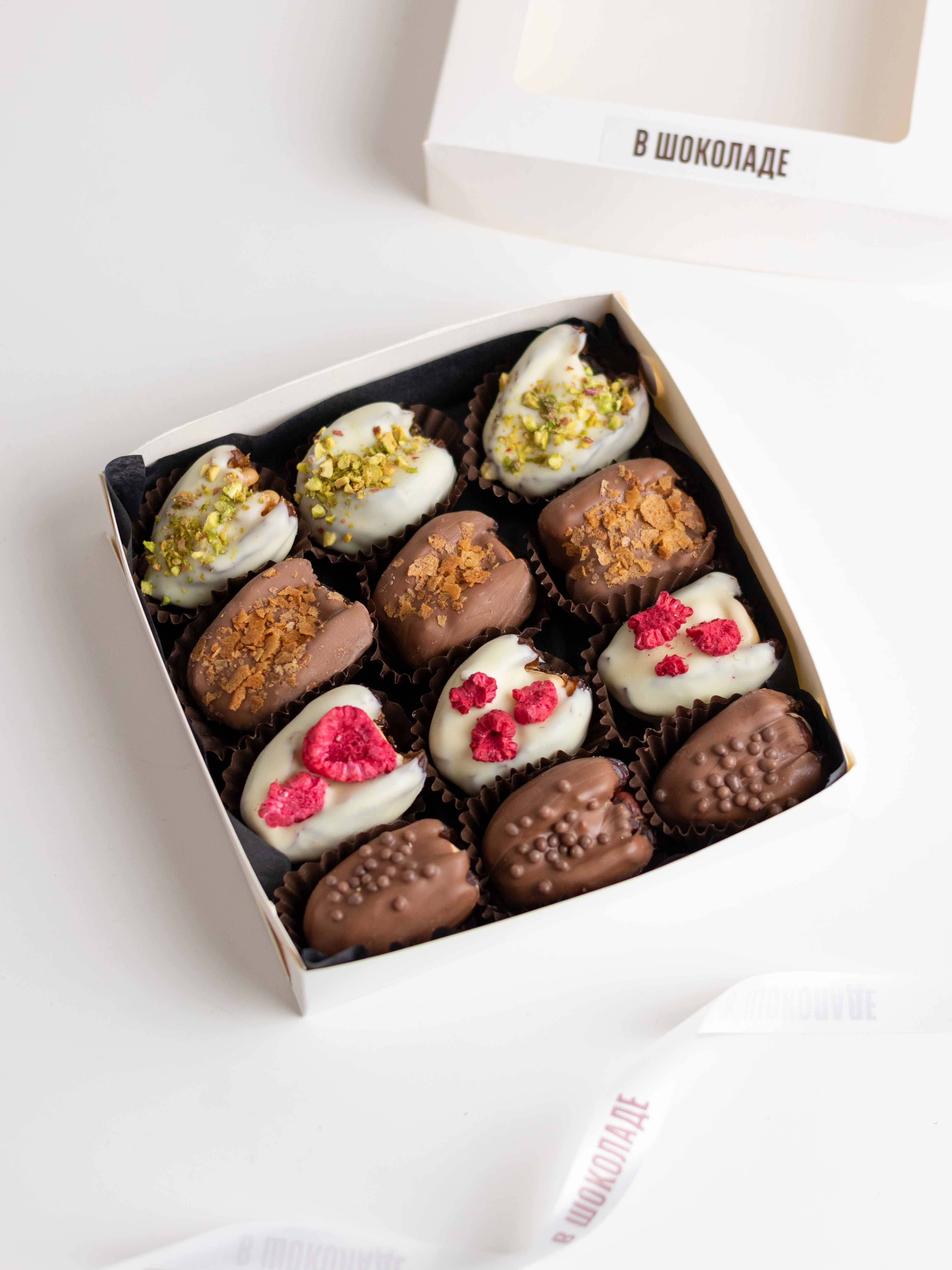 Подарочный набор фиников в шоколаде с ореховыми начинками — насыщенный десерт с разными текстурами и вкусами.