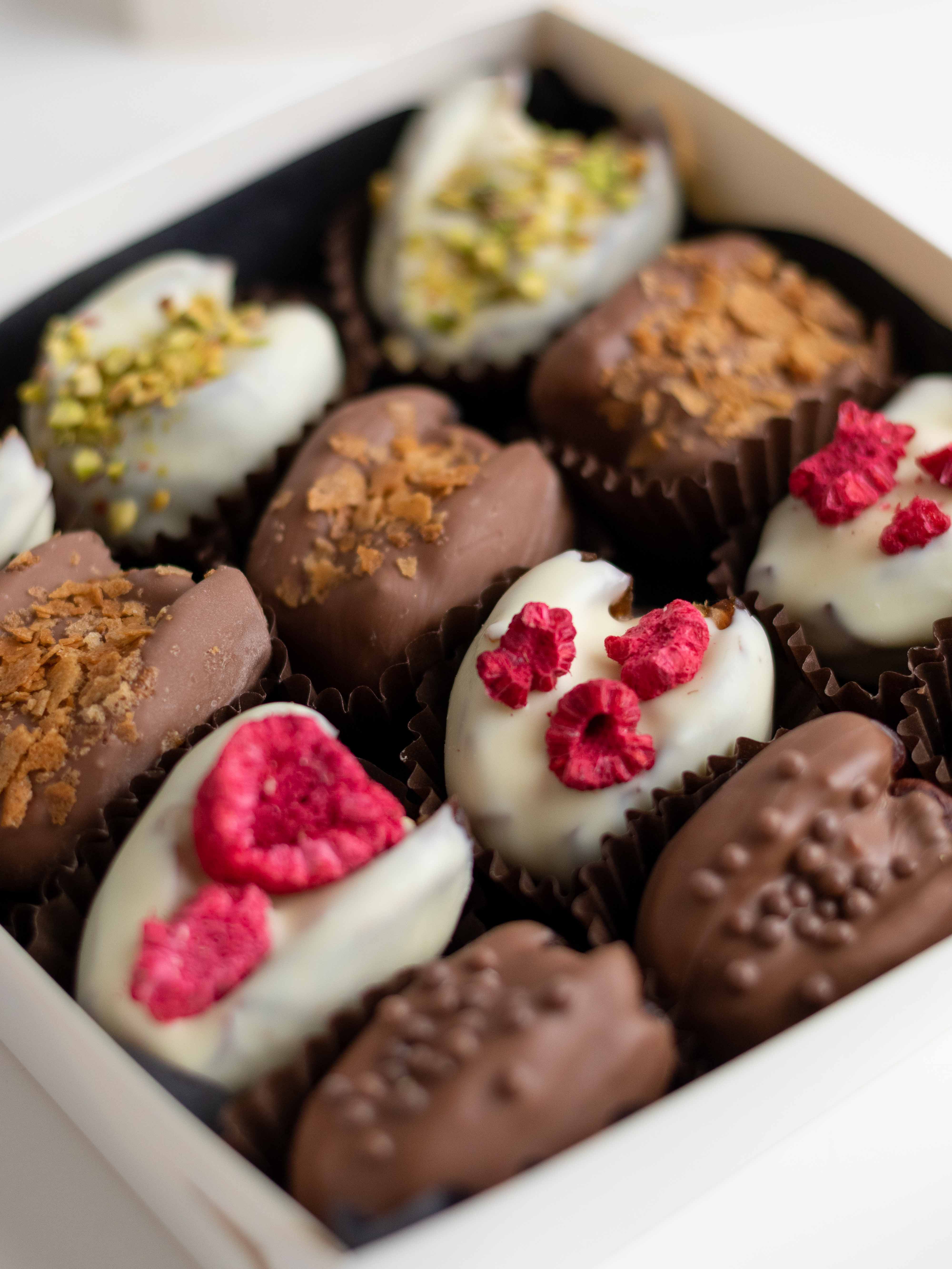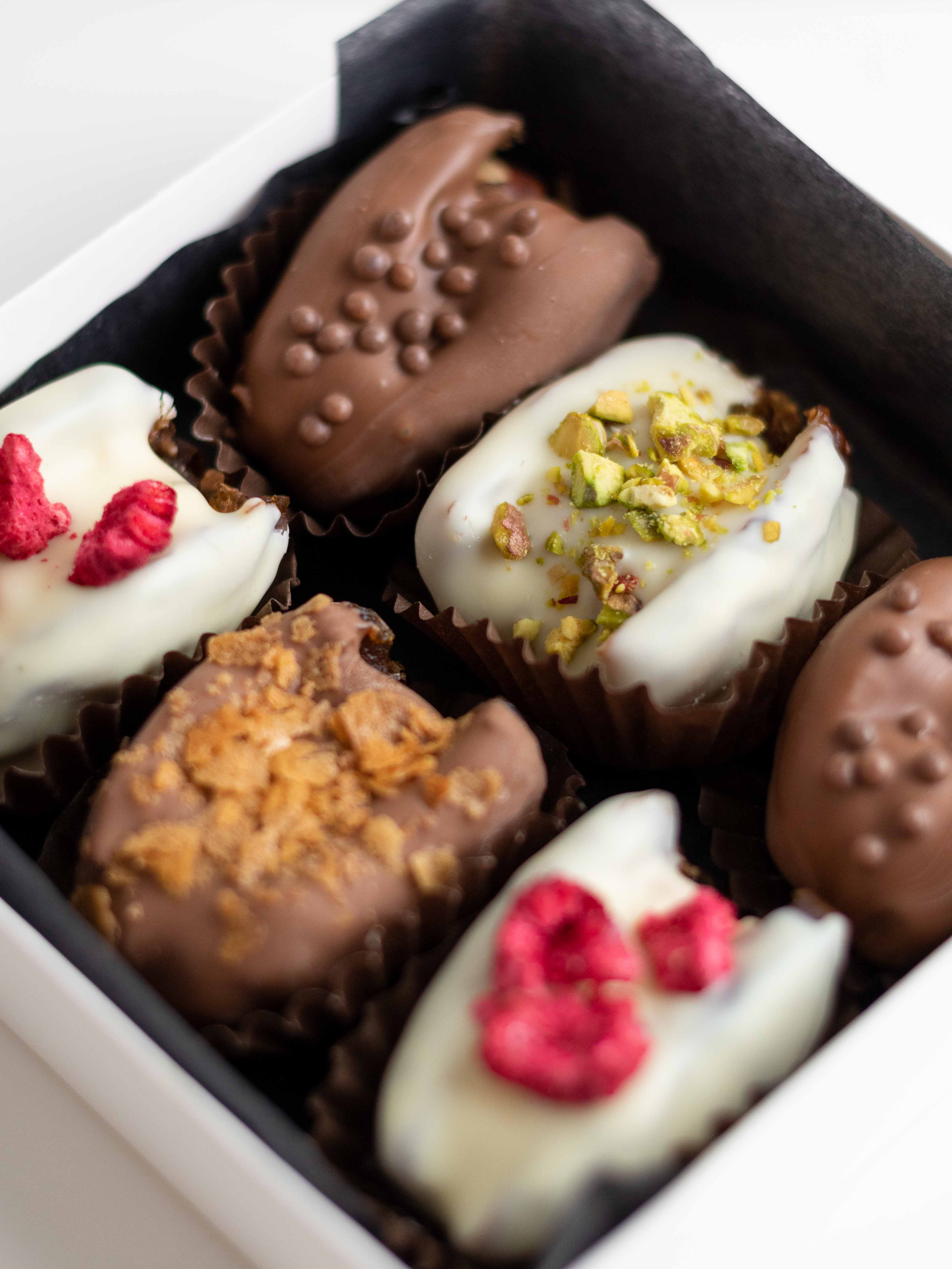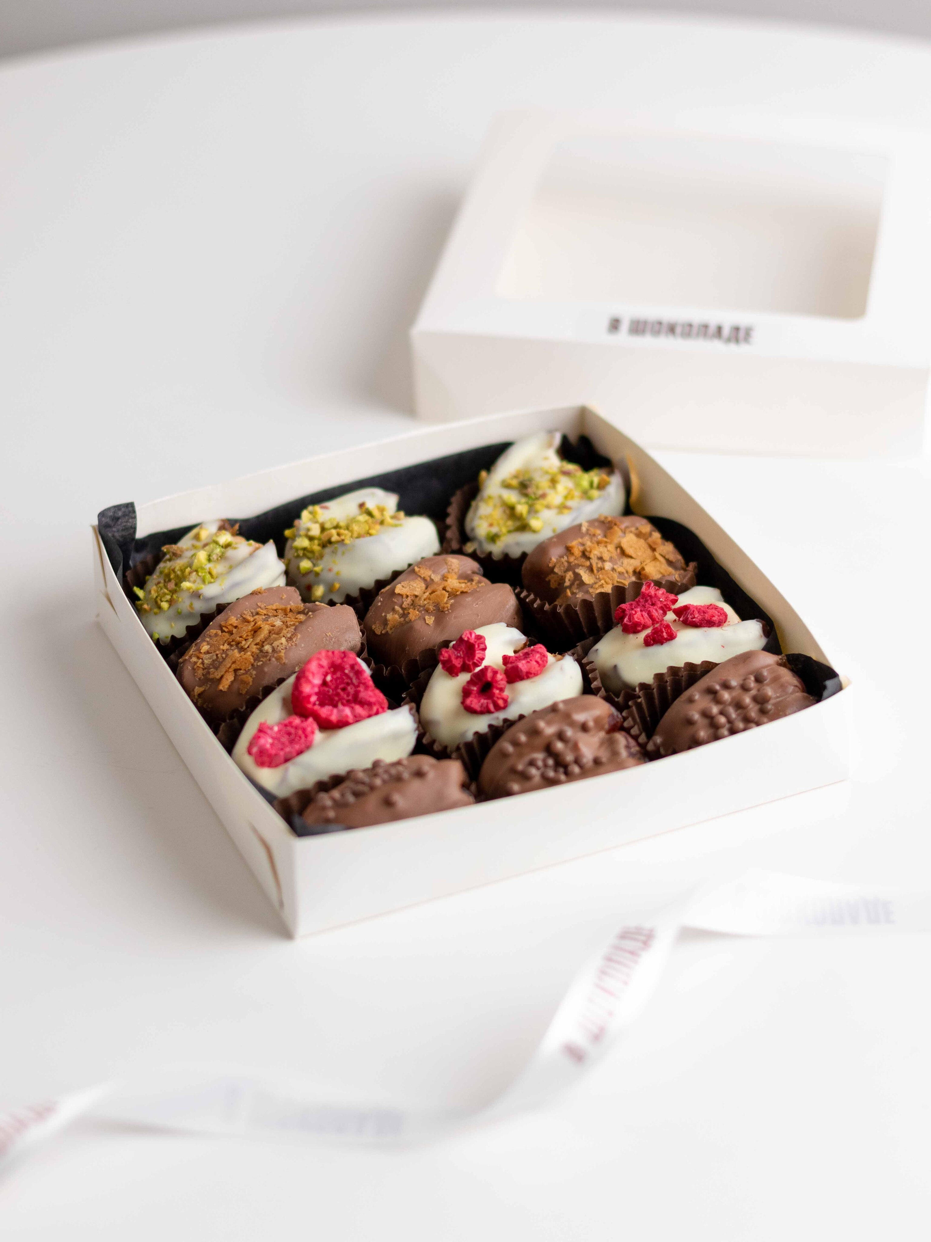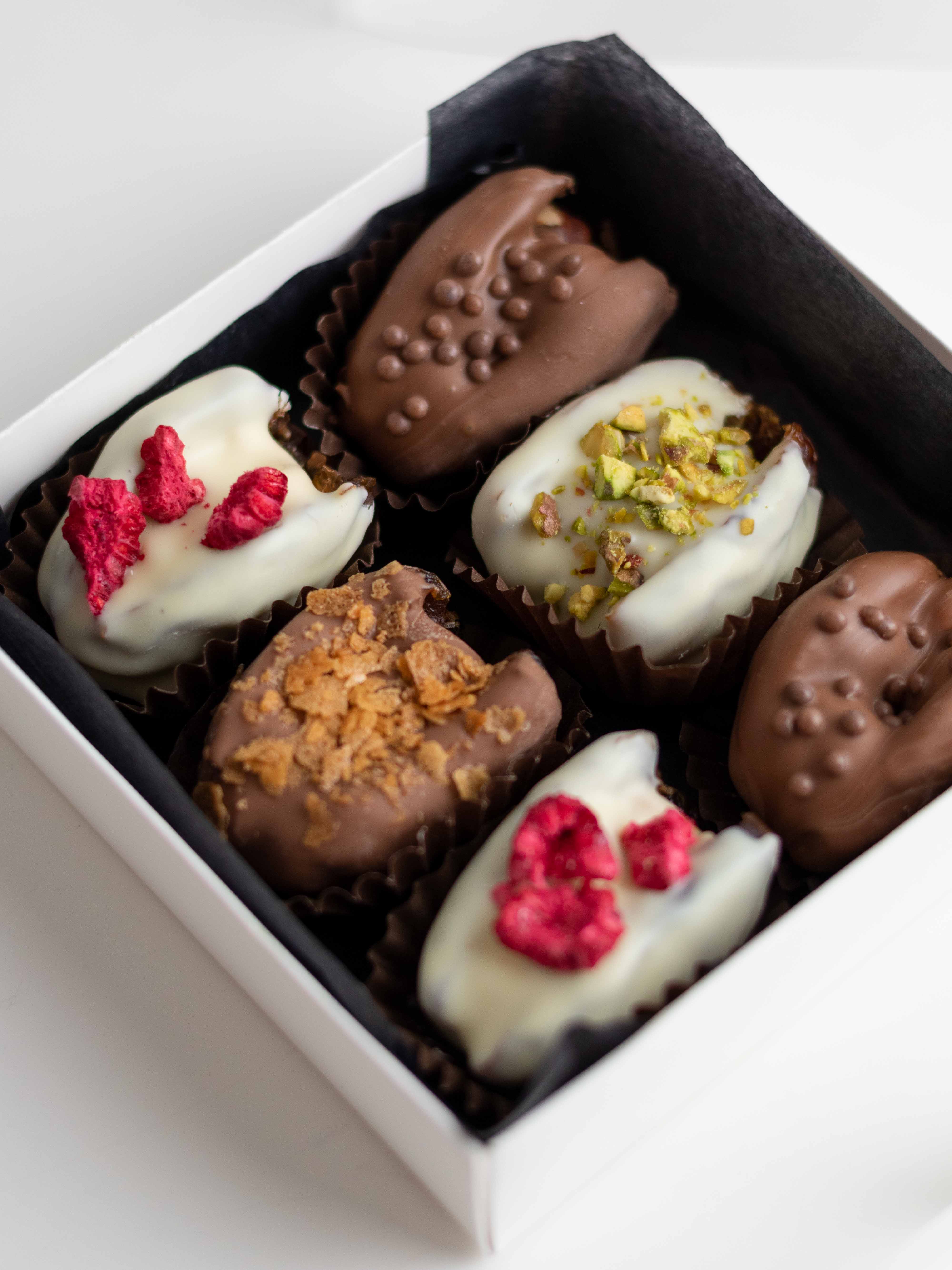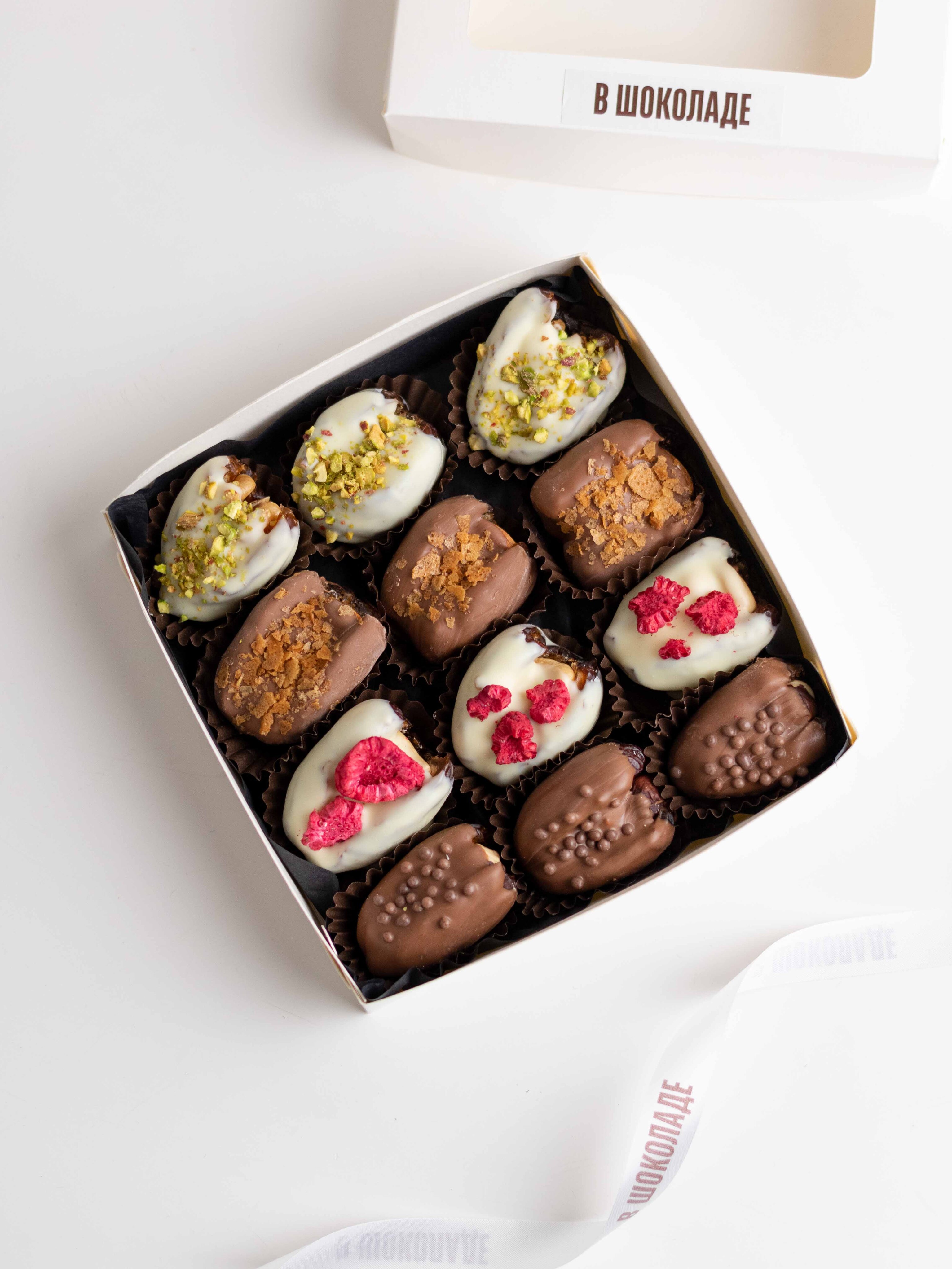 Подарочный набор фиников в шоколаде с ореховыми начинками — насыщенный десерт с разными текстурами и вкусами.