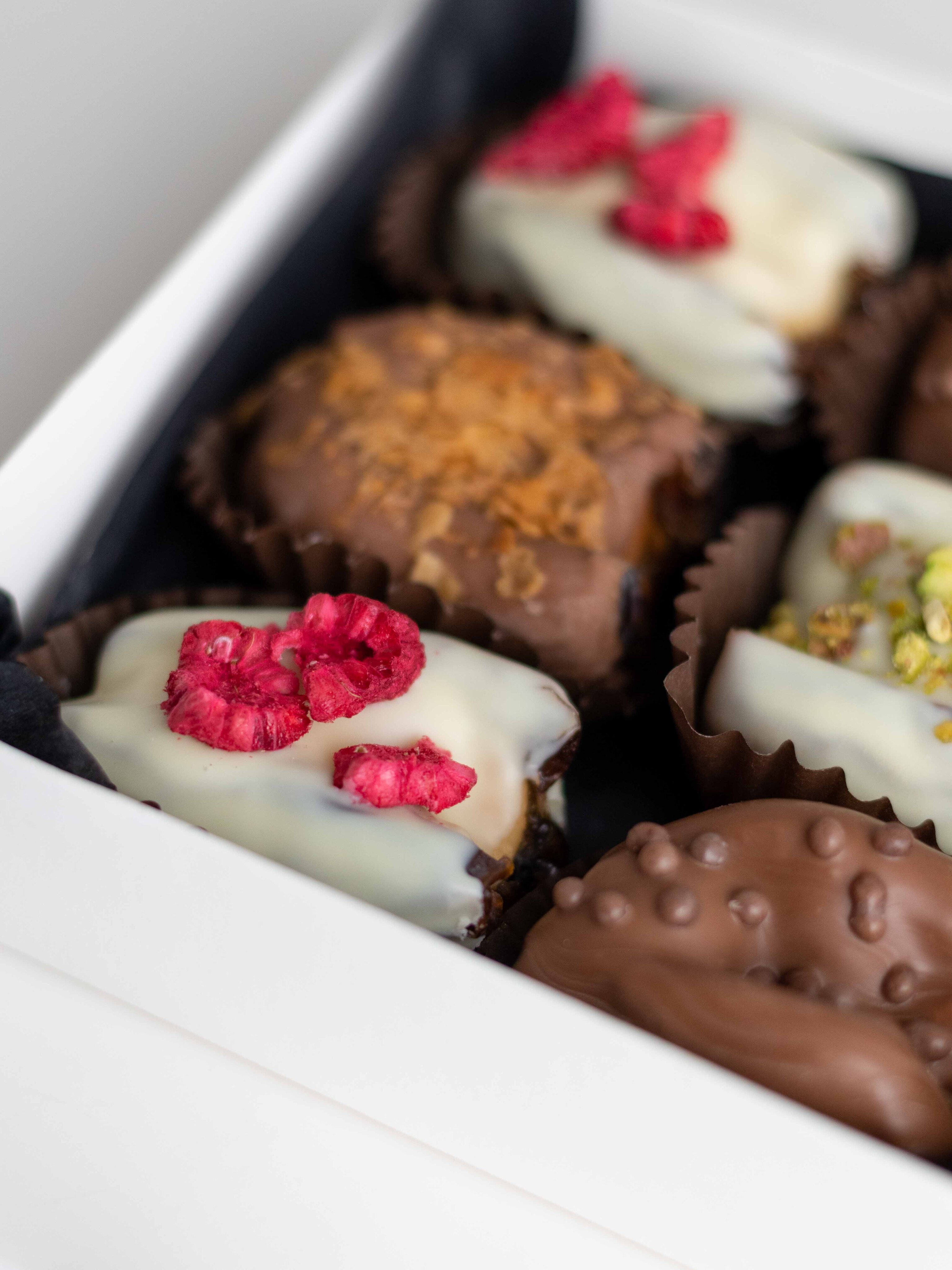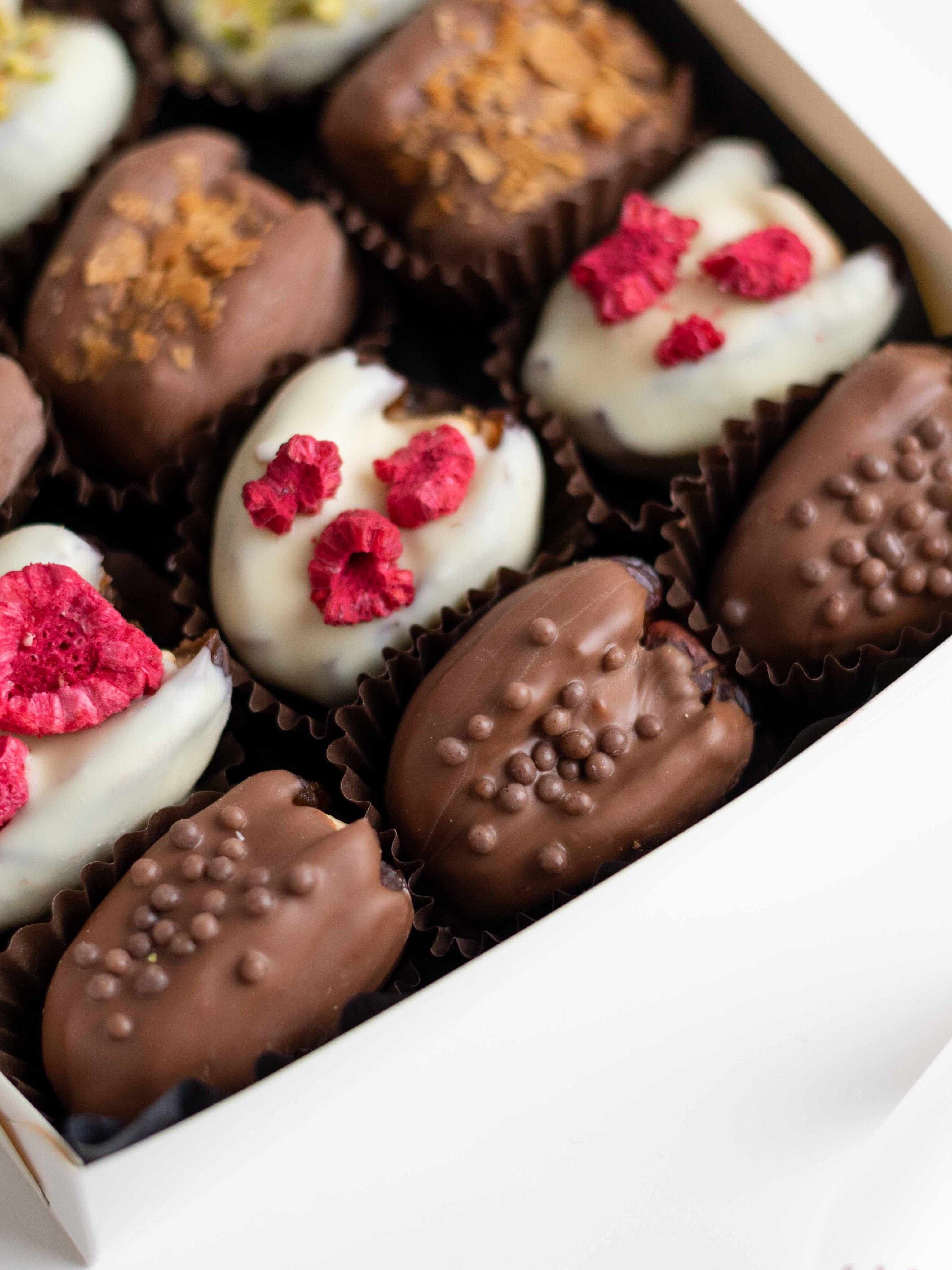 — финики с кешью в белом шоколаде с сушёной малиной