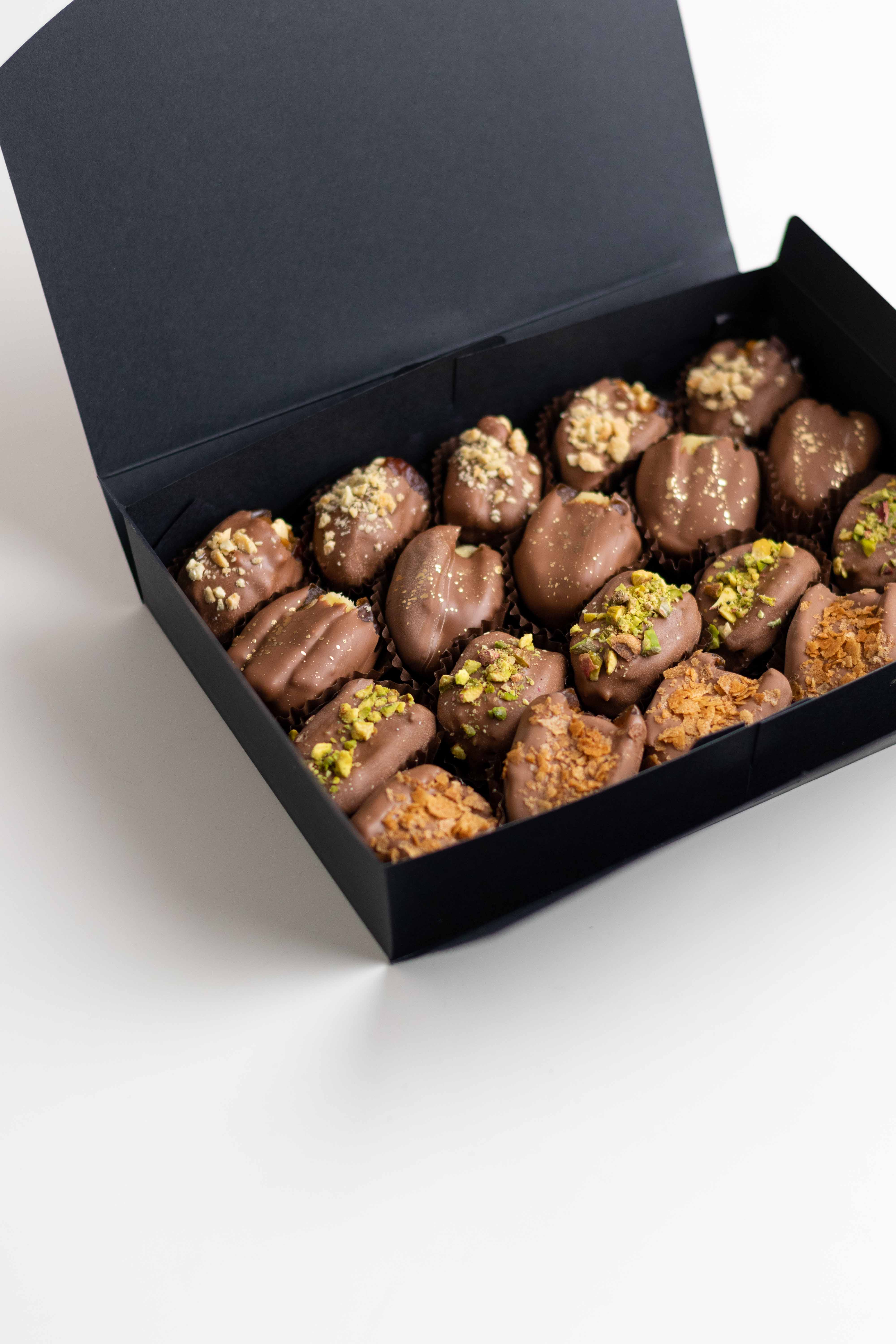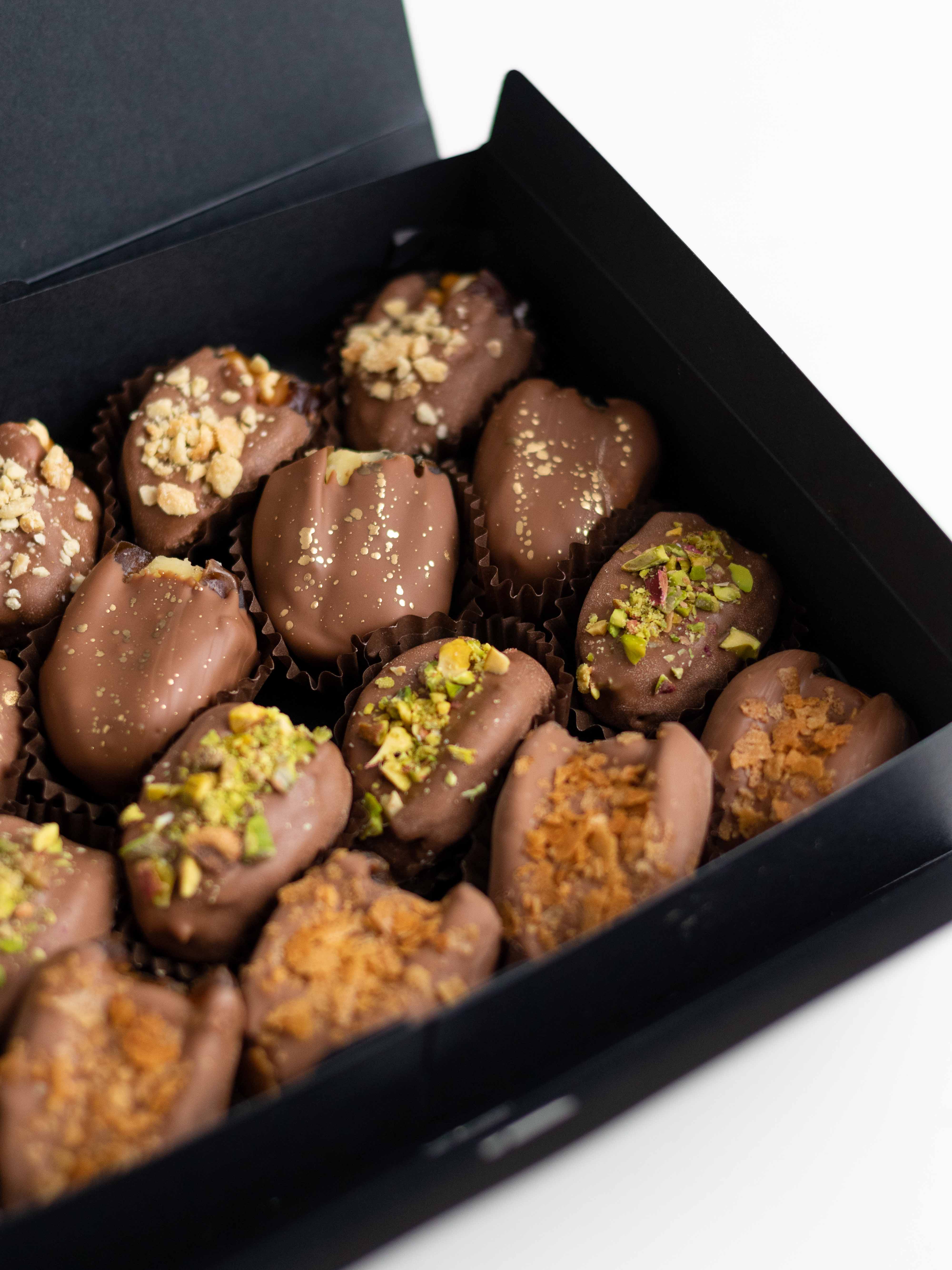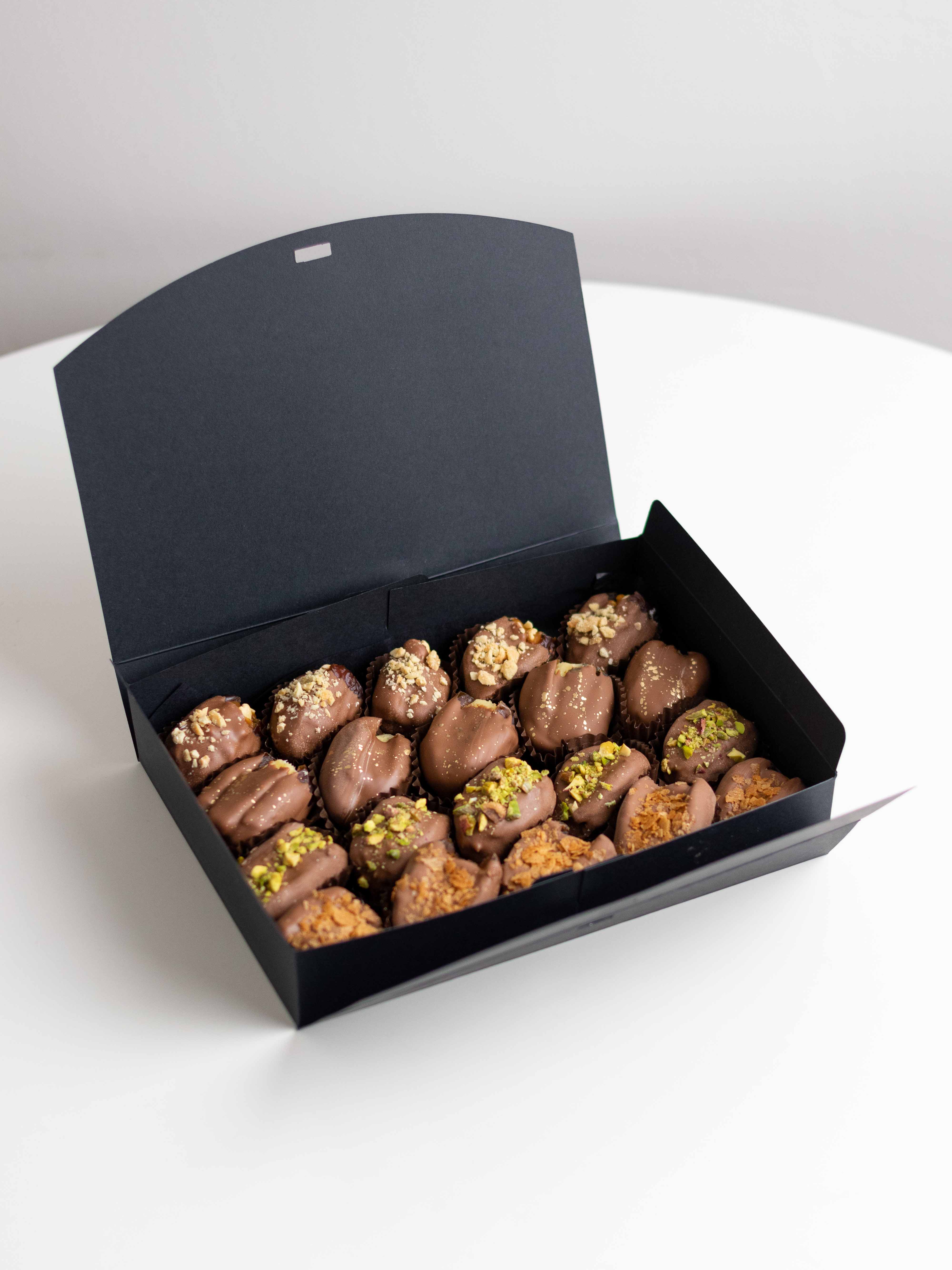Сочетание сладости фиников, нежного шоколада и разнообразных текстур делает этот набор по-настоящему насыщенным и запоминающимся. Идеально подойдёт в качестве подарка или десерта, который хочется смаковать!