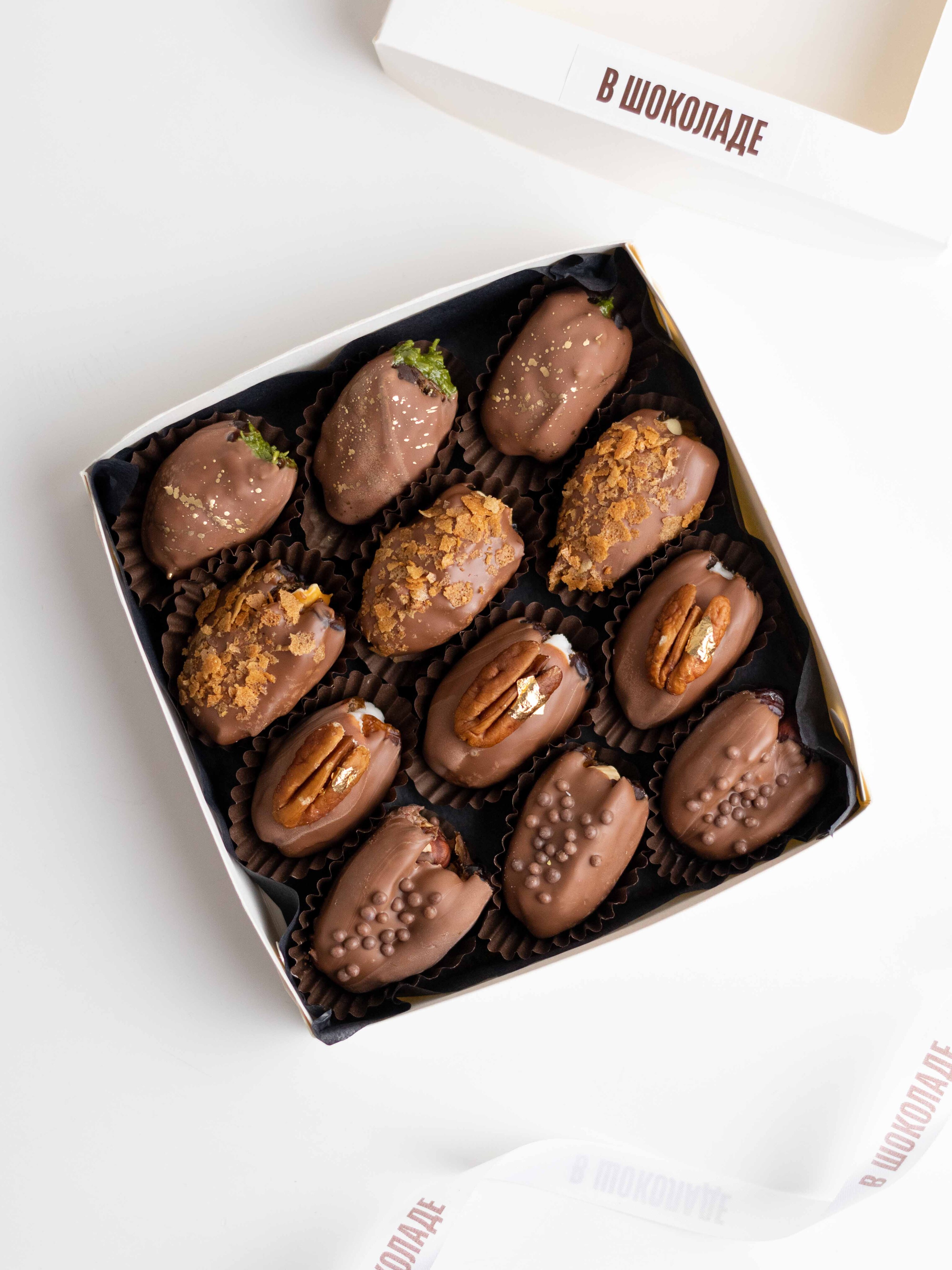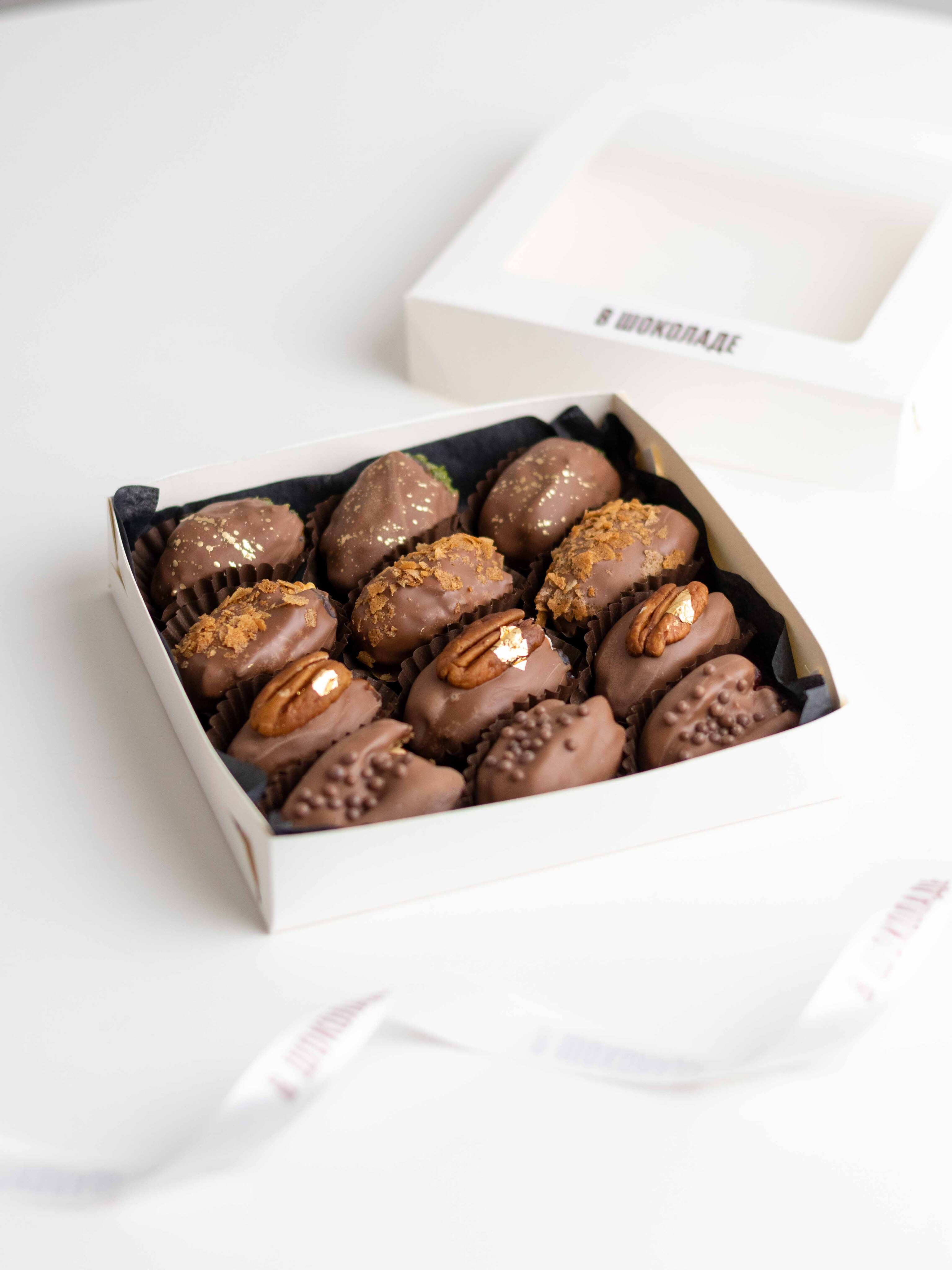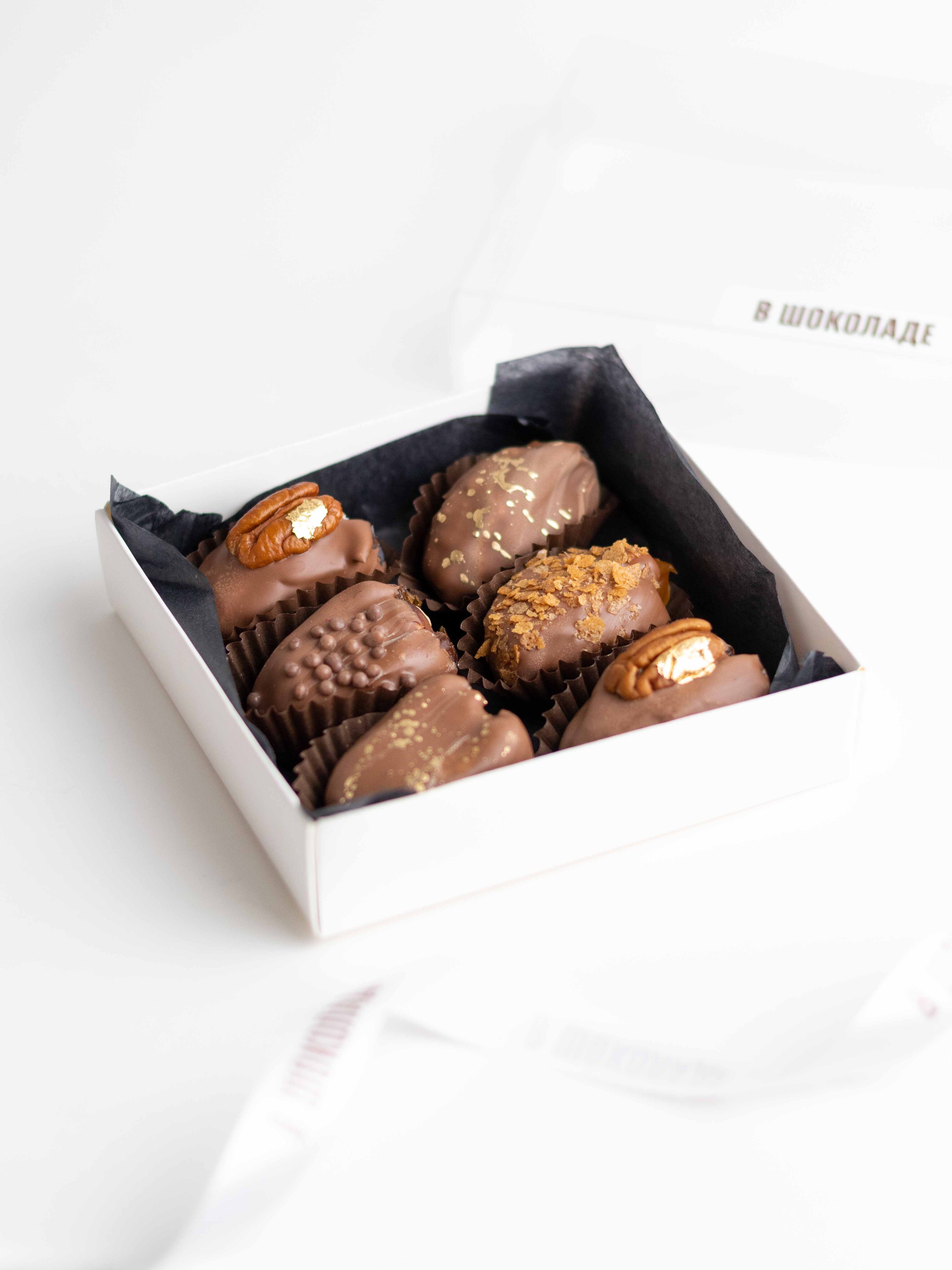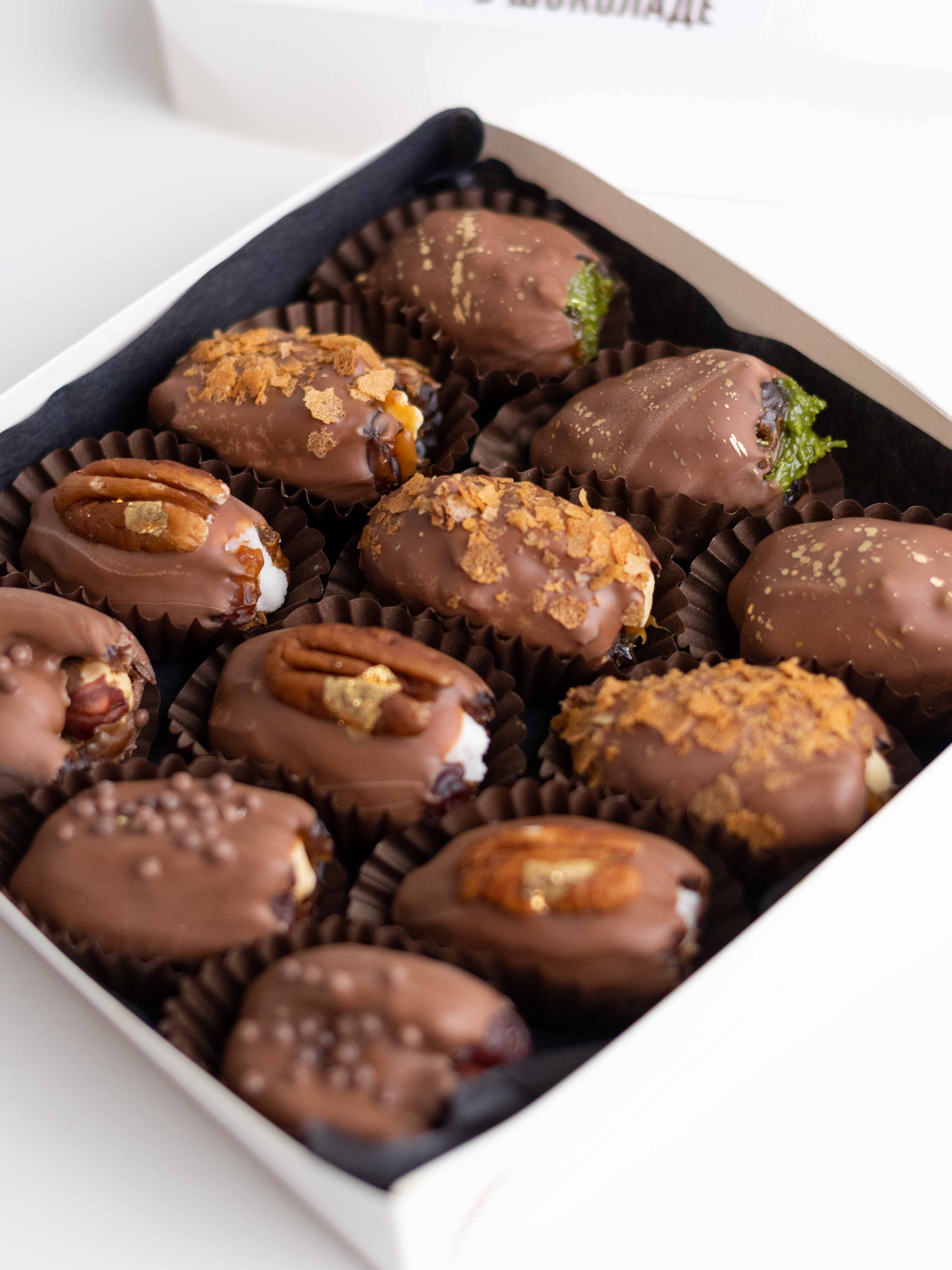 Изысканный набор фиников в молочном шоколаде с авторскими начинками — десерт, в котором каждая конфета раскрывается по-своему!