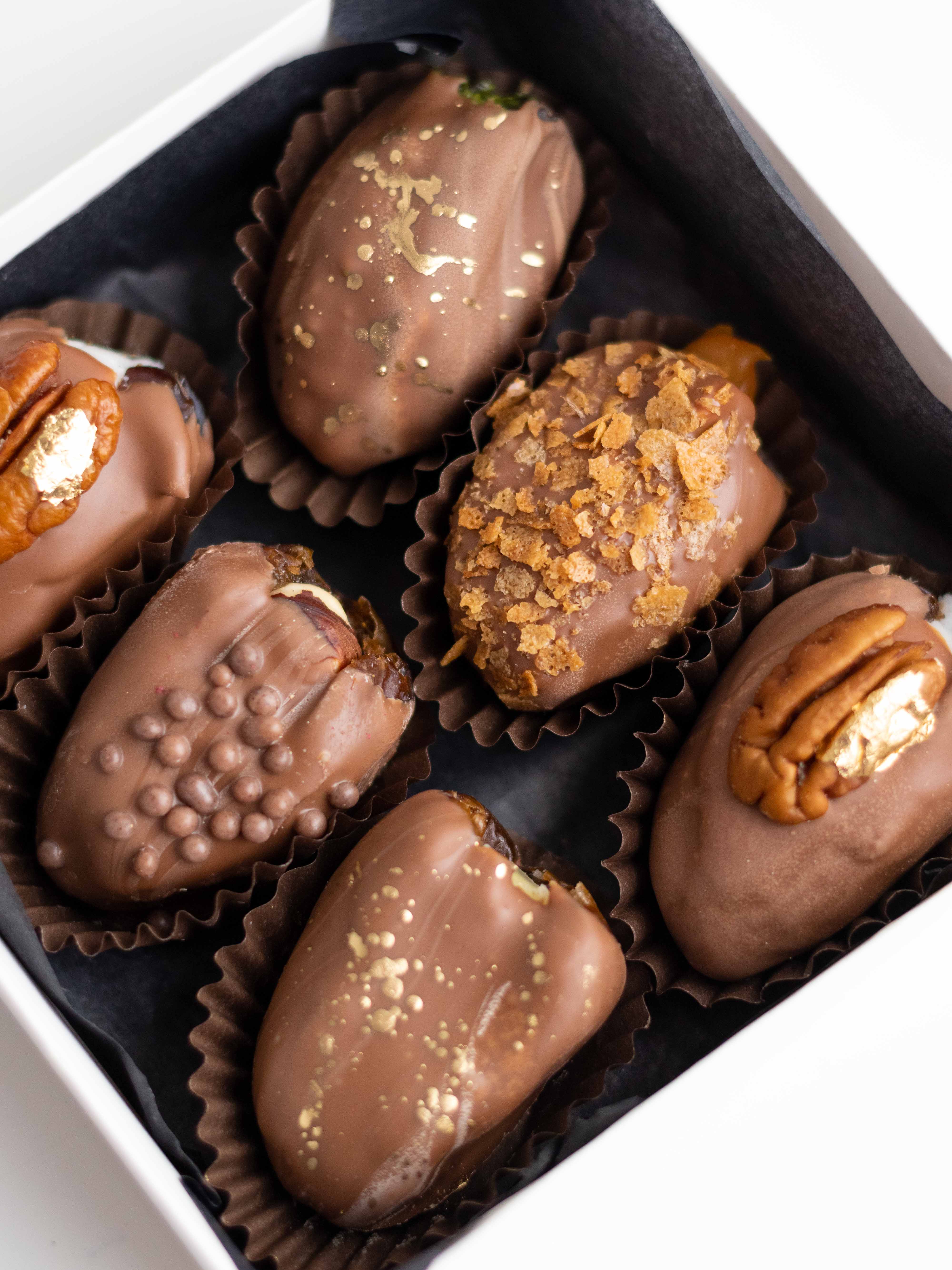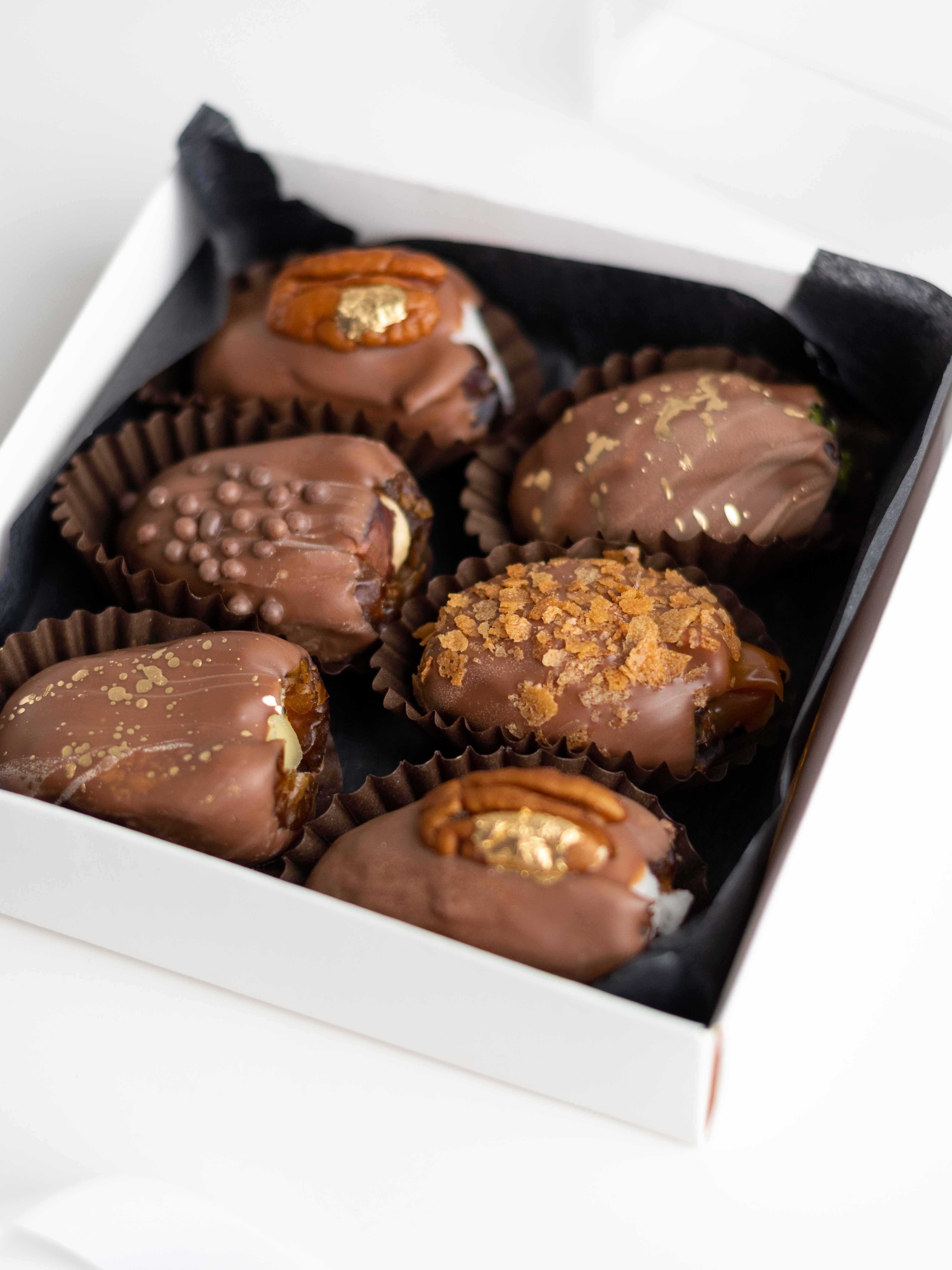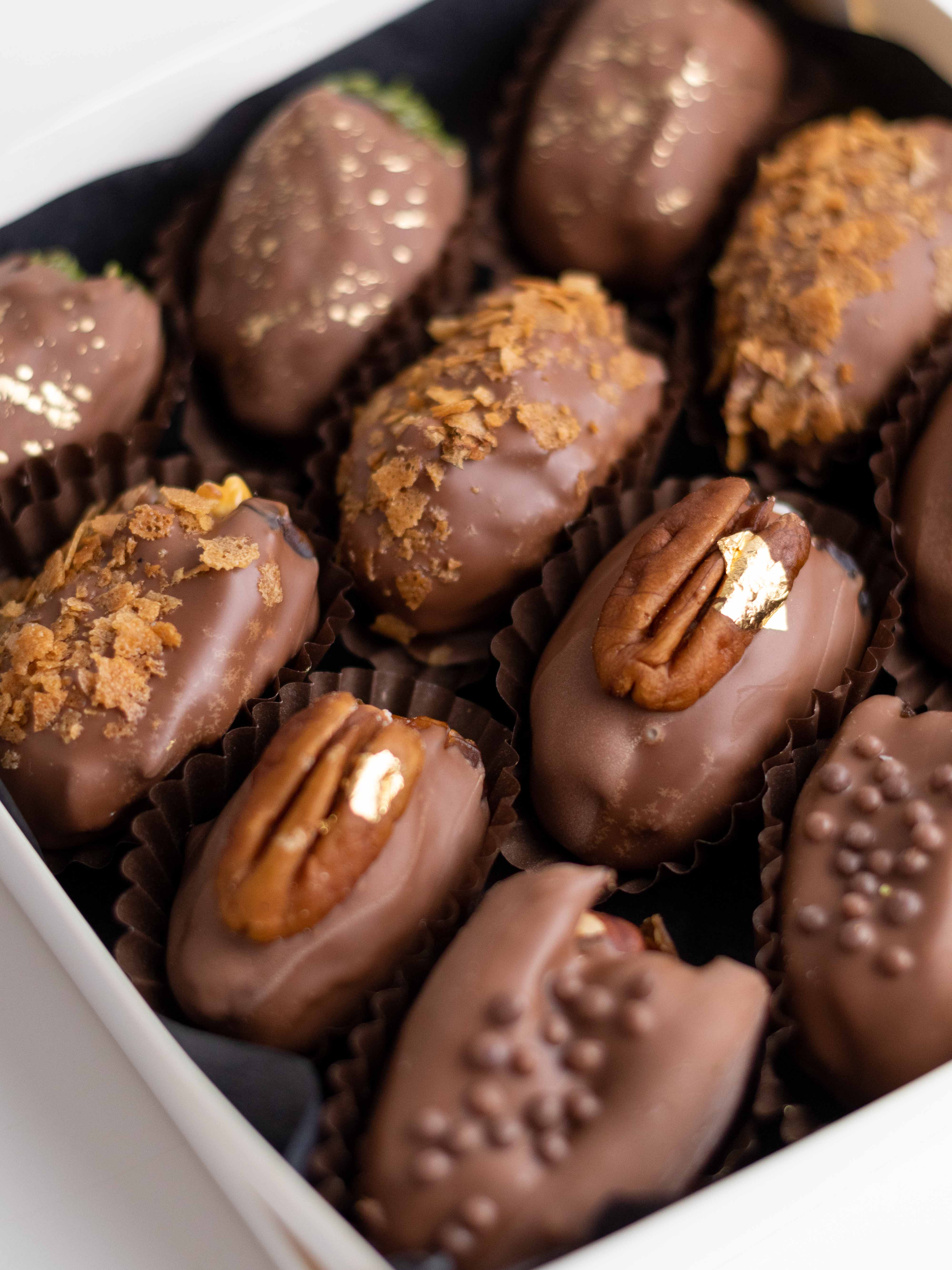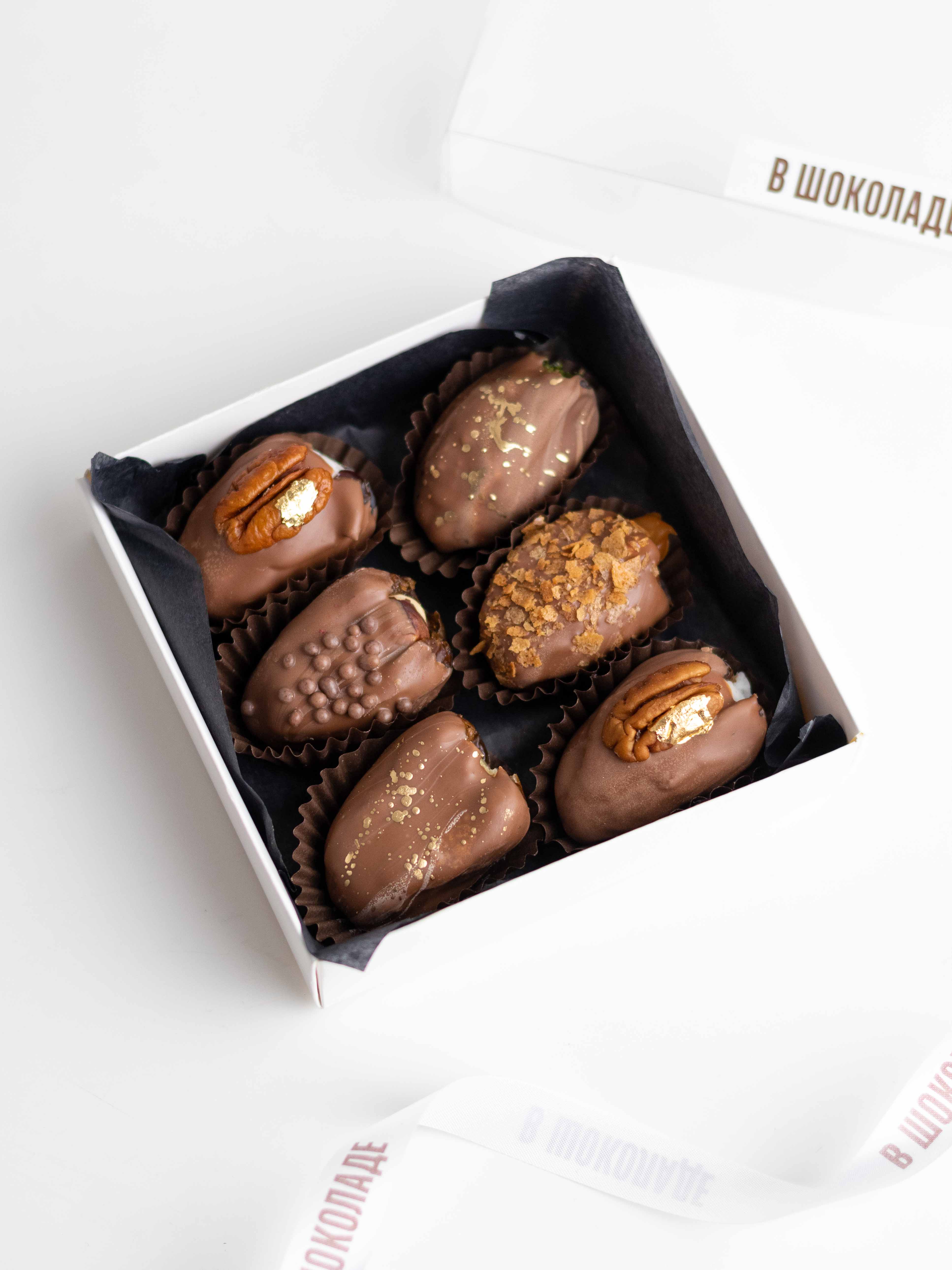 Изысканный набор фиников в молочном шоколаде с авторскими начинками — десерт, в котором каждая конфета раскрывается по-своему!