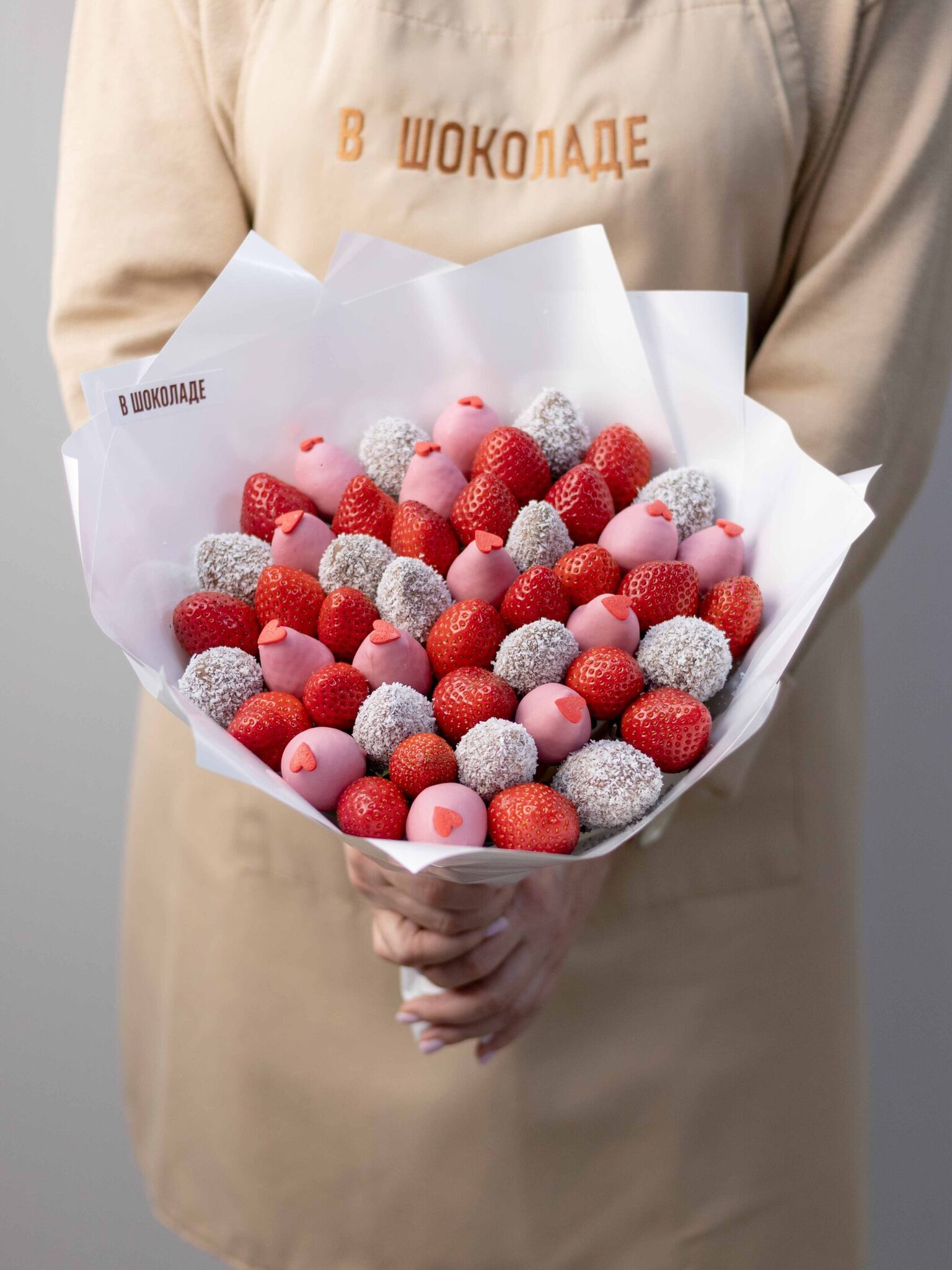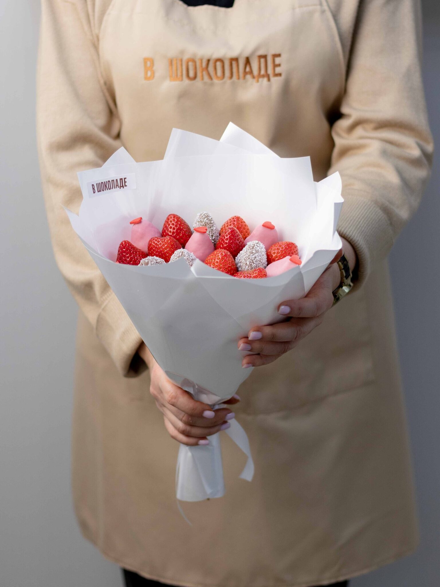 В своих композициях мы используем только свежие ягоды и натуральный бельгийский шоколад известной марки Callebaut.