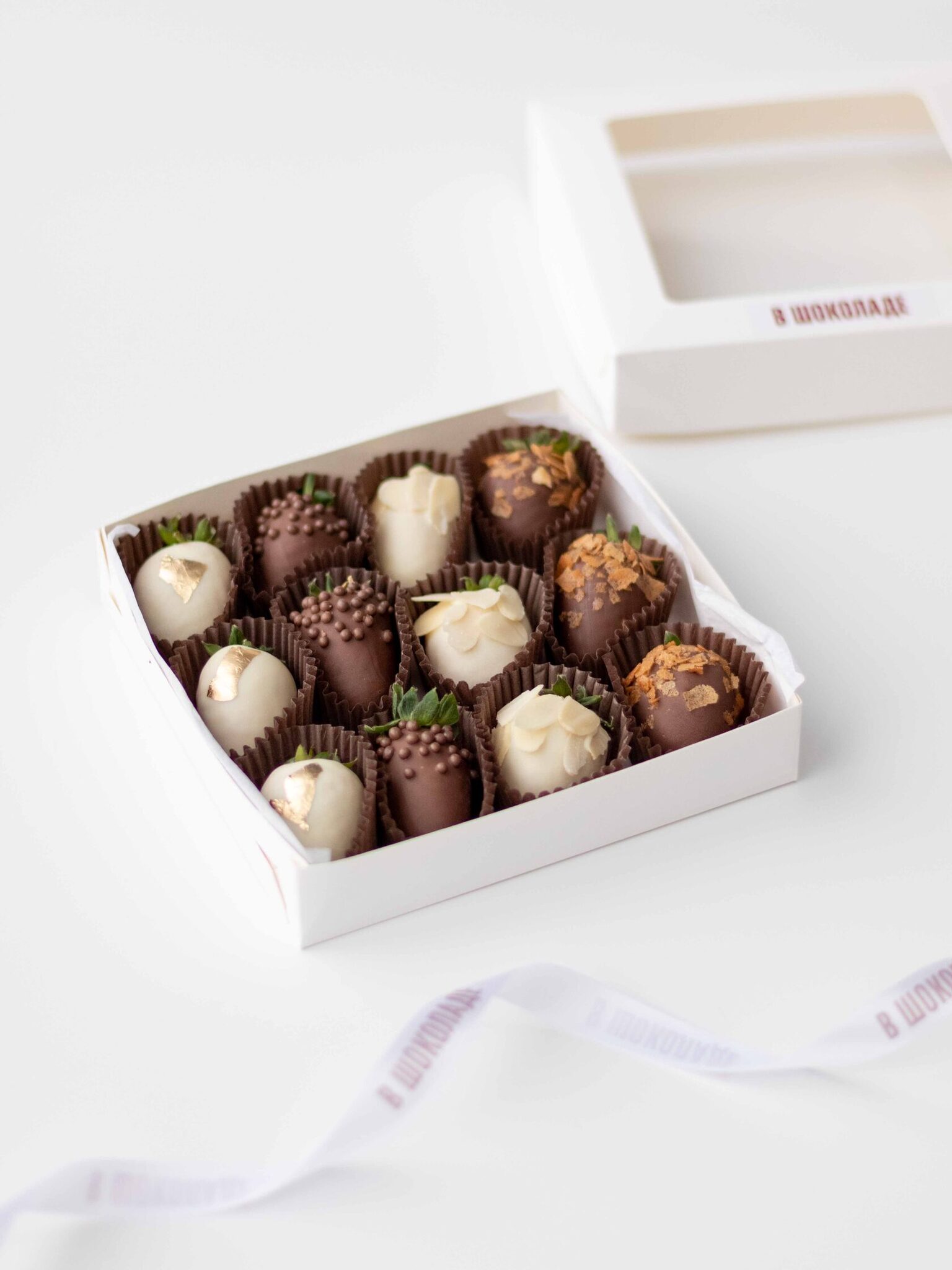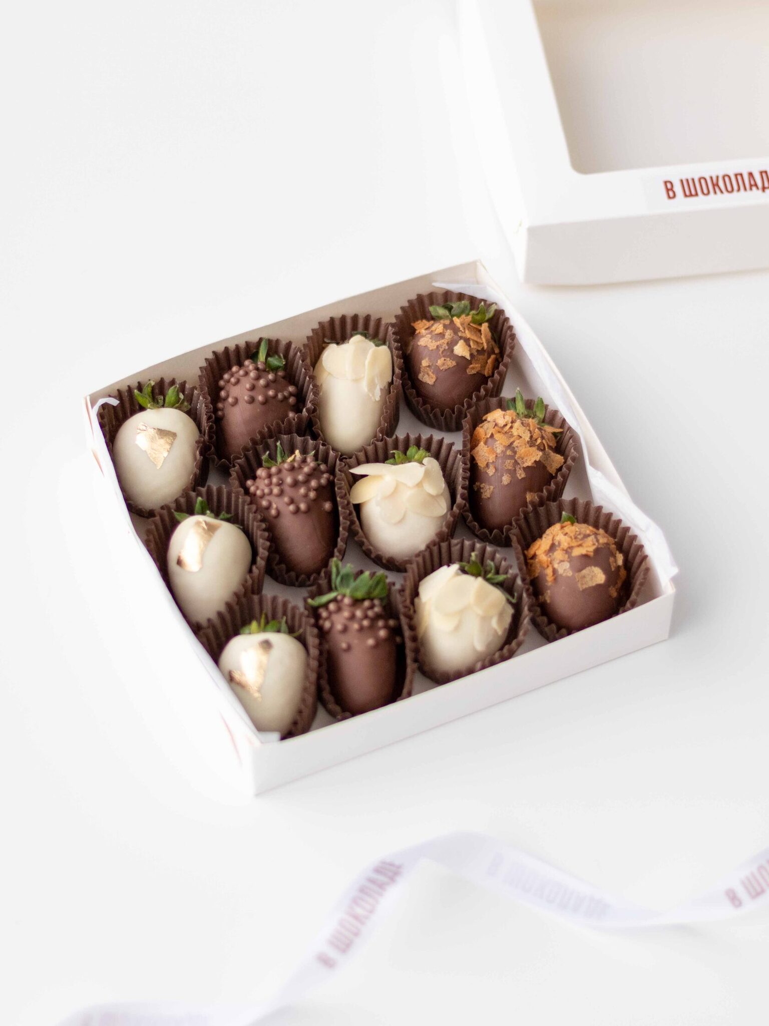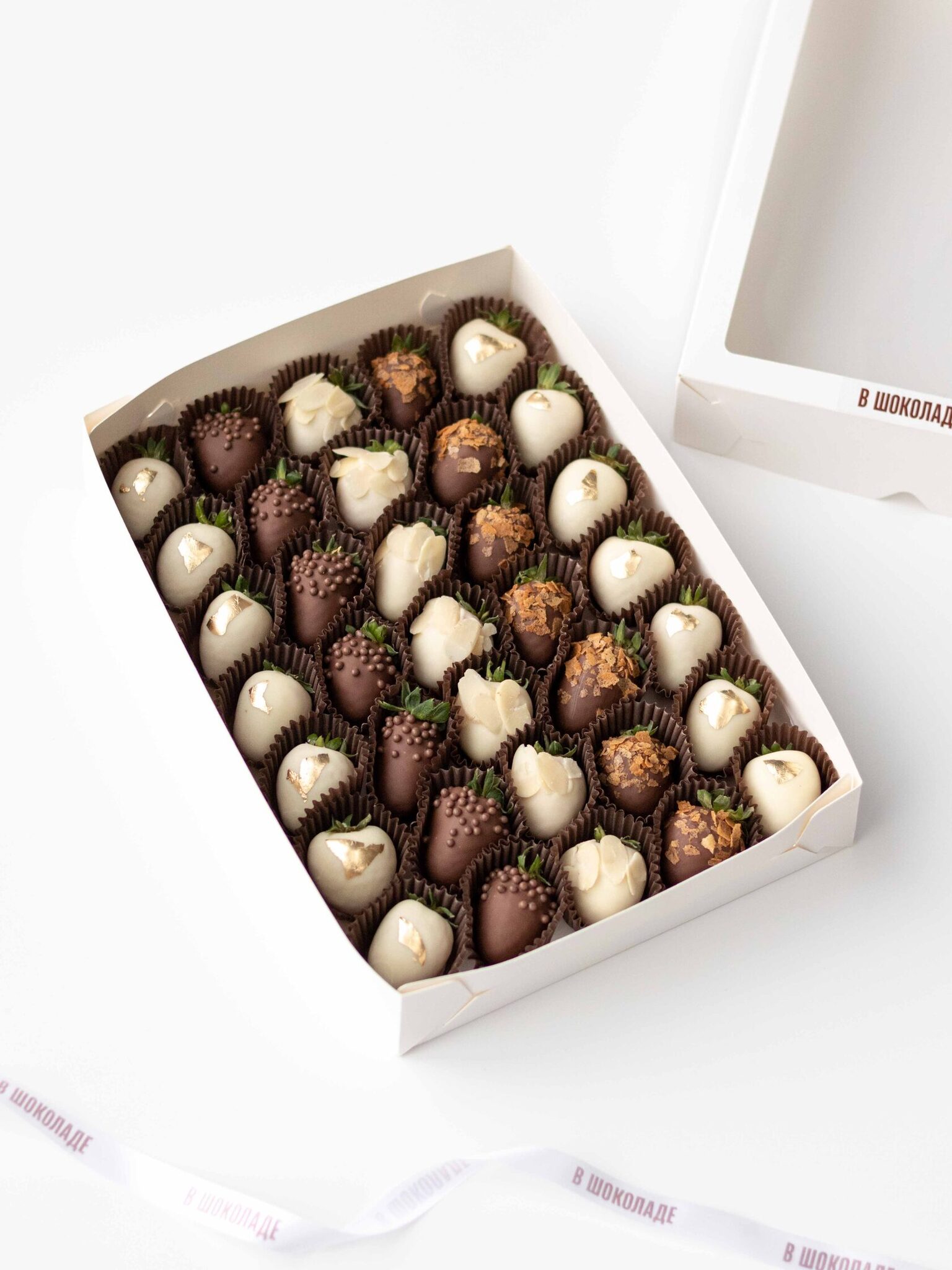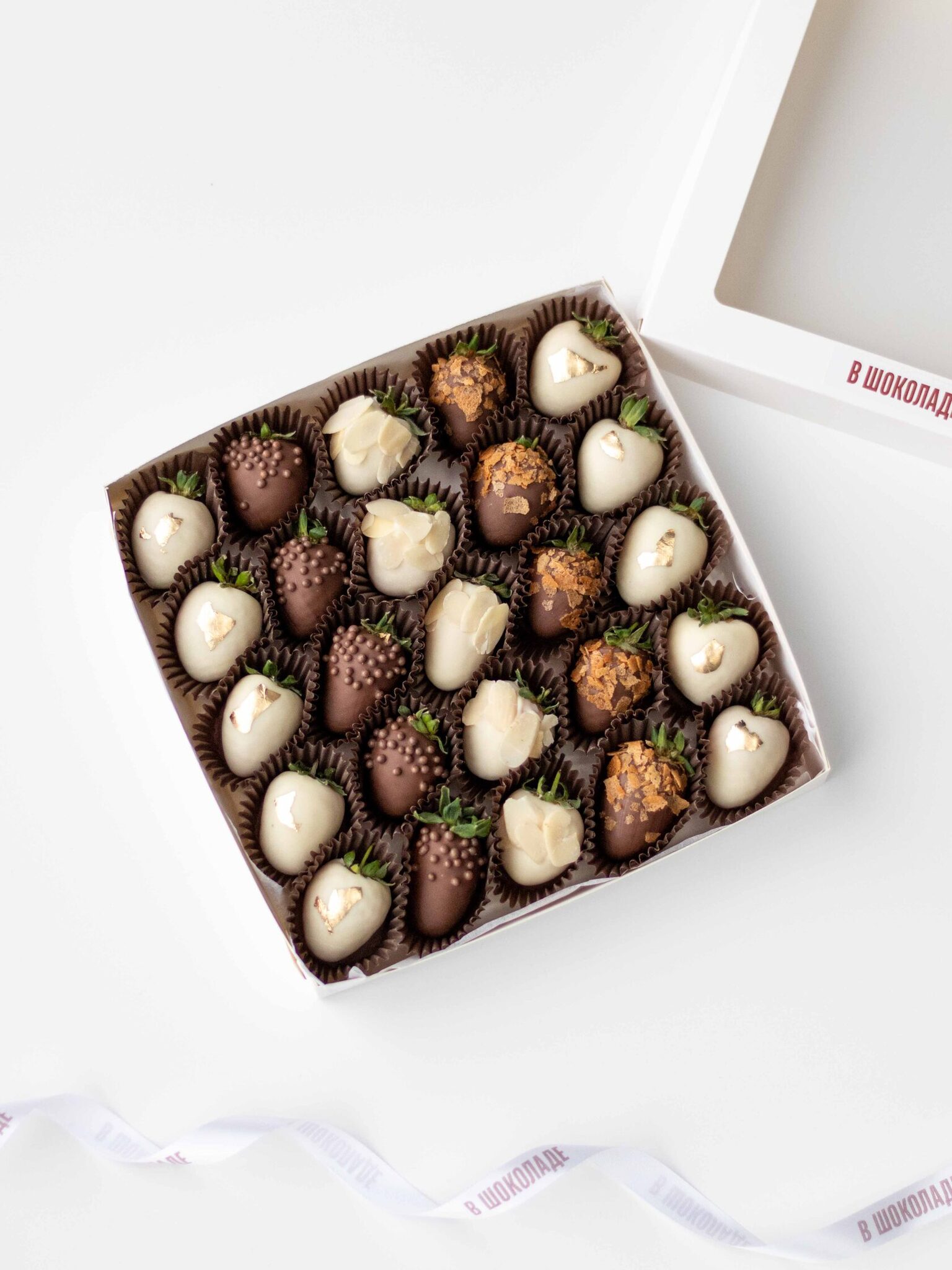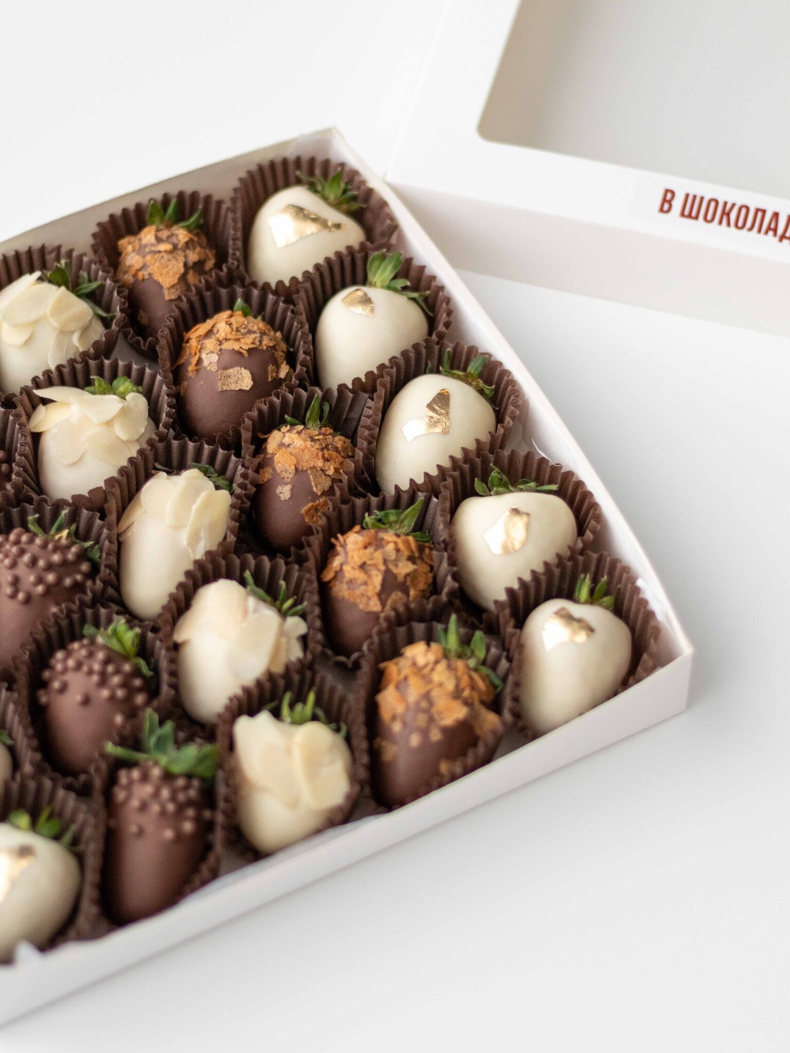 Клубника свежая отборная⁣⁣⁣, Шоколад белый, Шоколад молочный, Вафельная крошка карамелизированная, Золото сусальное пищевое, Криспи шарики рисовые в шоколаде, Миндальные лепестки