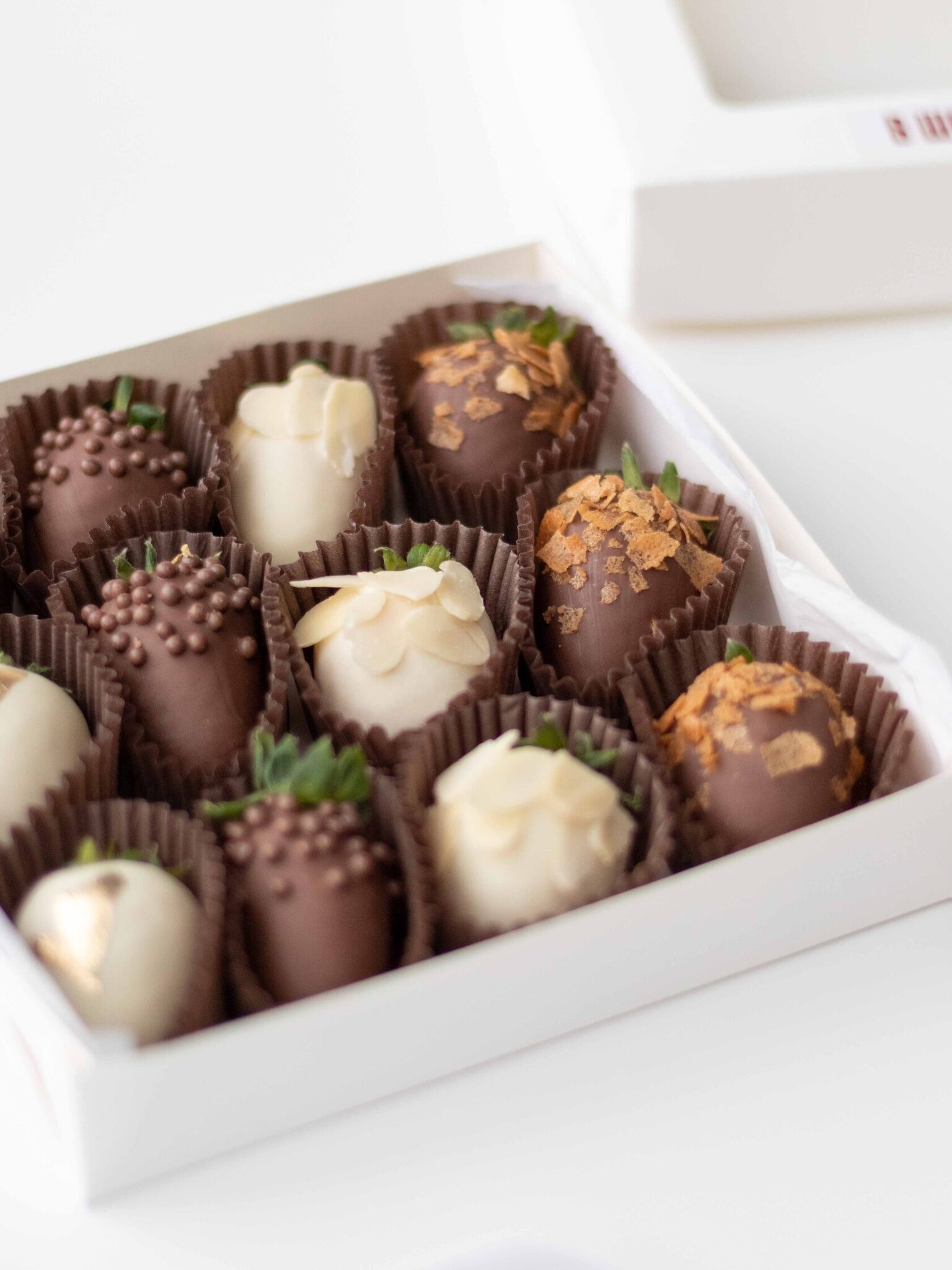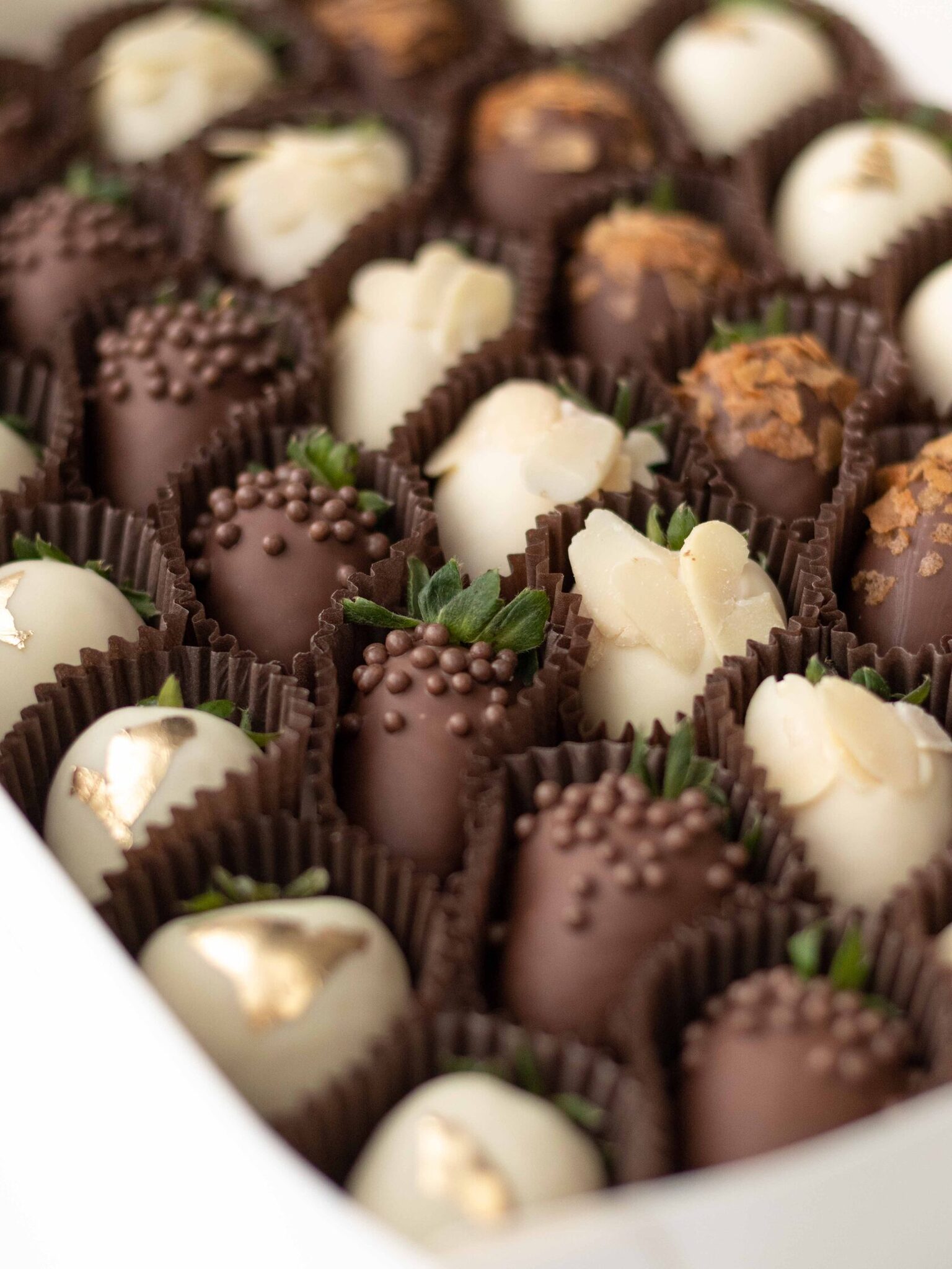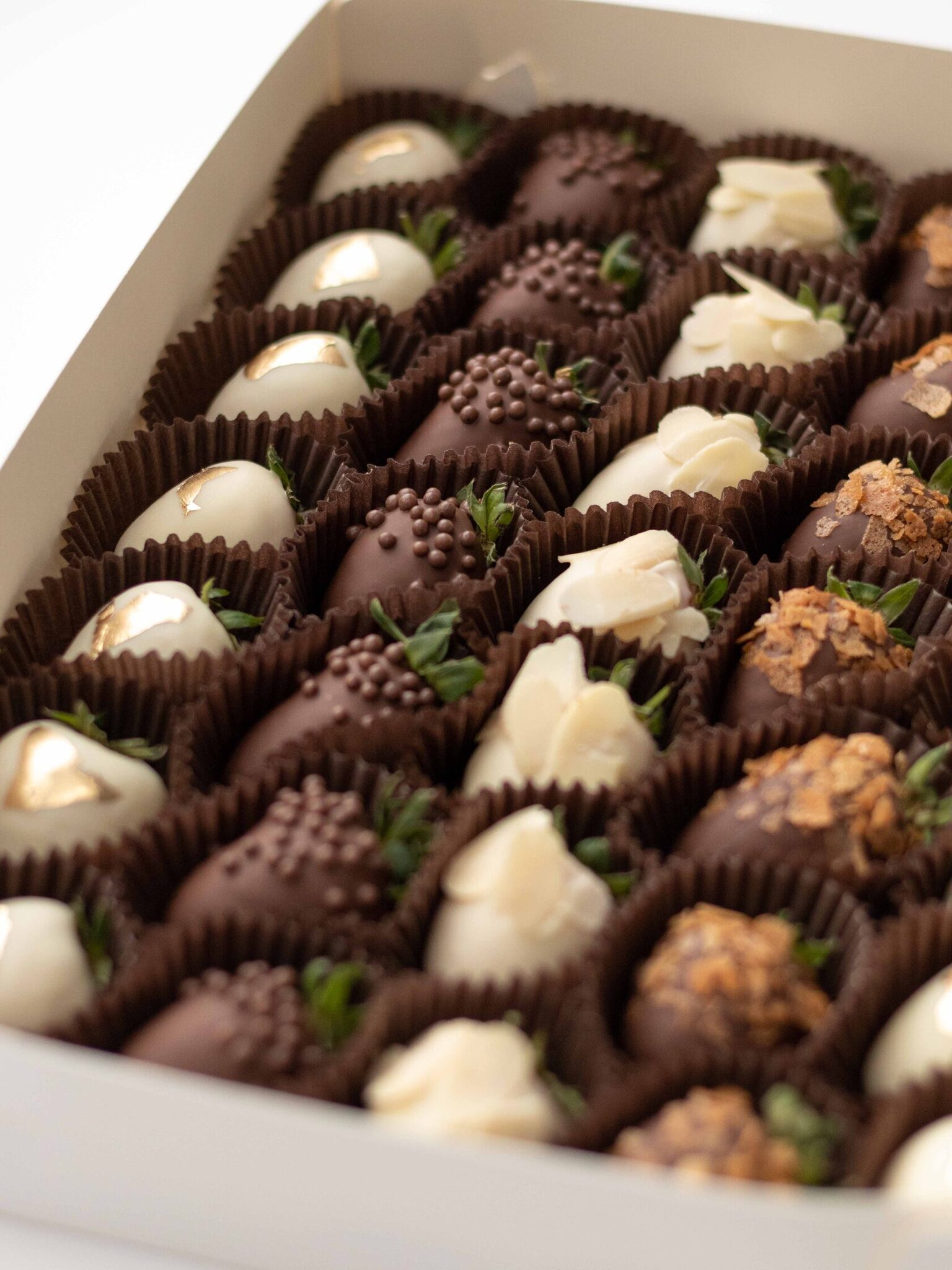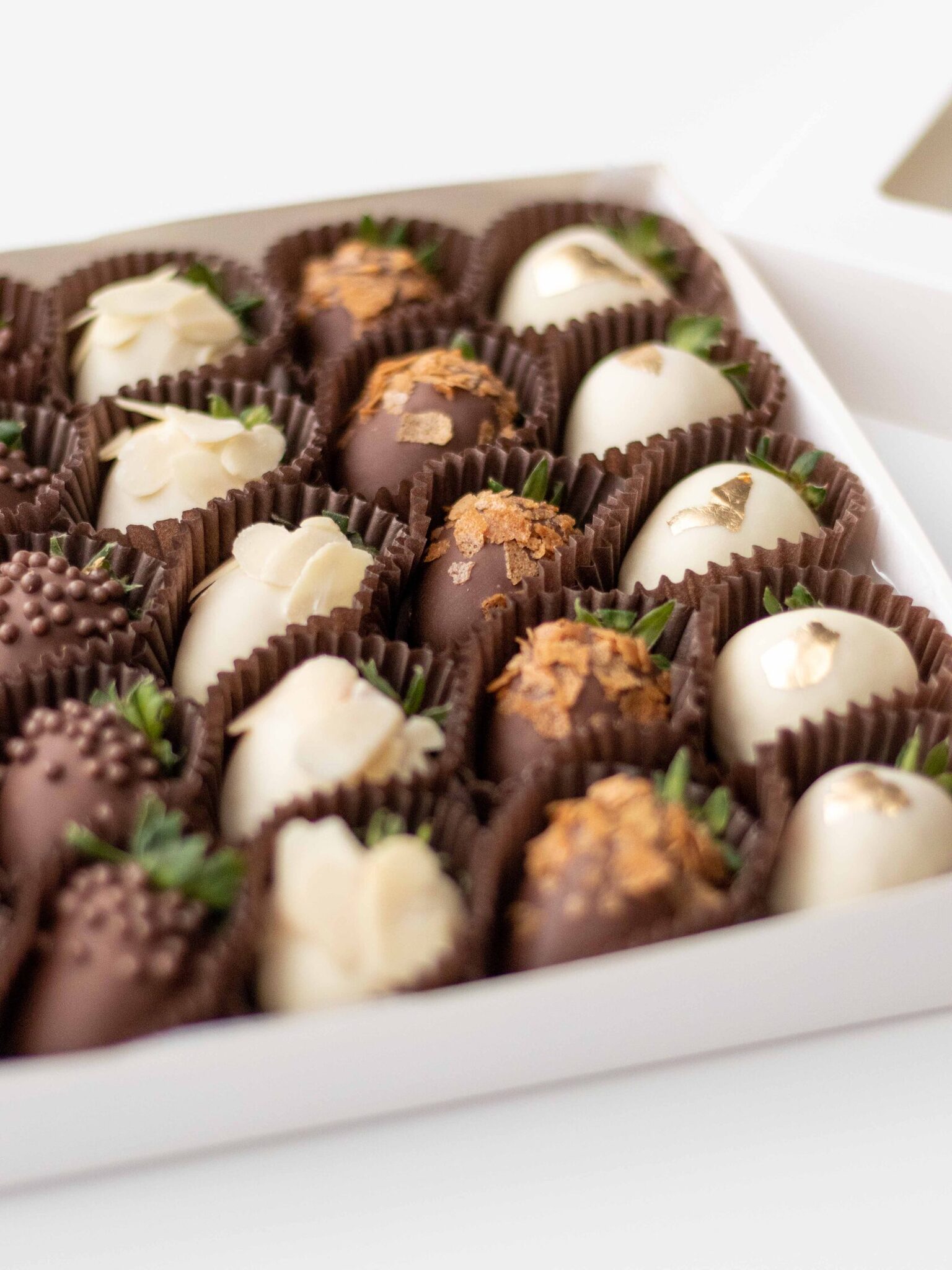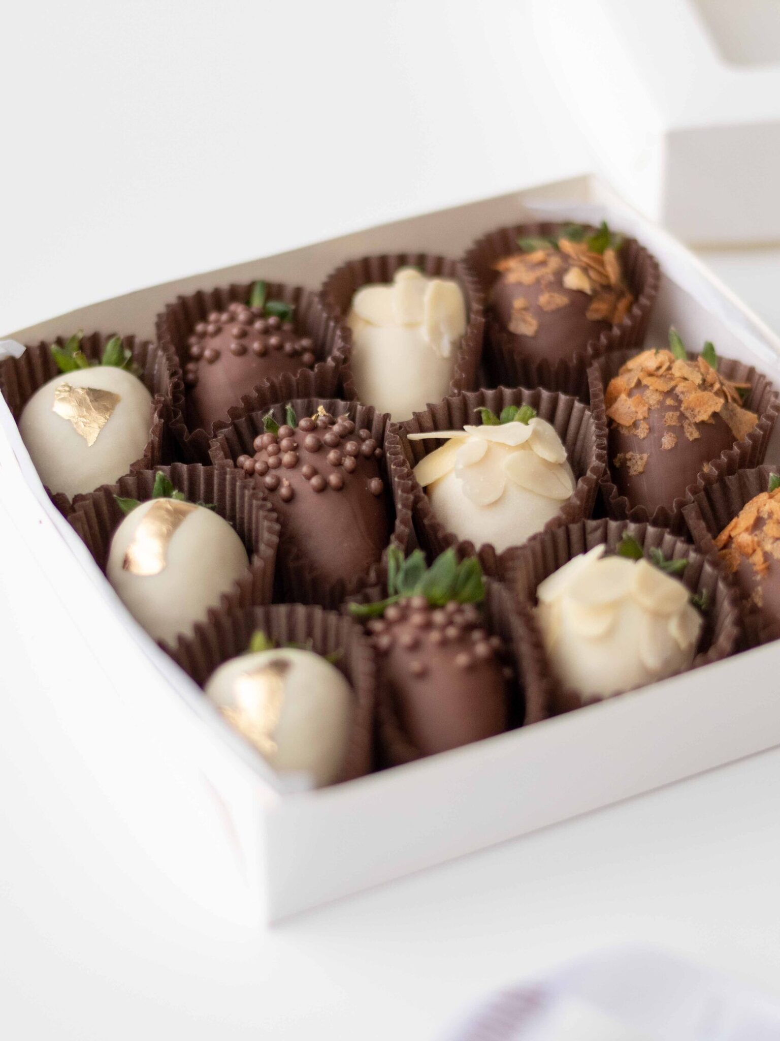Клубника свежая отборная⁣⁣⁣, Шоколад белый, Шоколад молочный, Вафельная крошка карамелизированная, Золото сусальное пищевое, Криспи шарики рисовые в шоколаде, Миндальные лепестки