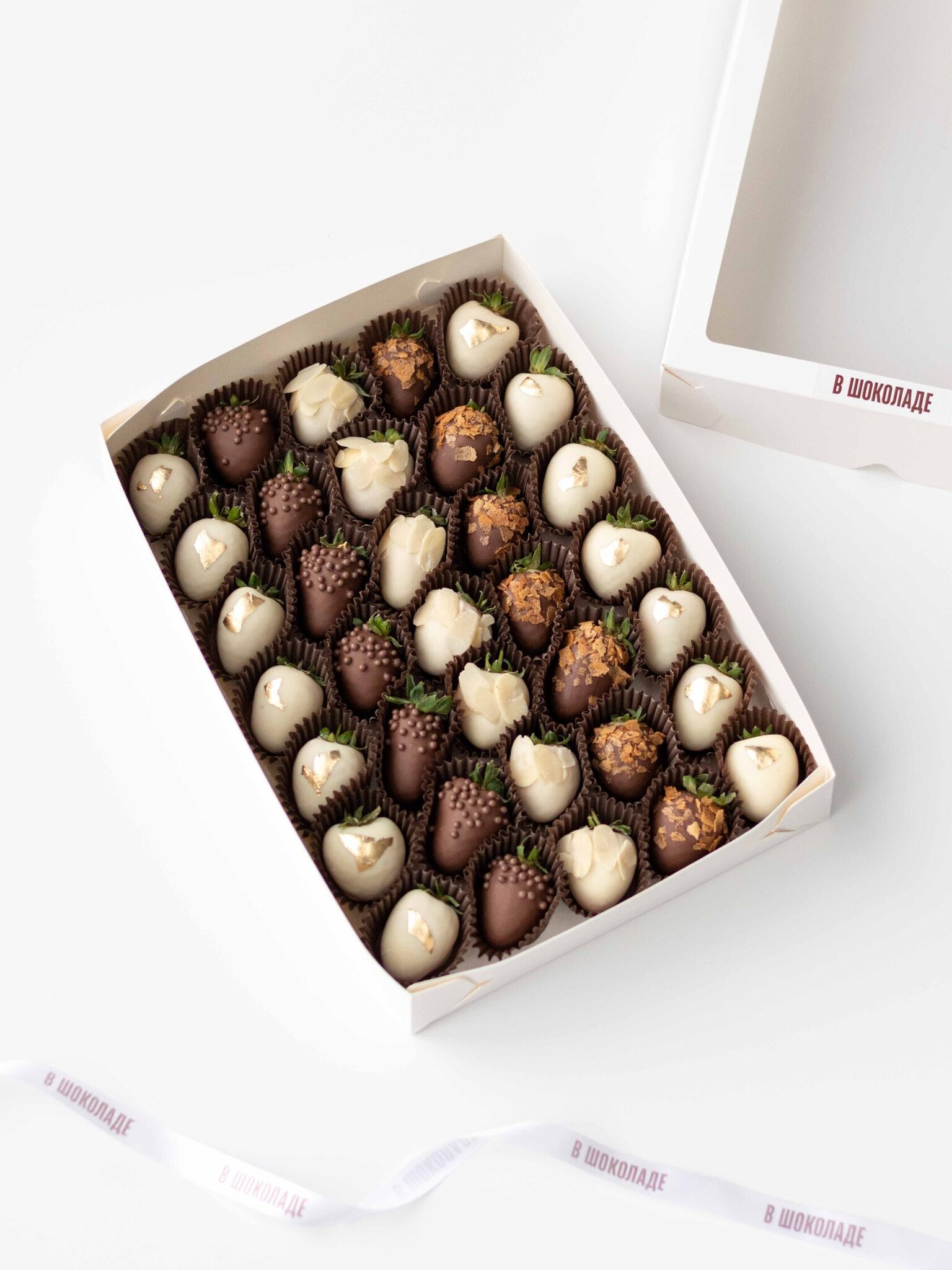 Мы работаем с клубникой сорта «Альбион» (Армения), а зимой - с египетской и греческой. Каждая ягода проходит ручной отбор. Покрываем её бельгийским шоколадом Barry Callebaut и Sicao, не используя глазурь и заменители.