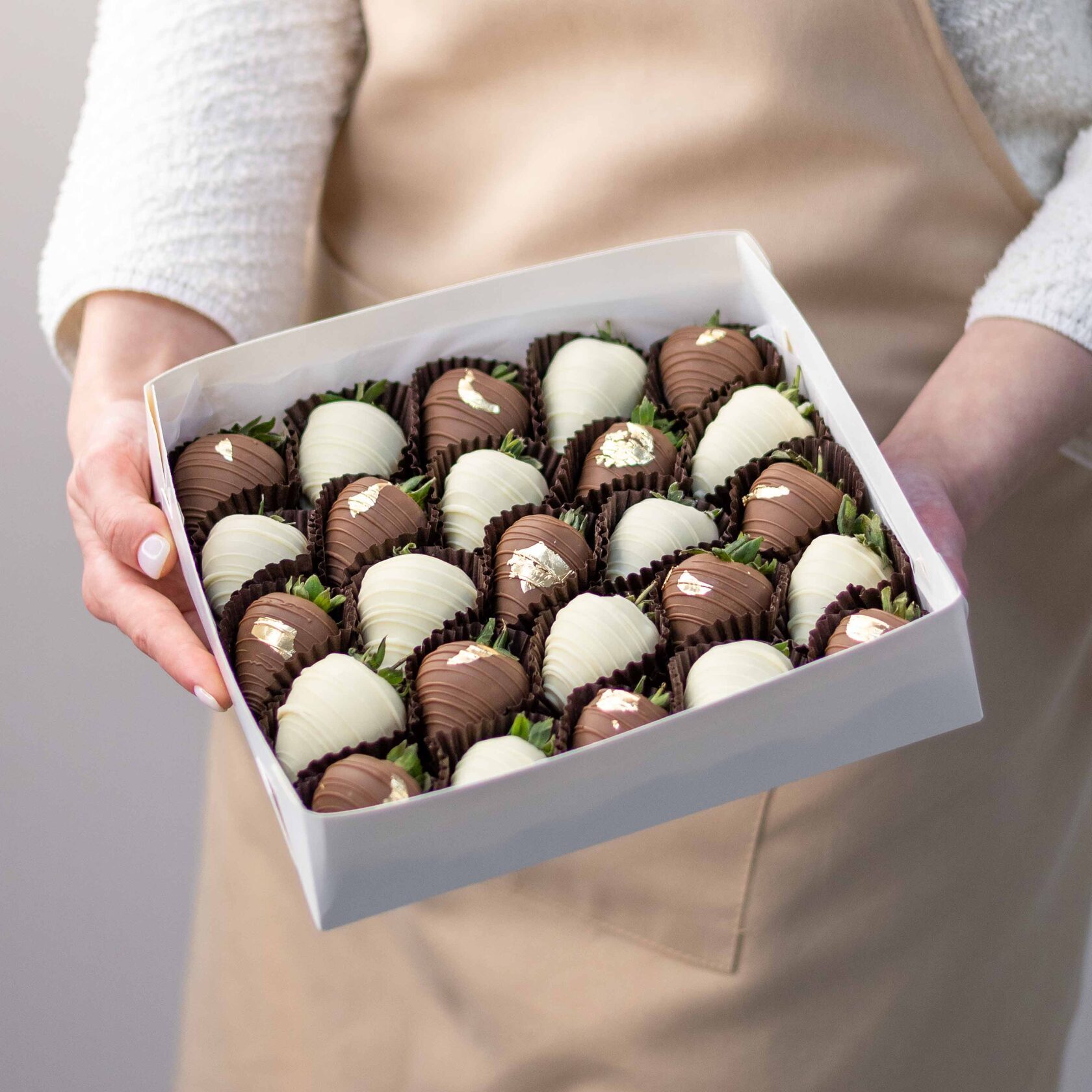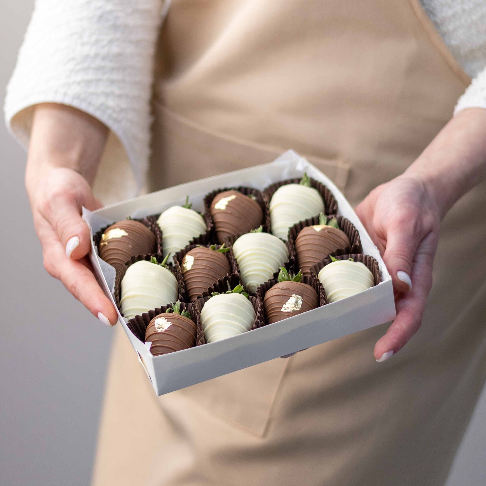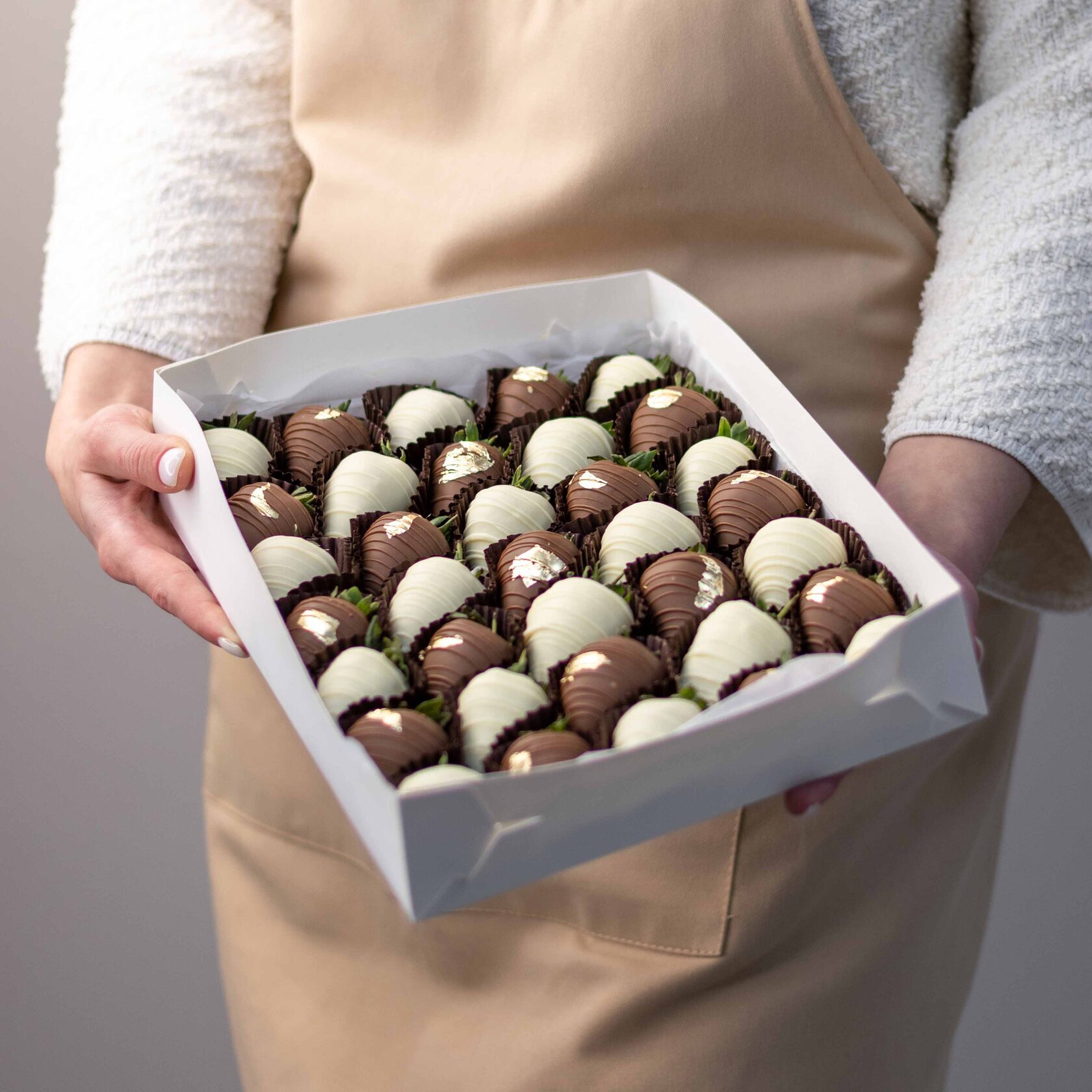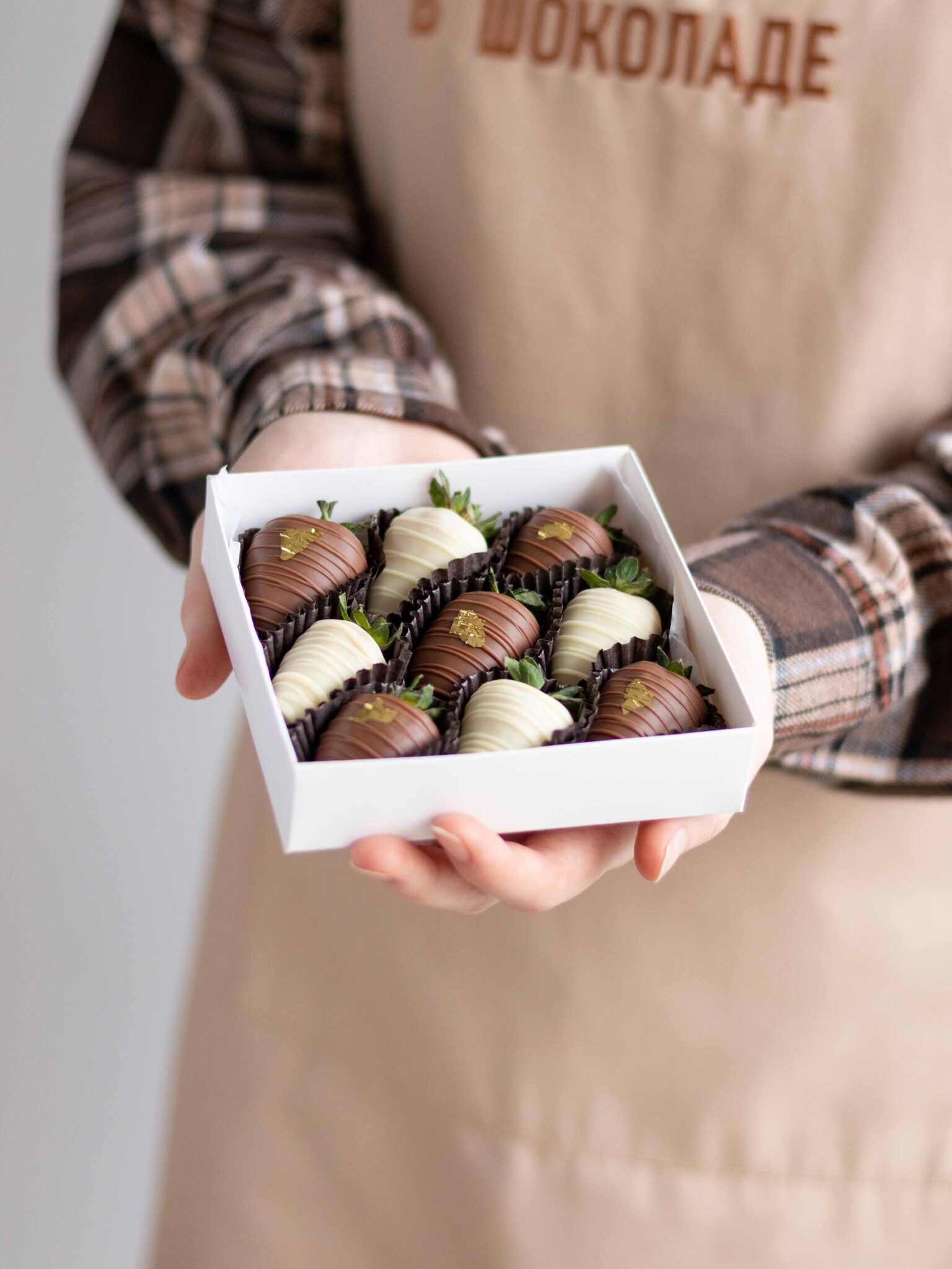 Мы работаем с клубникой сорта «Альбион» (Армения), а зимой - с египетской и греческой. Каждая ягода проходит ручной отбор. Покрываем её бельгийским шоколадом Barry Callebaut и Sicao, не используя глазурь и заменители.