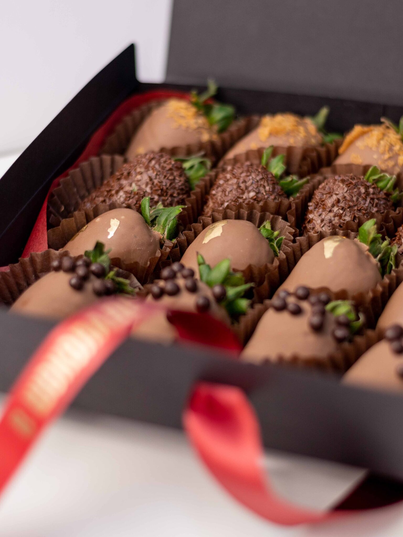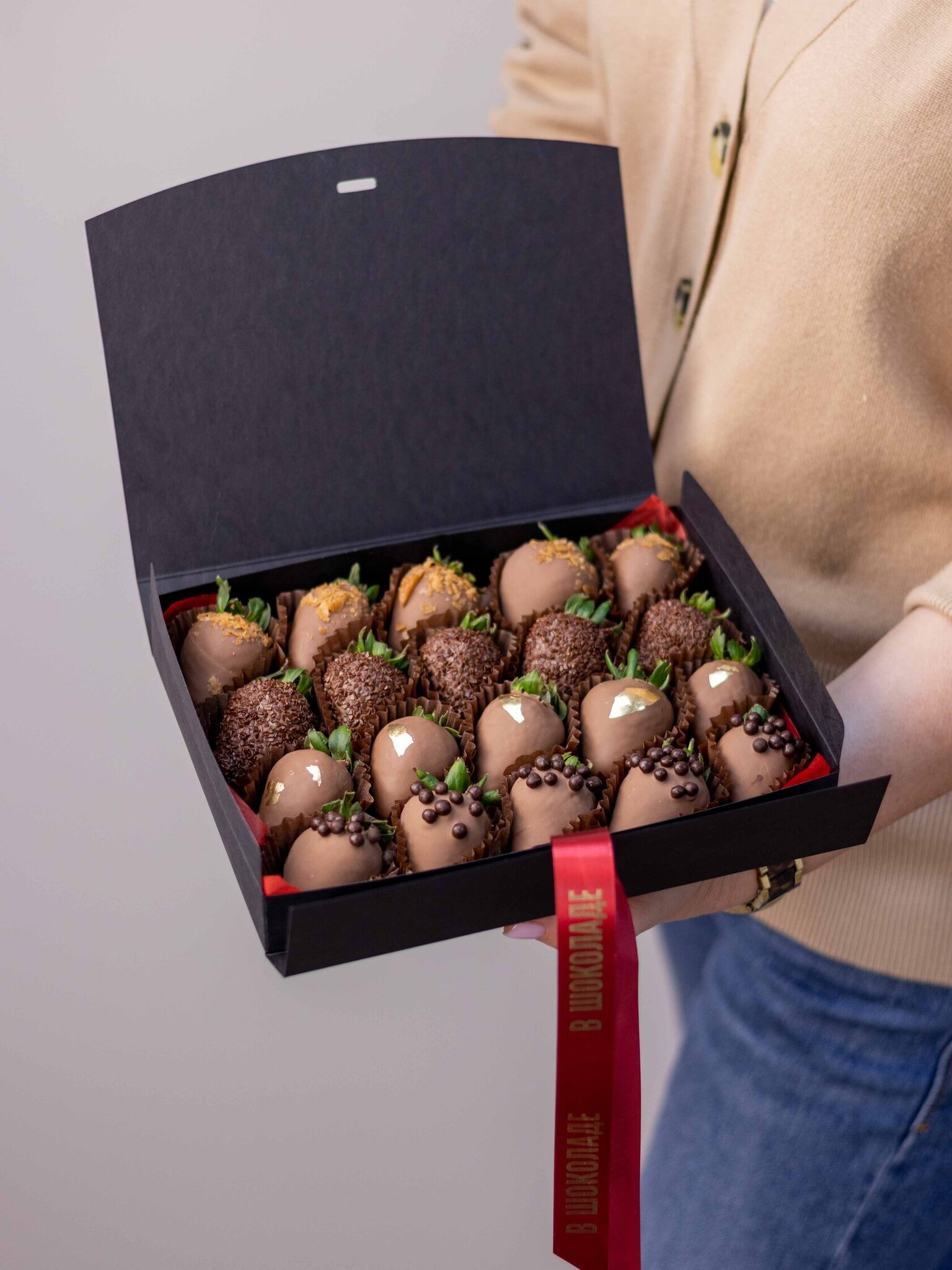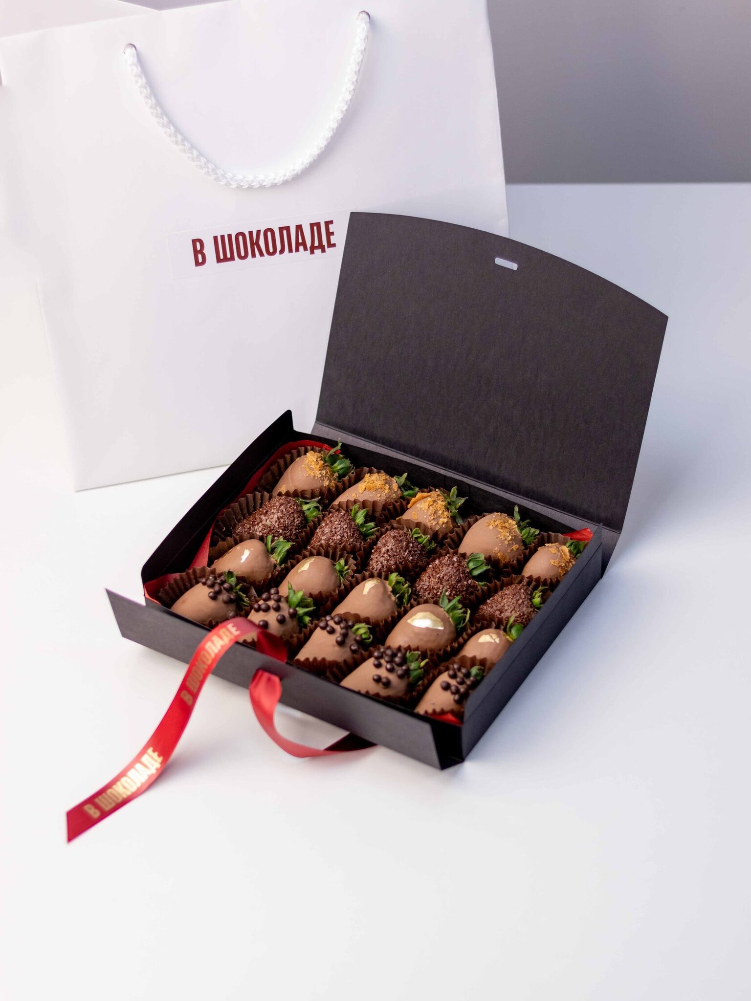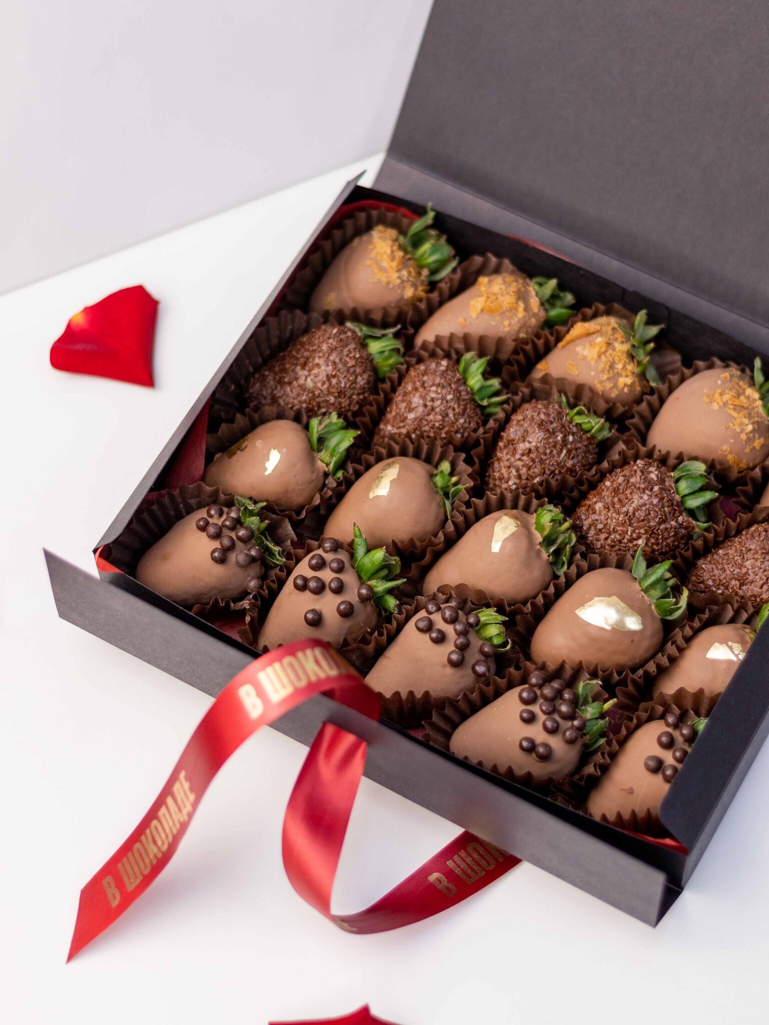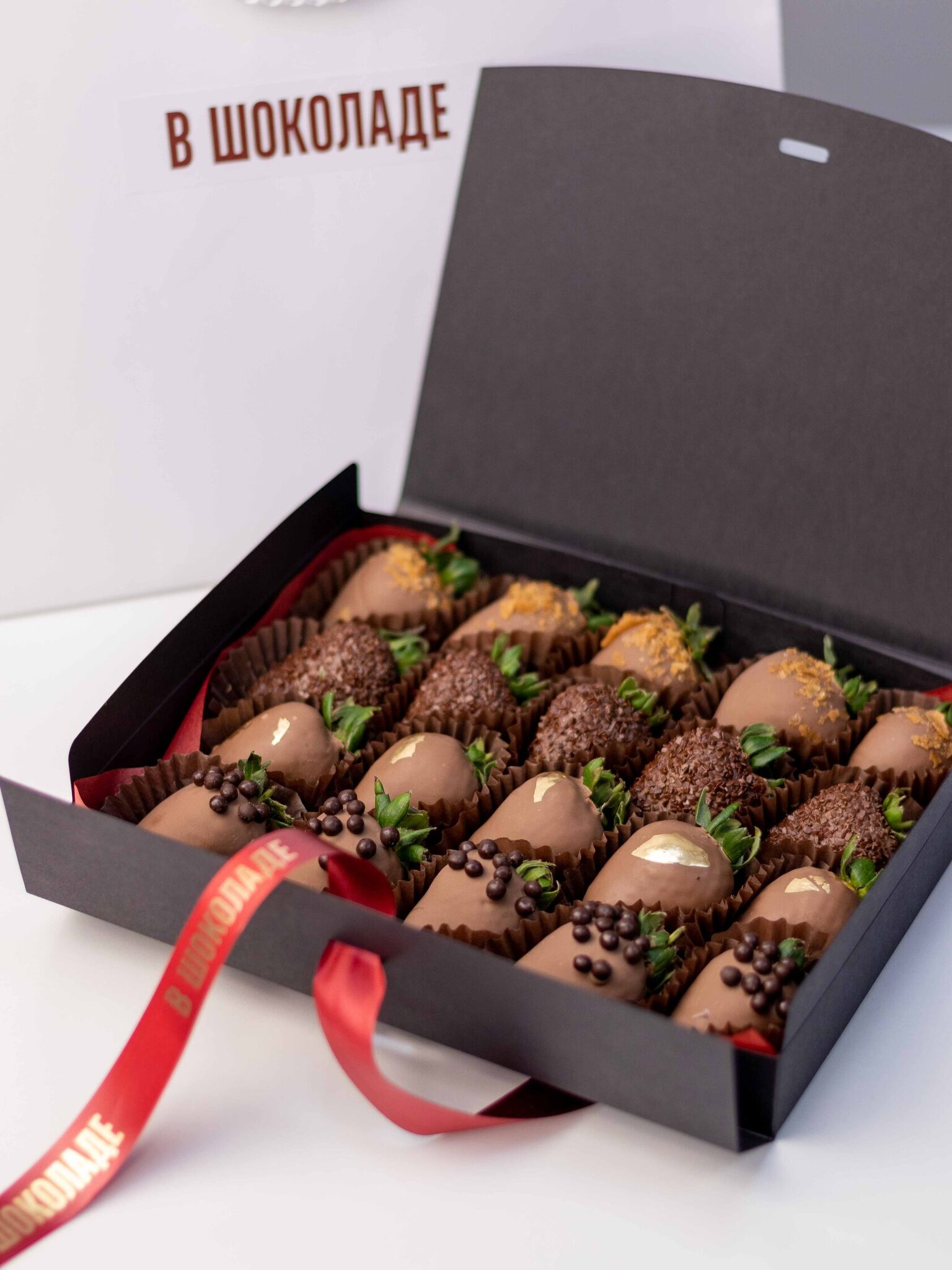Мы работаем с клубникой сорта «Альбион» (Армения), а зимой - с египетской и греческой. Каждая ягода проходит ручной отбор. Покрываем её бельгийским шоколадом Barry Callebaut и Sicao, не используя глазурь и заменители.