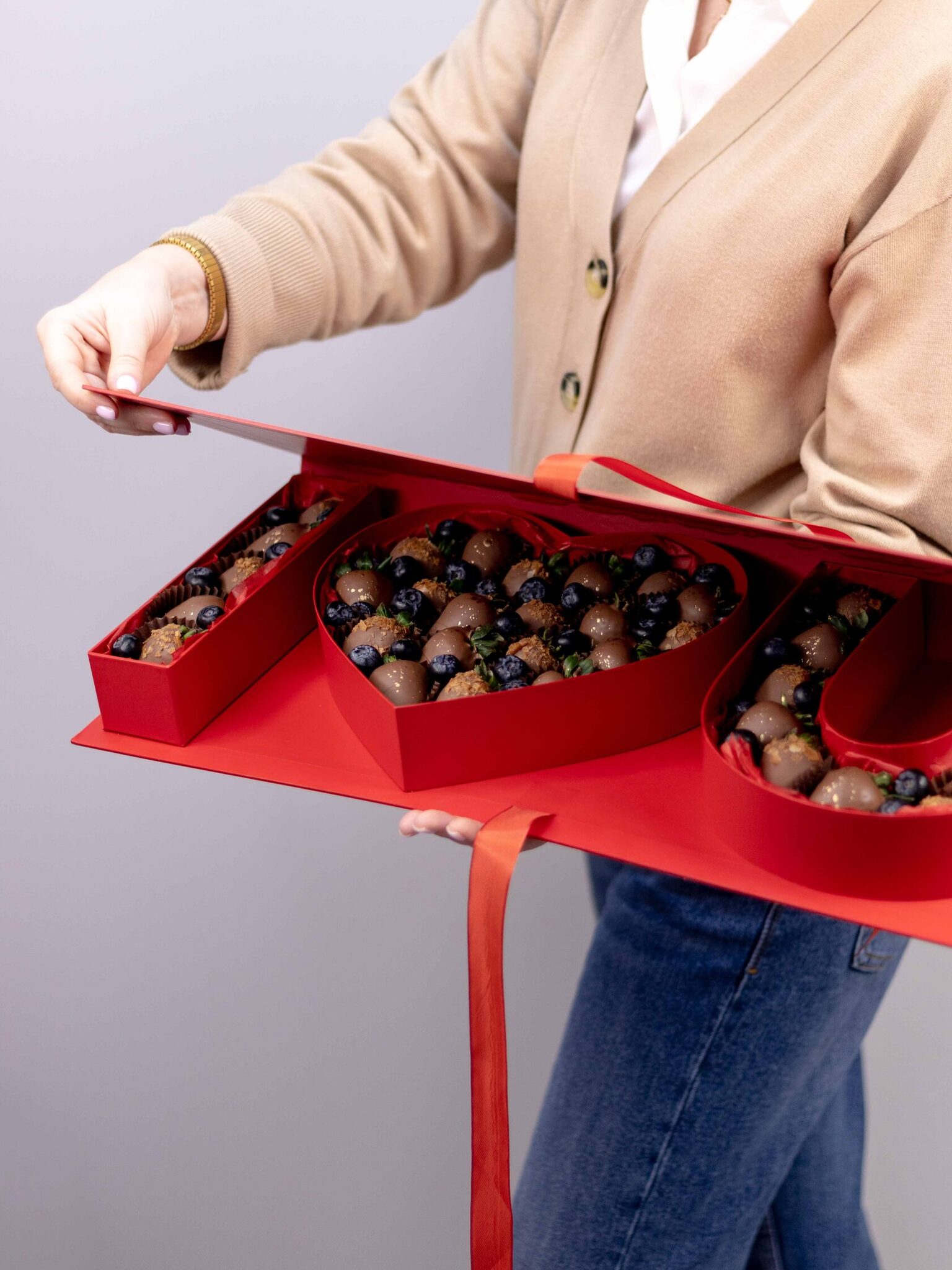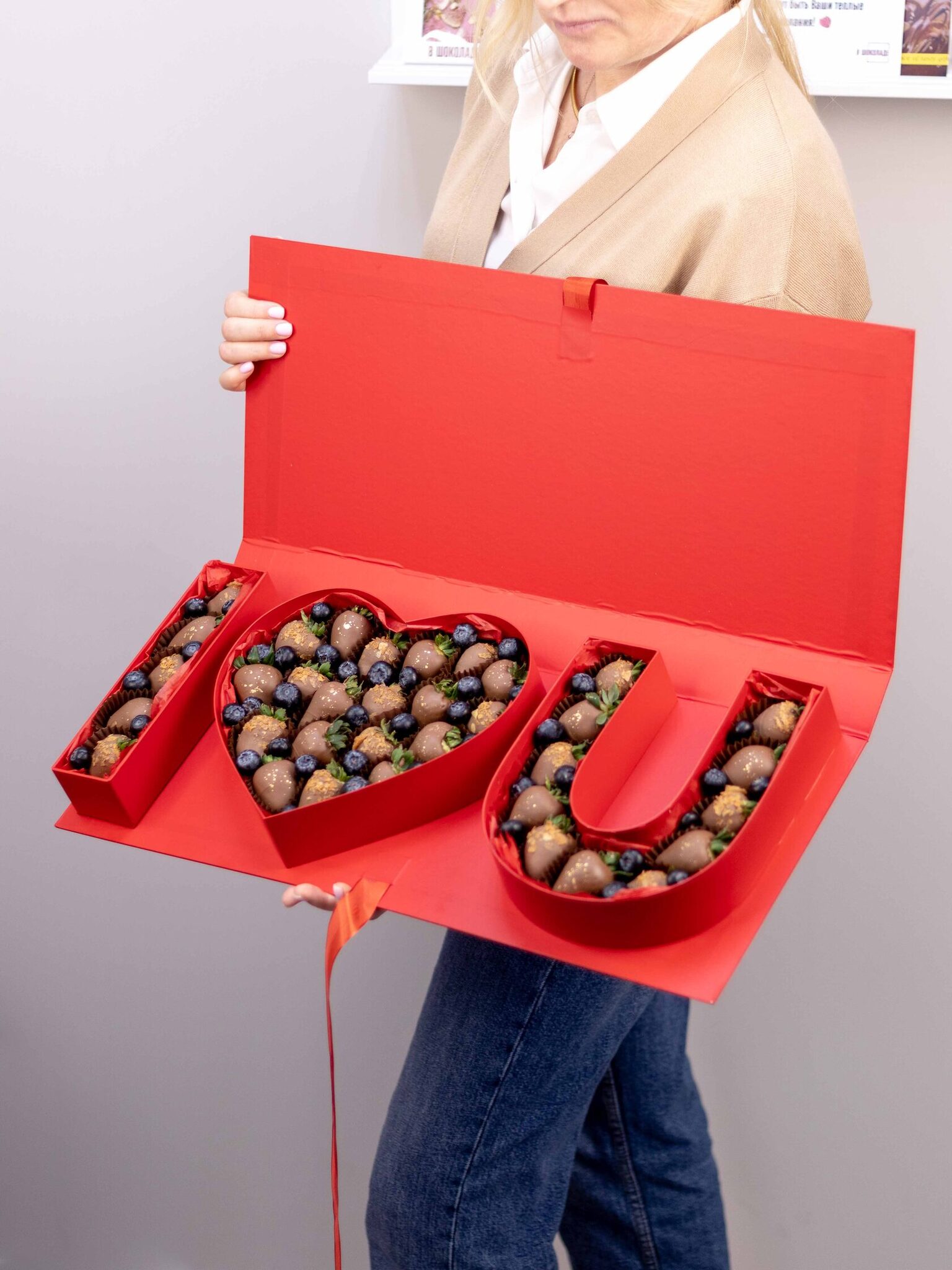 В своих композициях мы используем только свежие ягоды и натуральный бельгийский шоколад известной марки Callebaut.