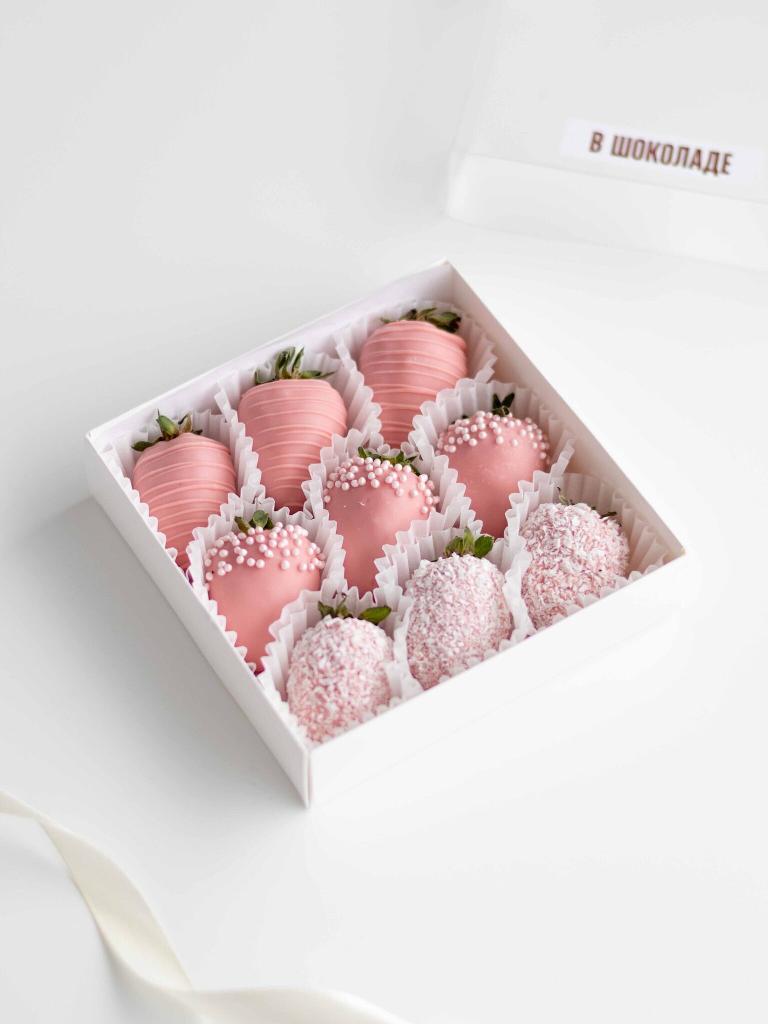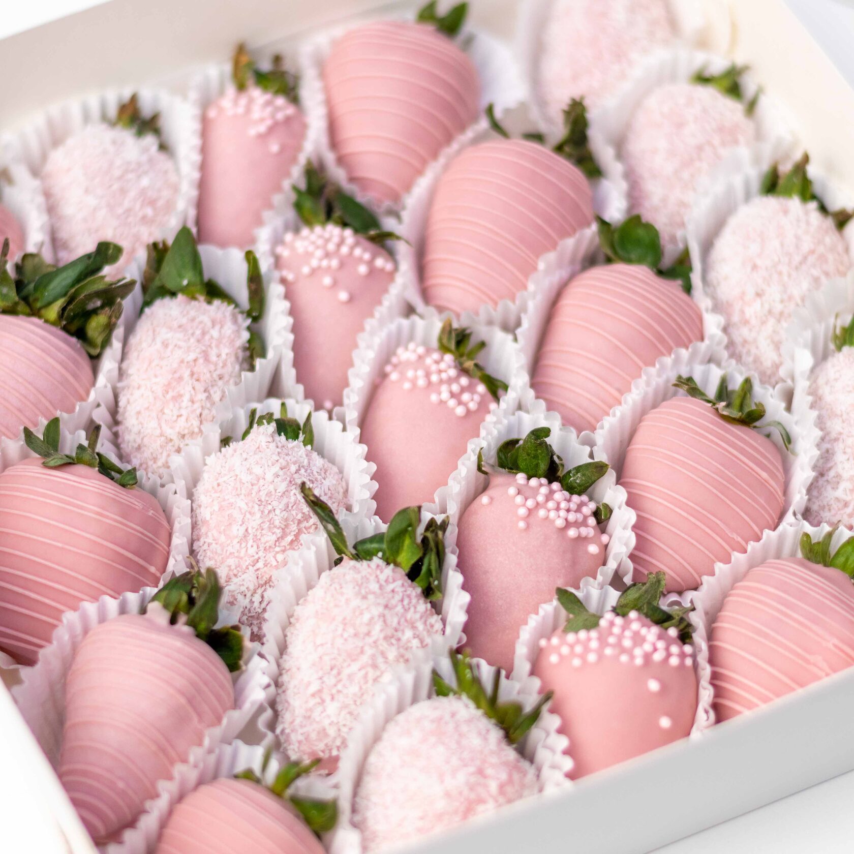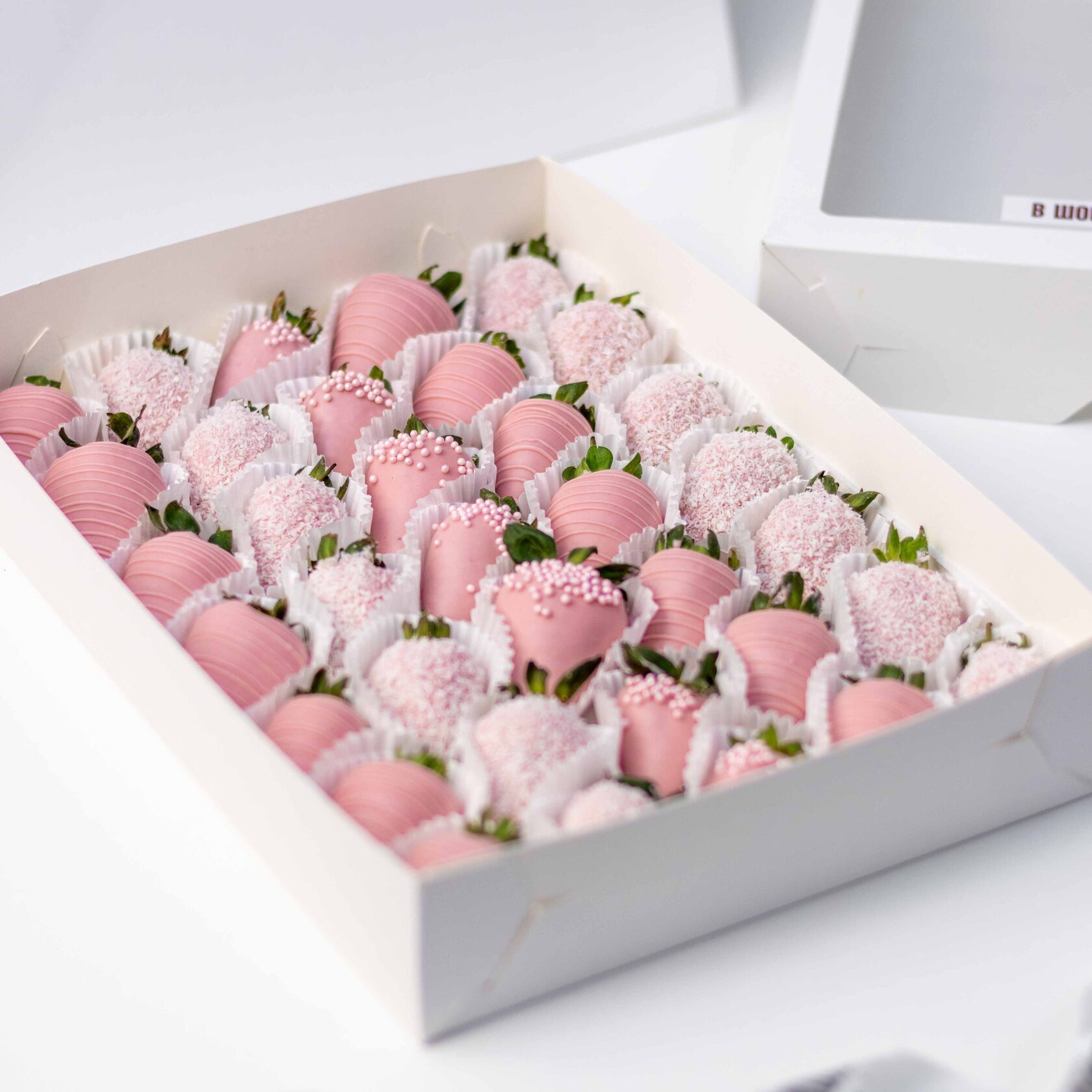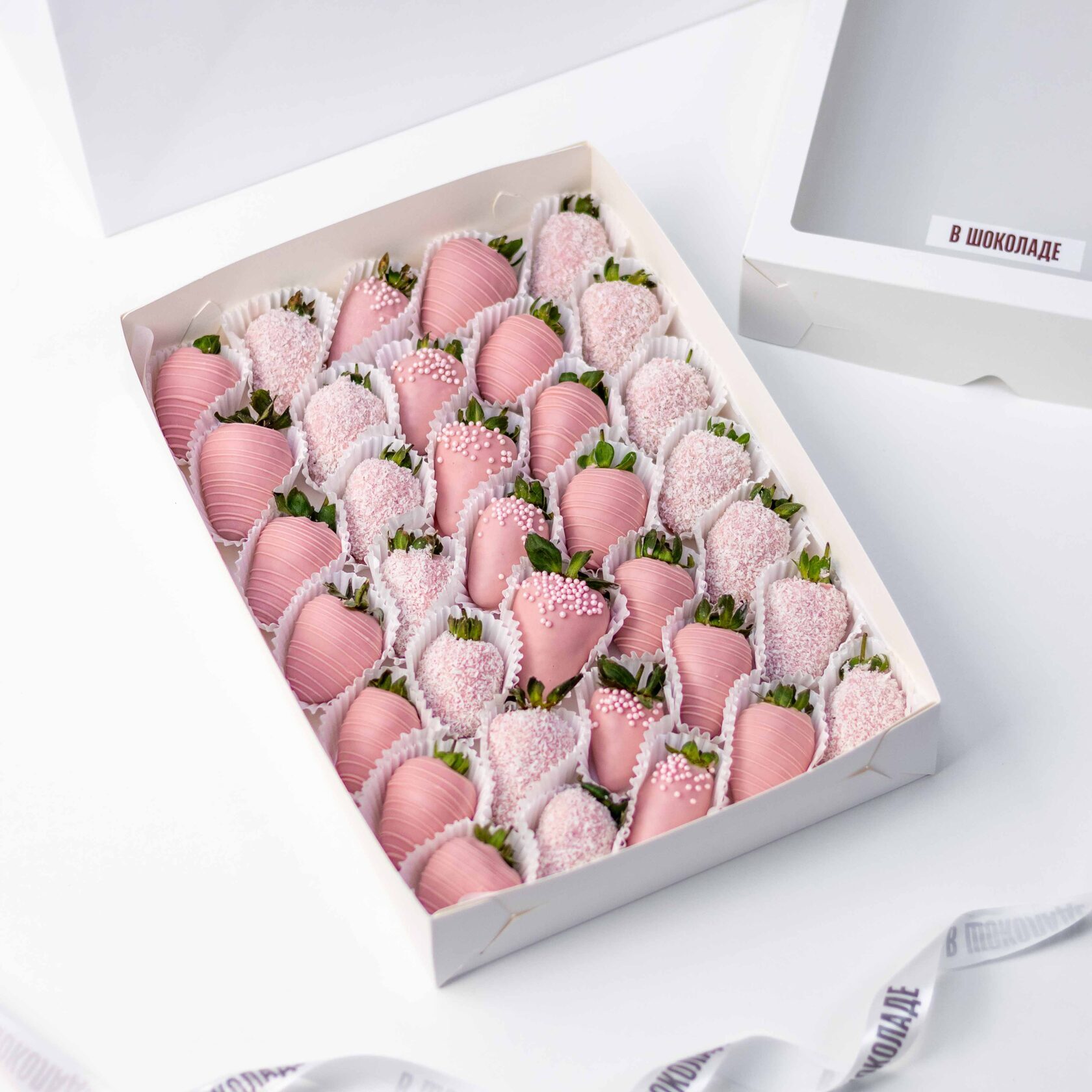 Нежный набор из ароматной клубники в розовом бельгийском шоколаде с декором из кокосовой стружки и сахарными шариками