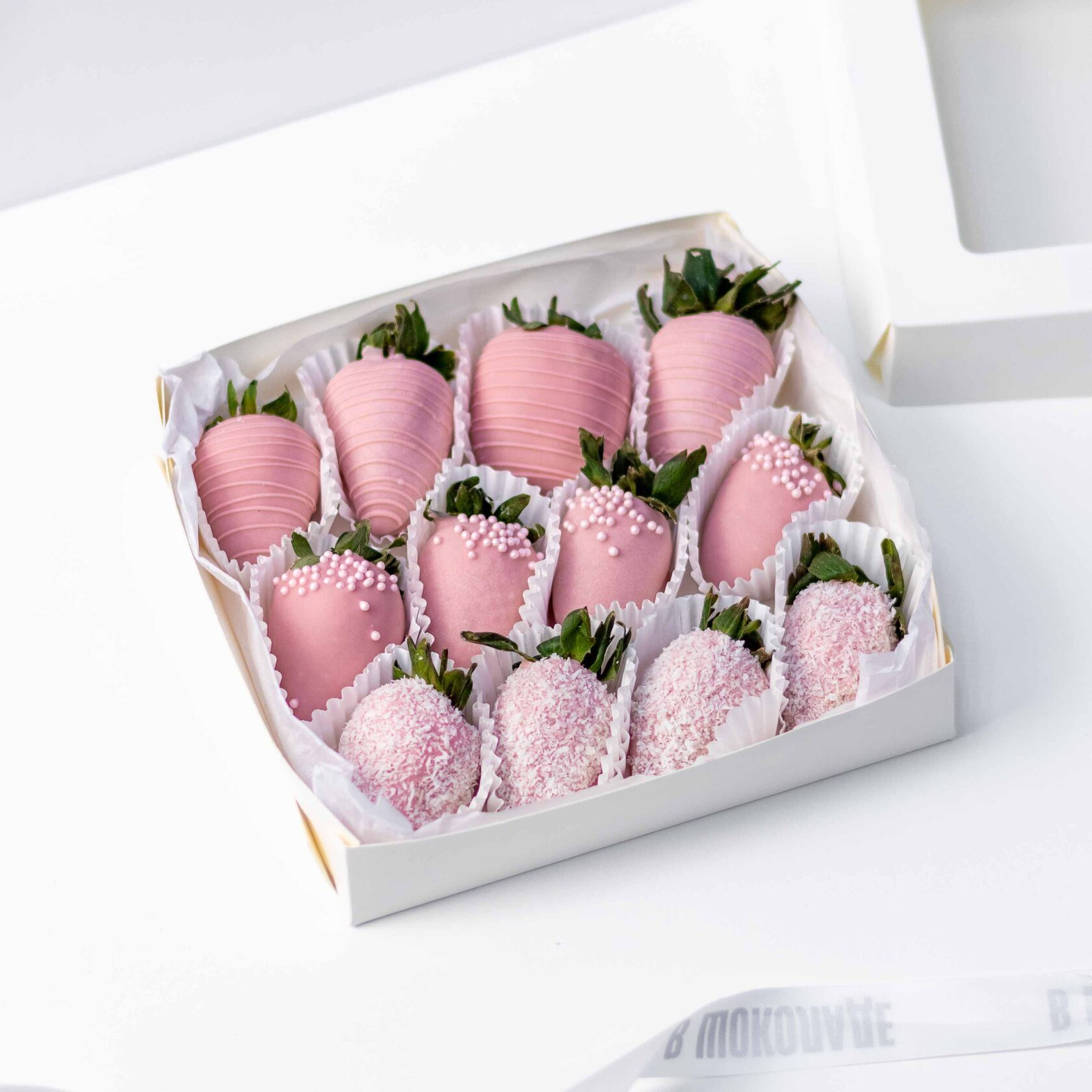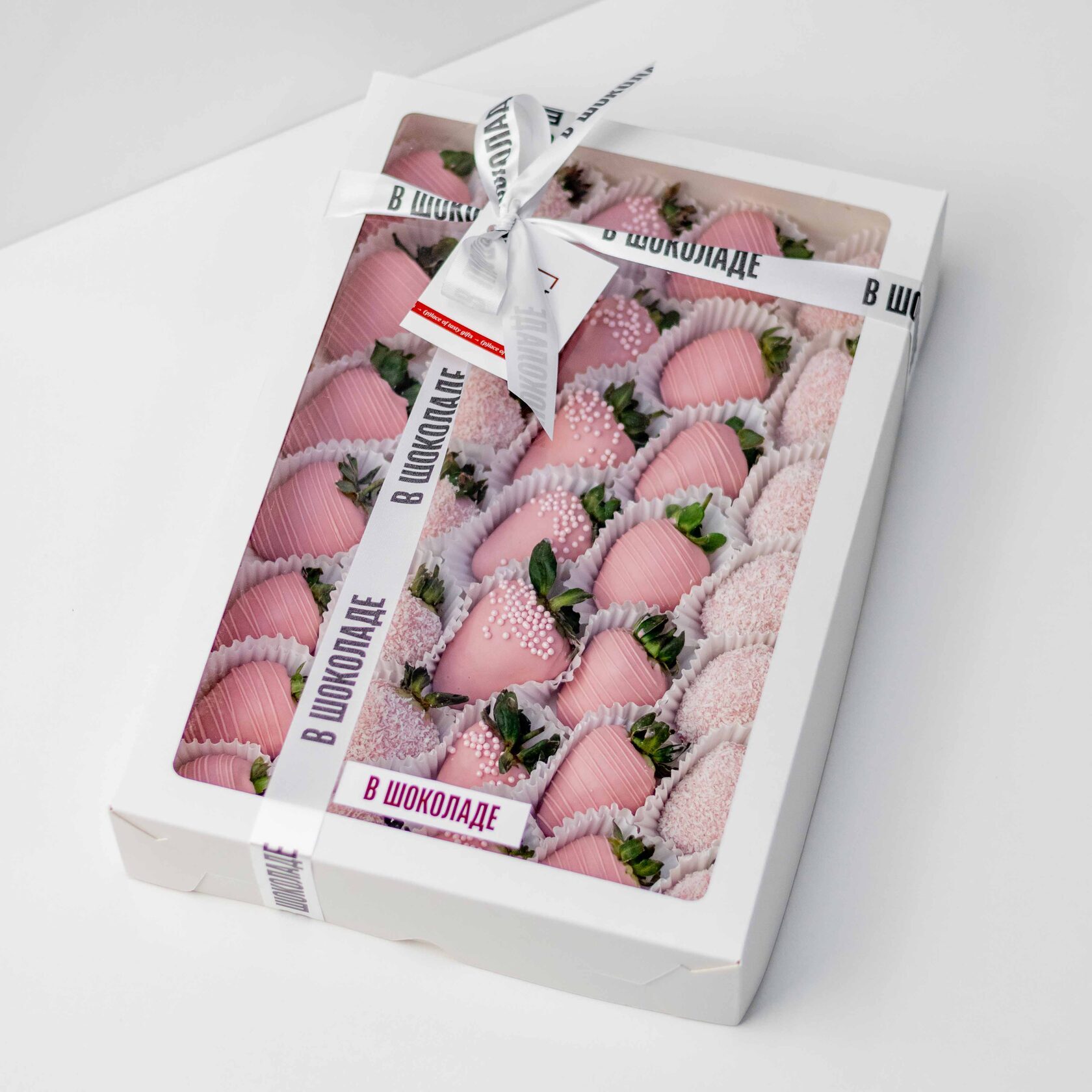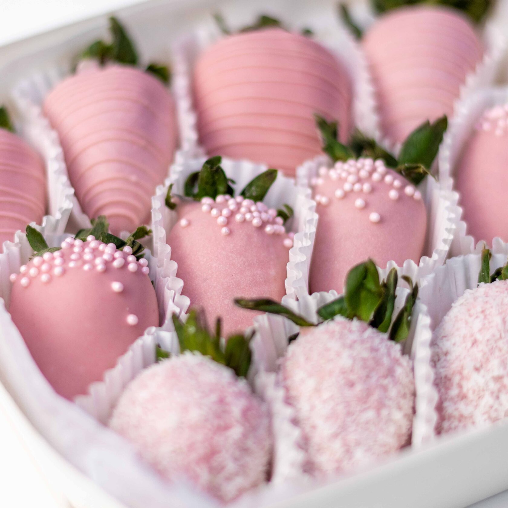 Нежный набор из ароматной клубники в розовом бельгийском шоколаде с декором из кокосовой стружки и сахарными шариками