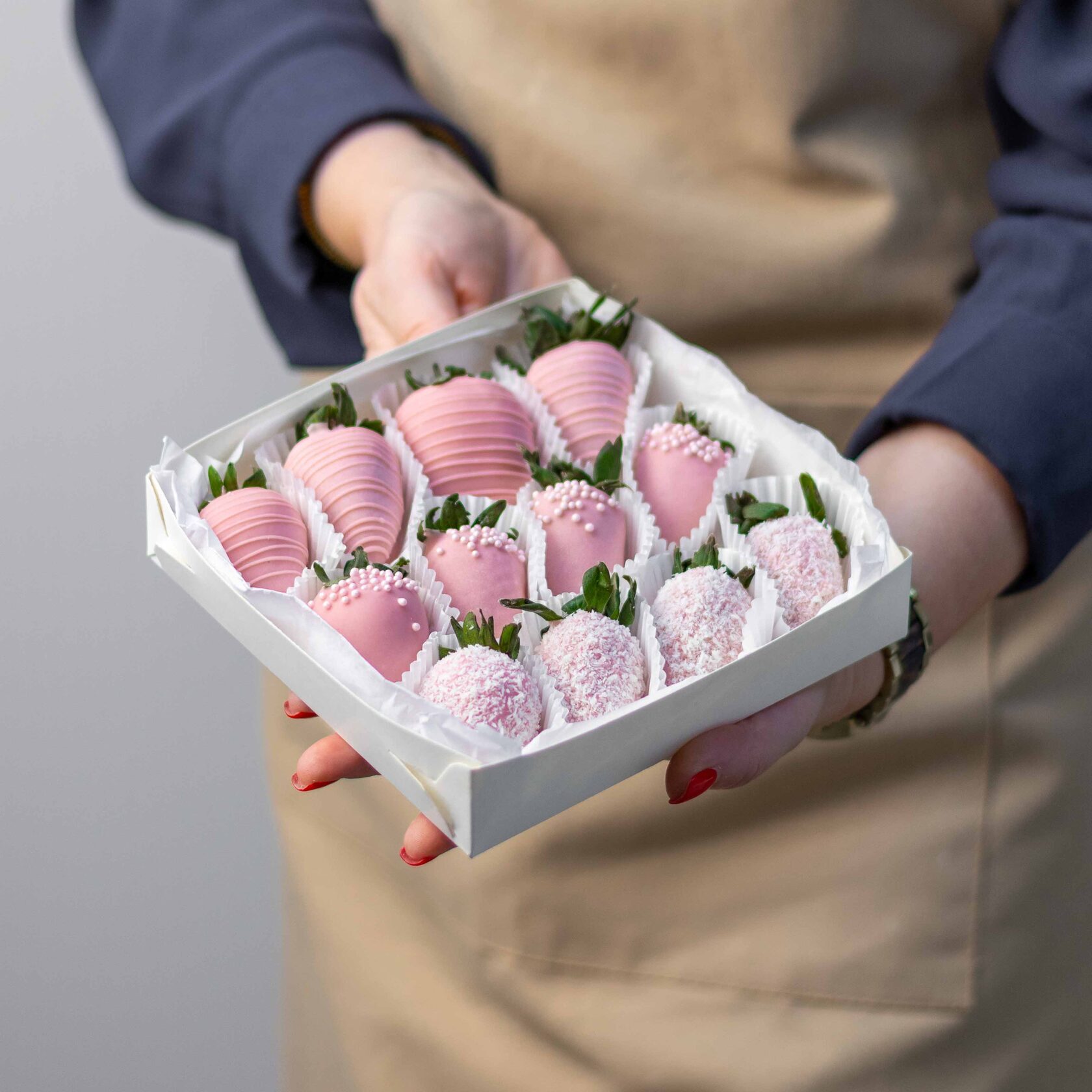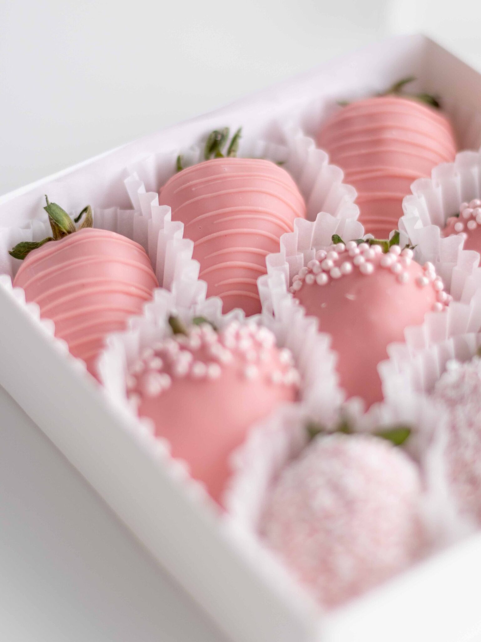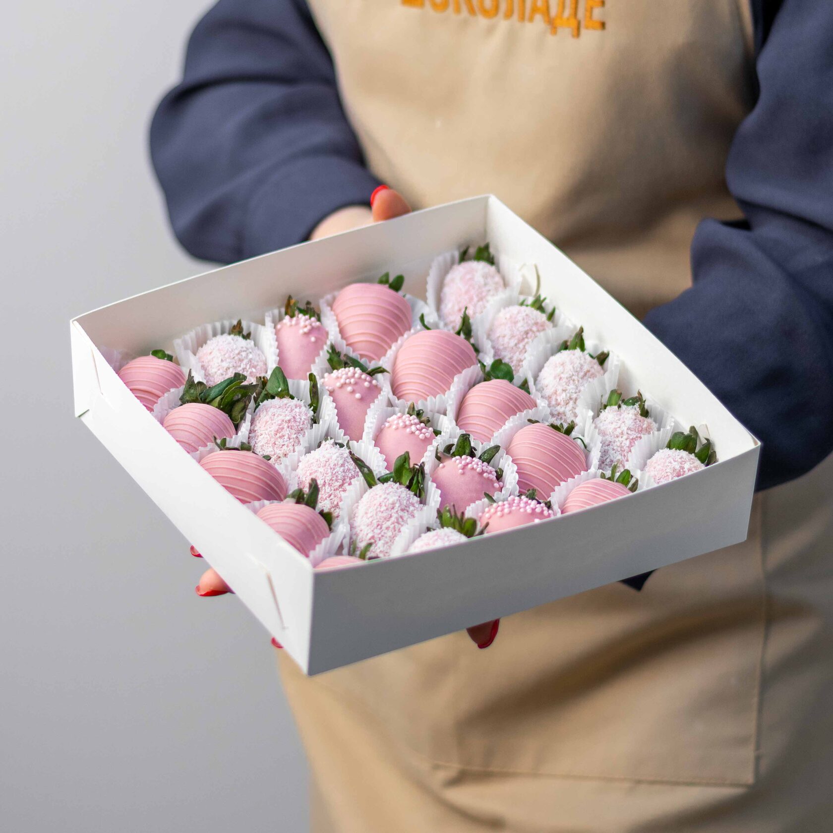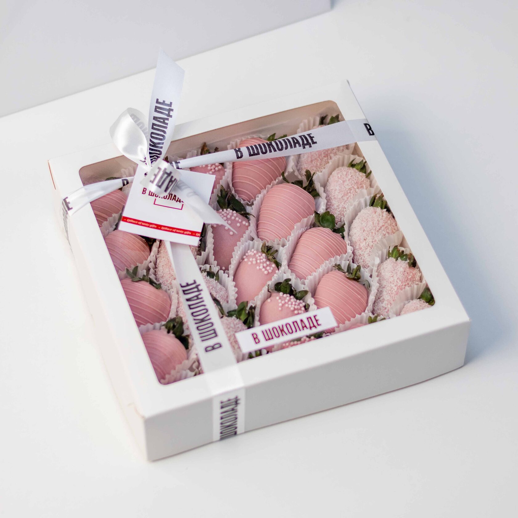 Нежный набор из ароматной клубники в розовом бельгийском шоколаде с декором из кокосовой стружки и сахарными шариками