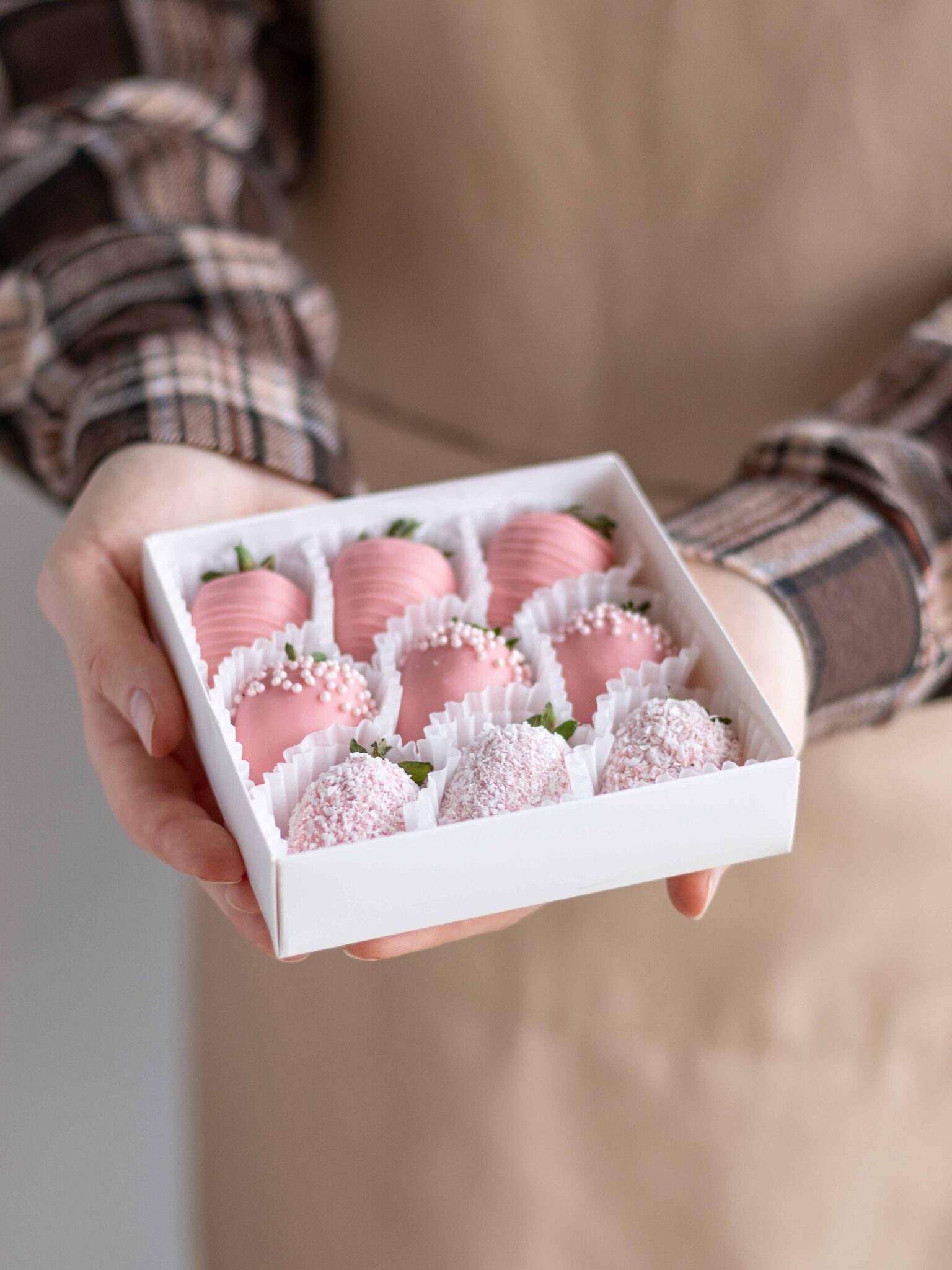 Мы работаем с клубникой сорта «Альбион» (Армения), а зимой - с египетской и греческой. Каждая ягода проходит ручной отбор. Покрываем её бельгийским шоколадом Barry Callebaut и Sicao, не используя глазурь и заменители.