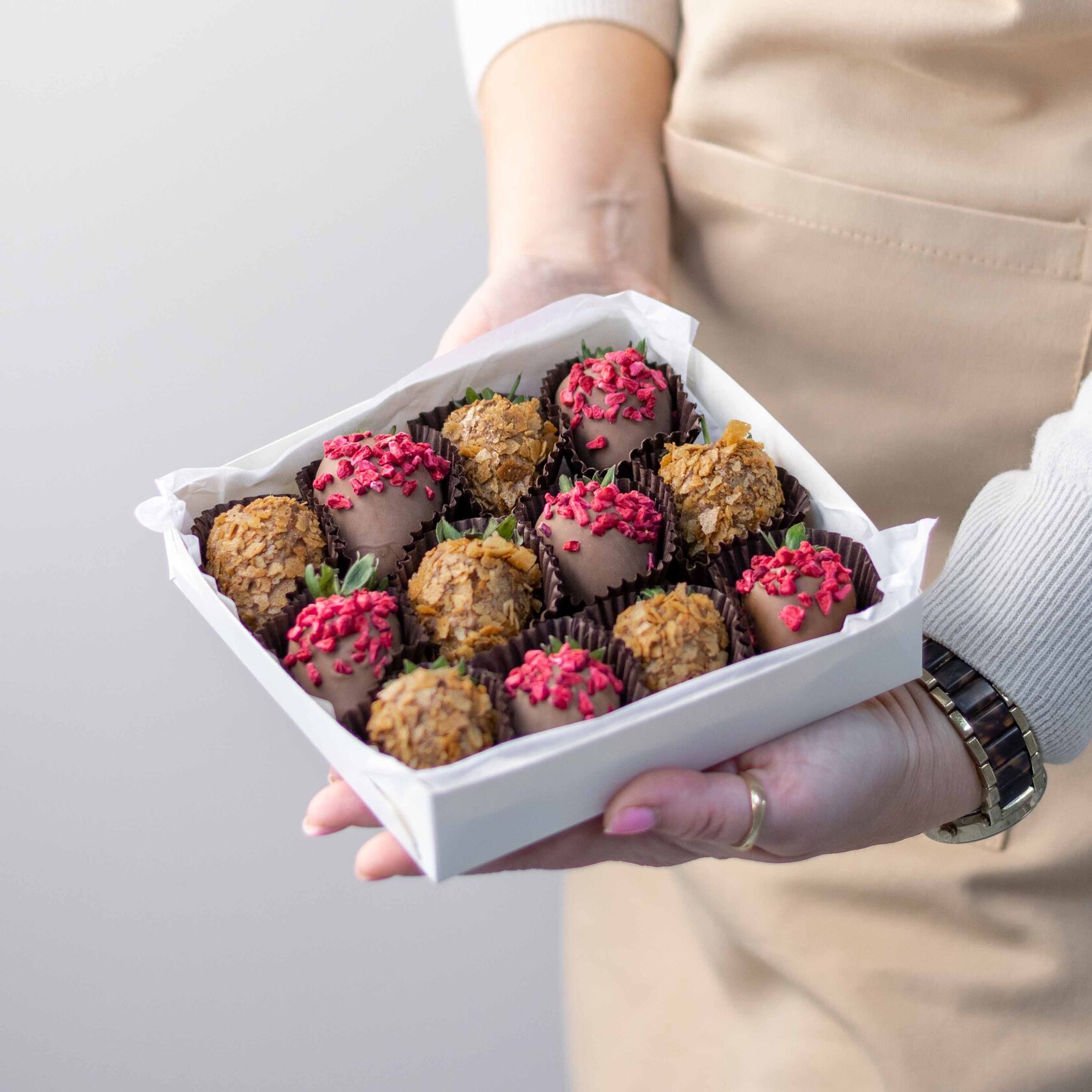 Мы работаем с клубникой сорта «Альбион» (Армения), а зимой - с египетской и греческой. Каждая ягода проходит ручной отбор. Покрываем её бельгийским шоколадом Barry Callebaut и Sicao, не используя глазурь и заменители.