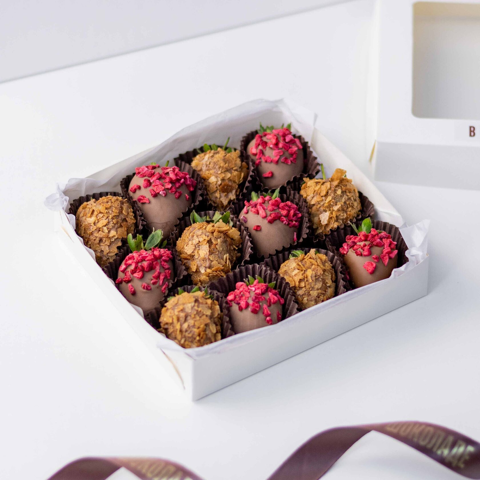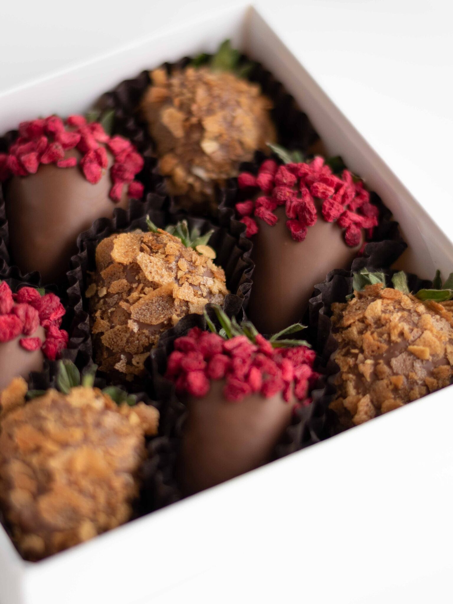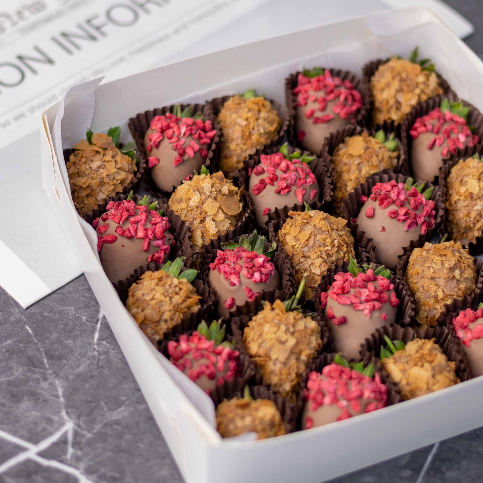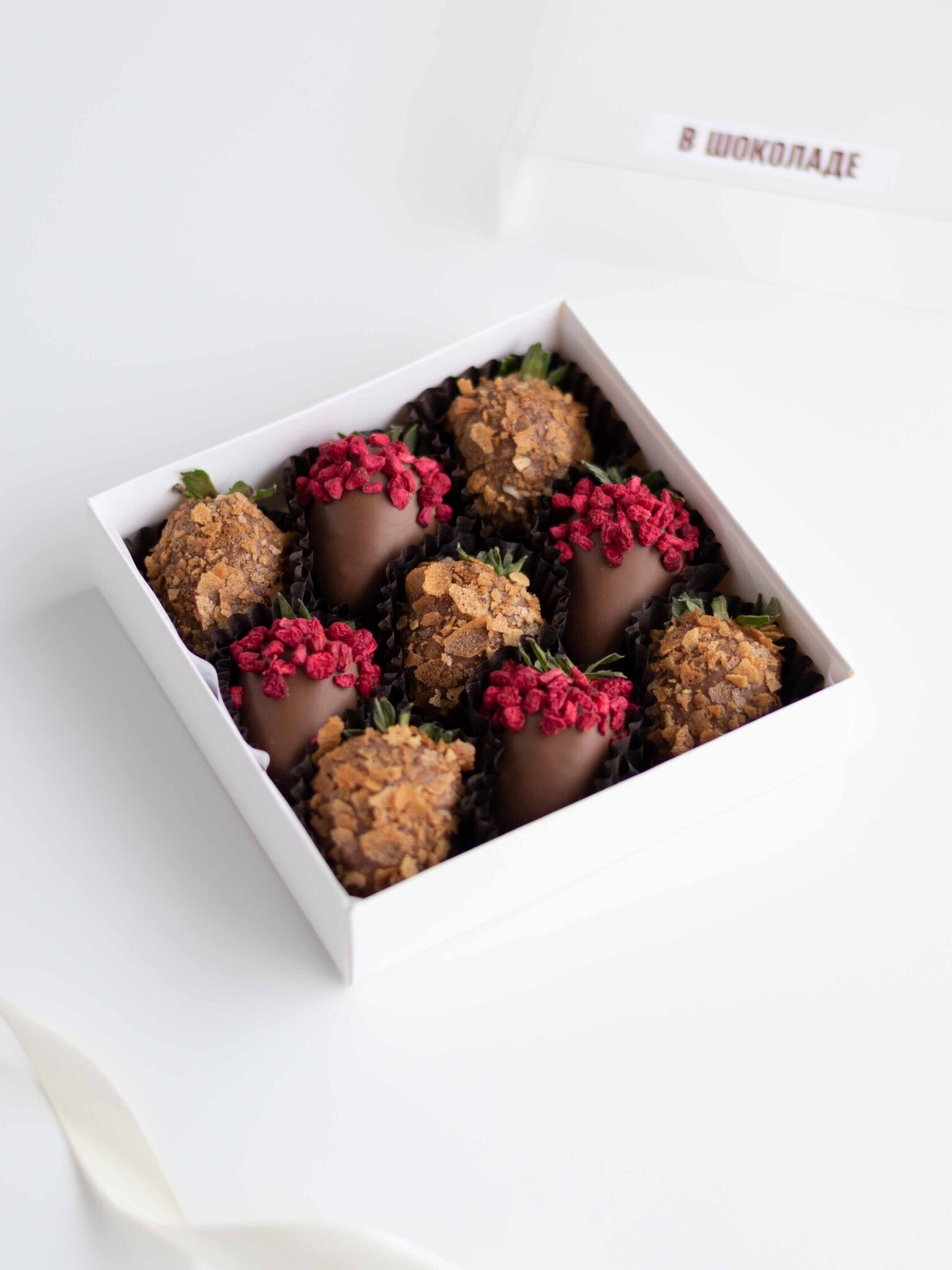 Клубника свежая отборная⁣⁣⁣, Шоколад молочный, Малина сублимированная (сушеная), Вафельная крошка карамелизированная