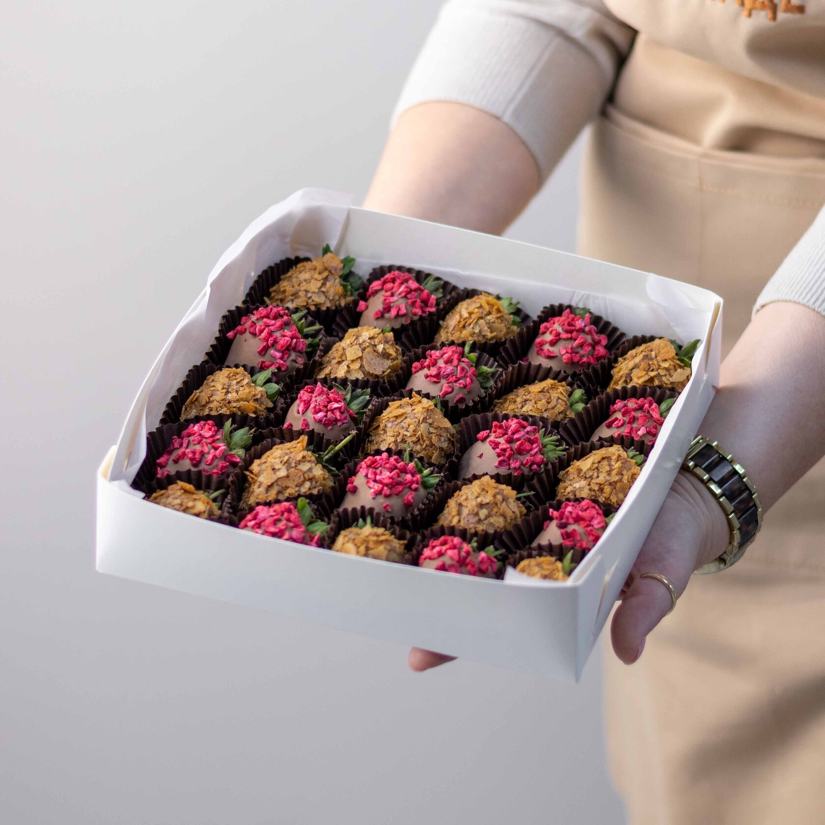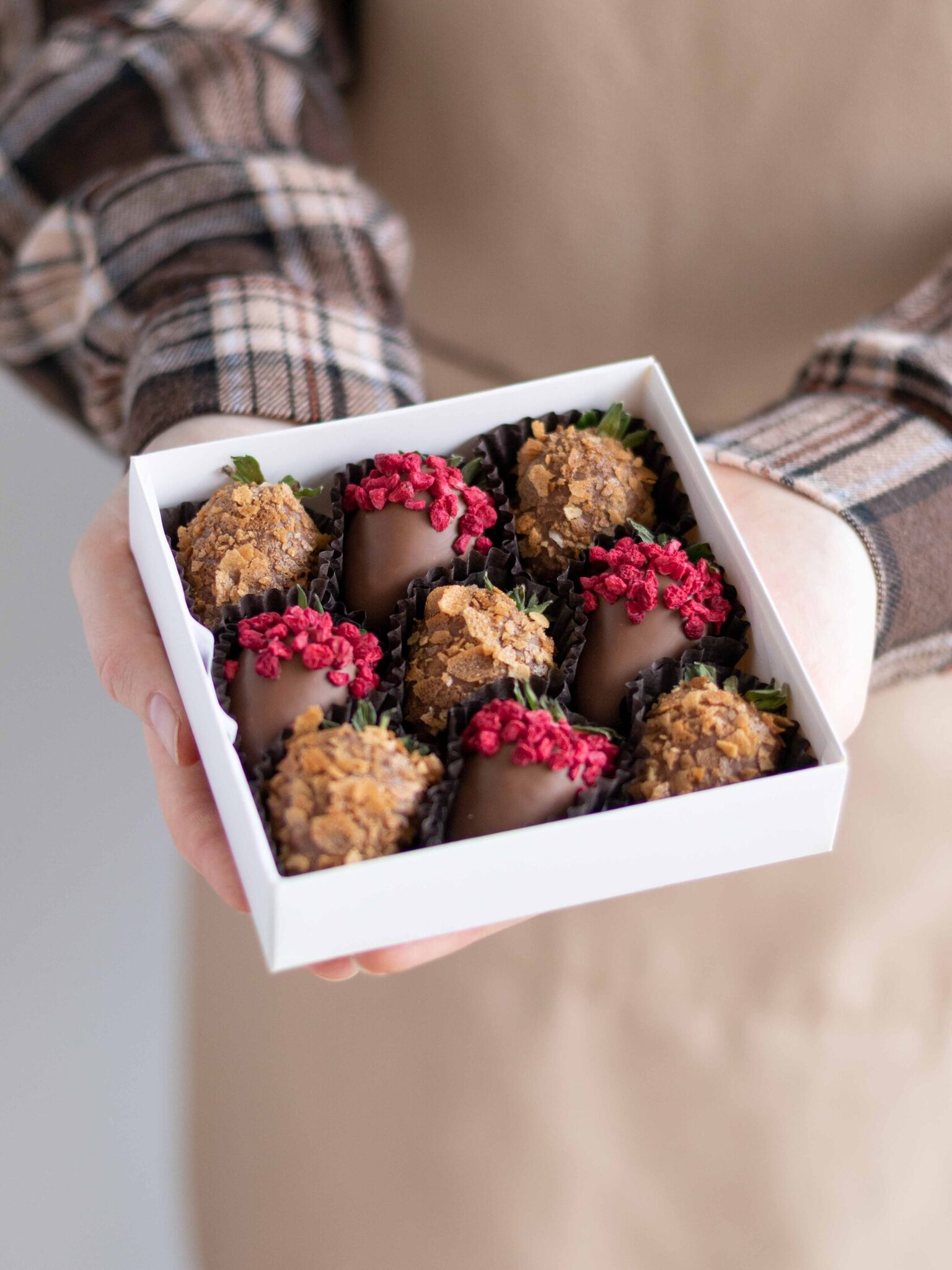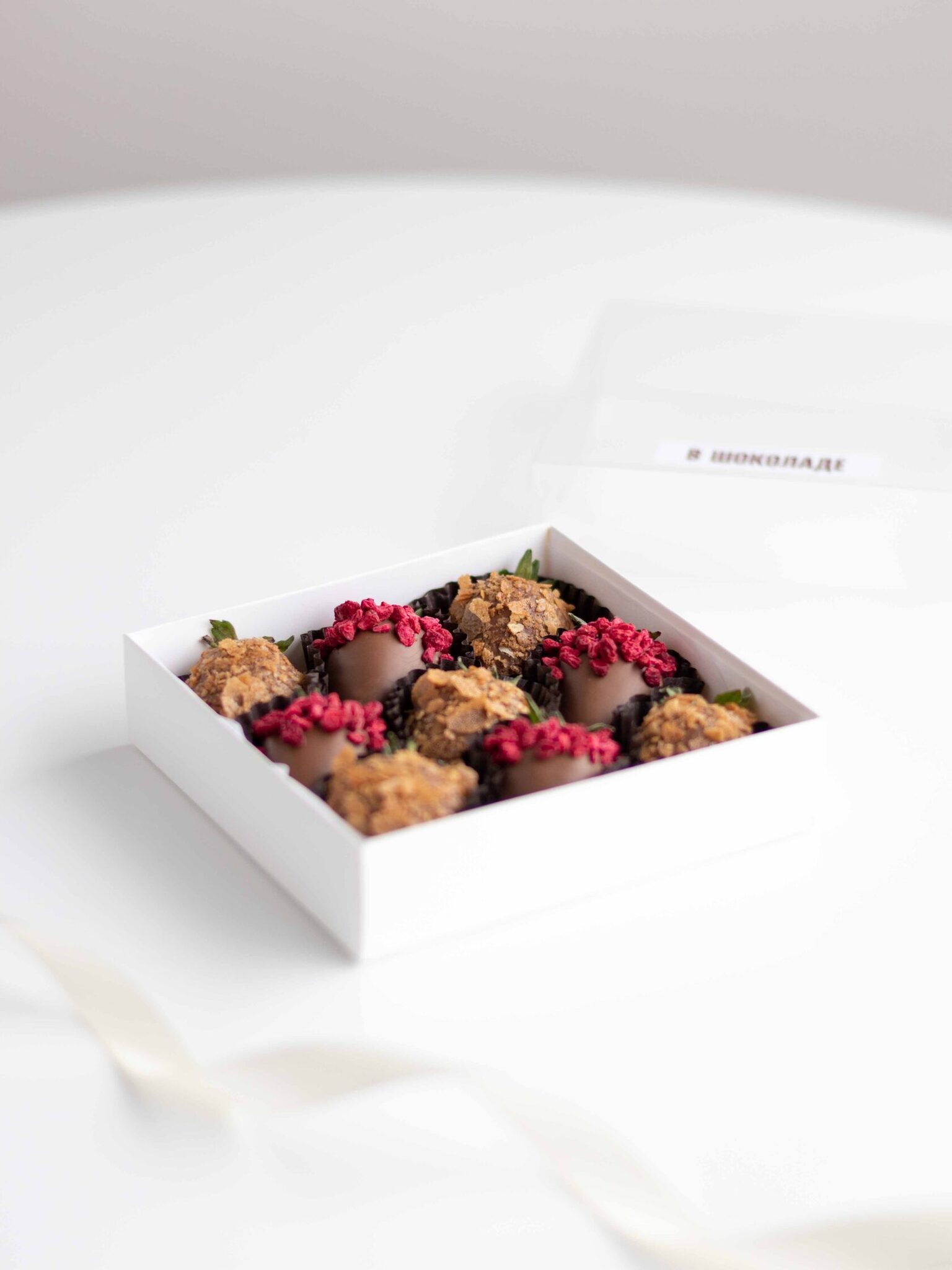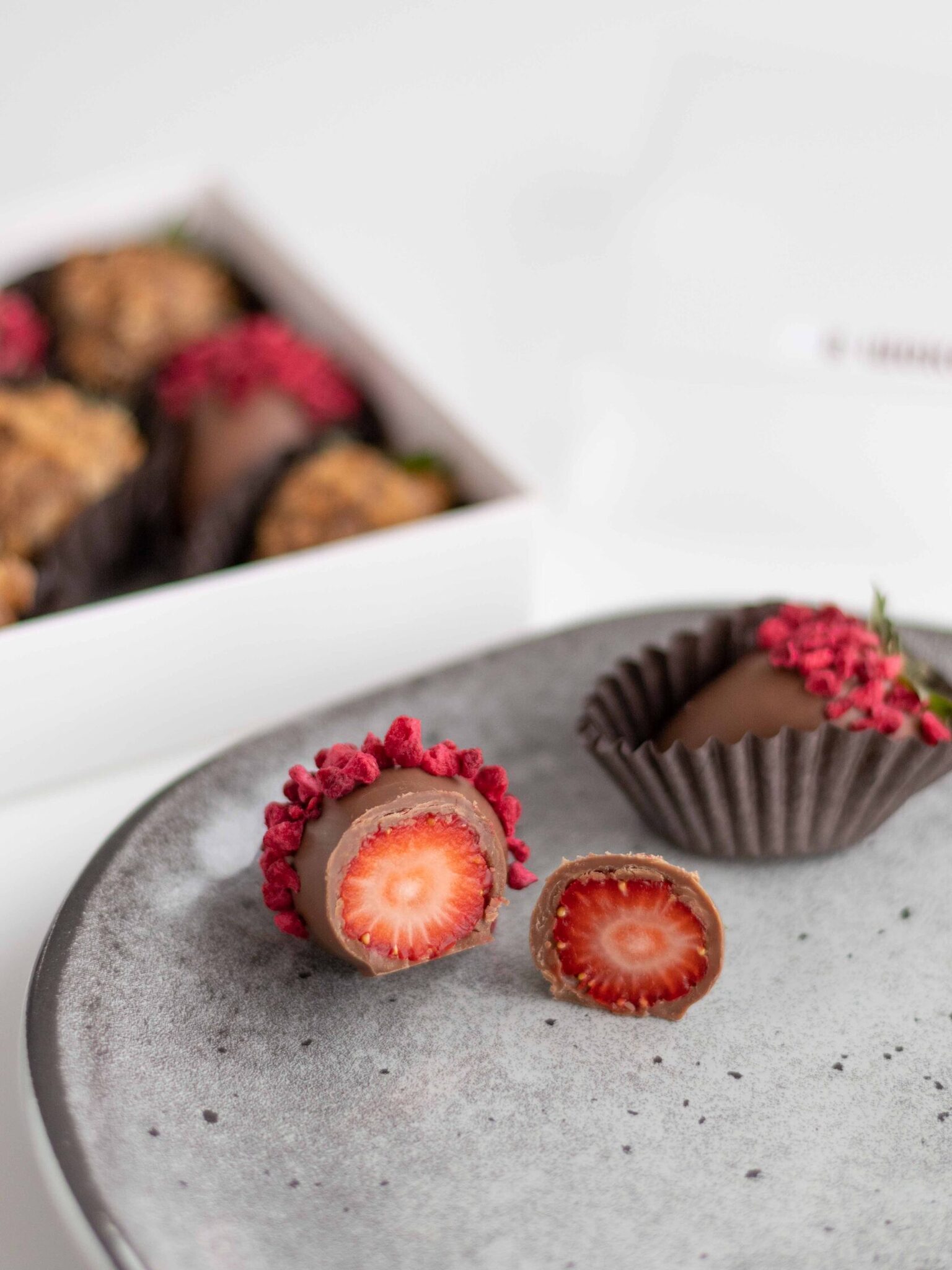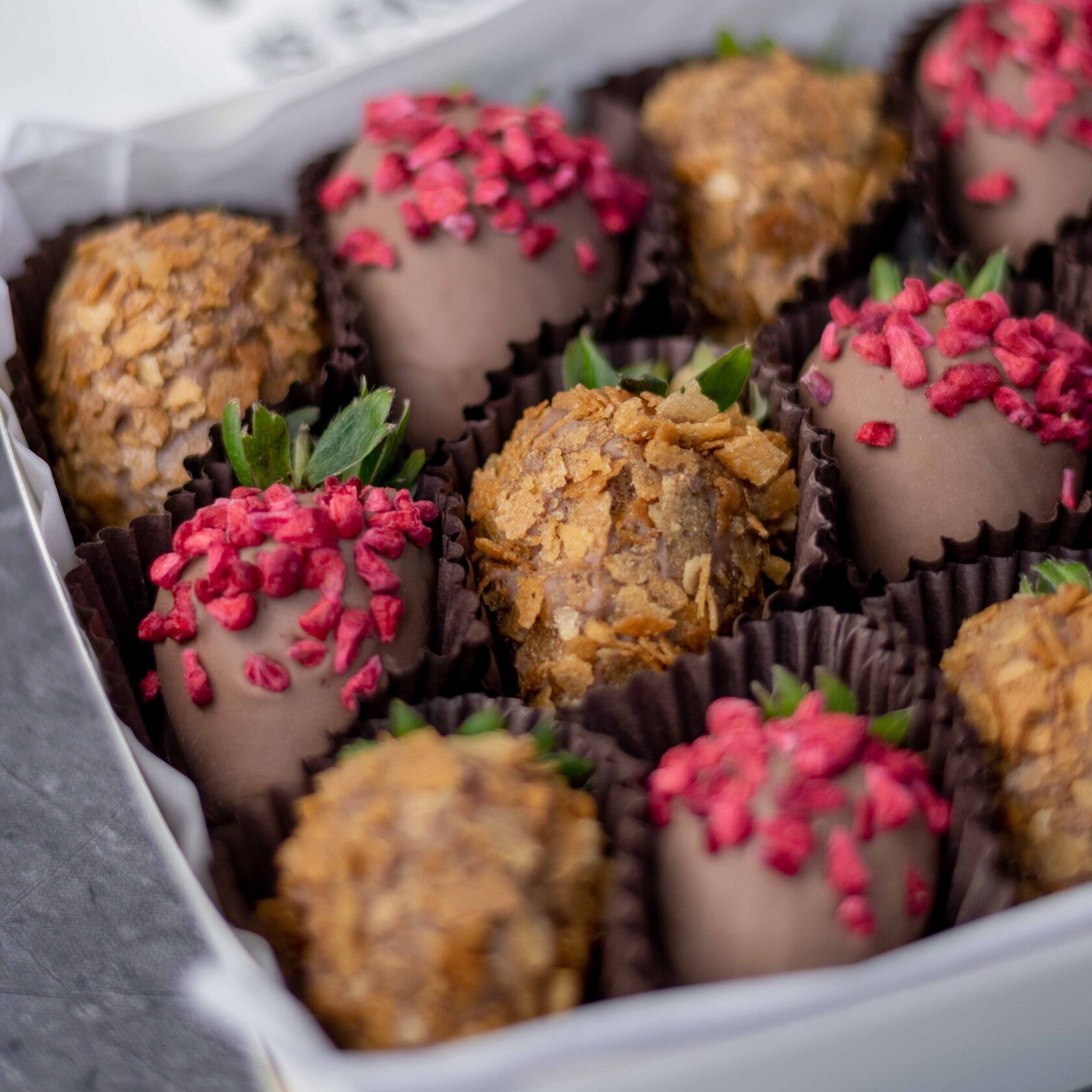Клубника свежая отборная⁣⁣⁣, Шоколад молочный, Малина сублимированная (сушеная), Вафельная крошка карамелизированная