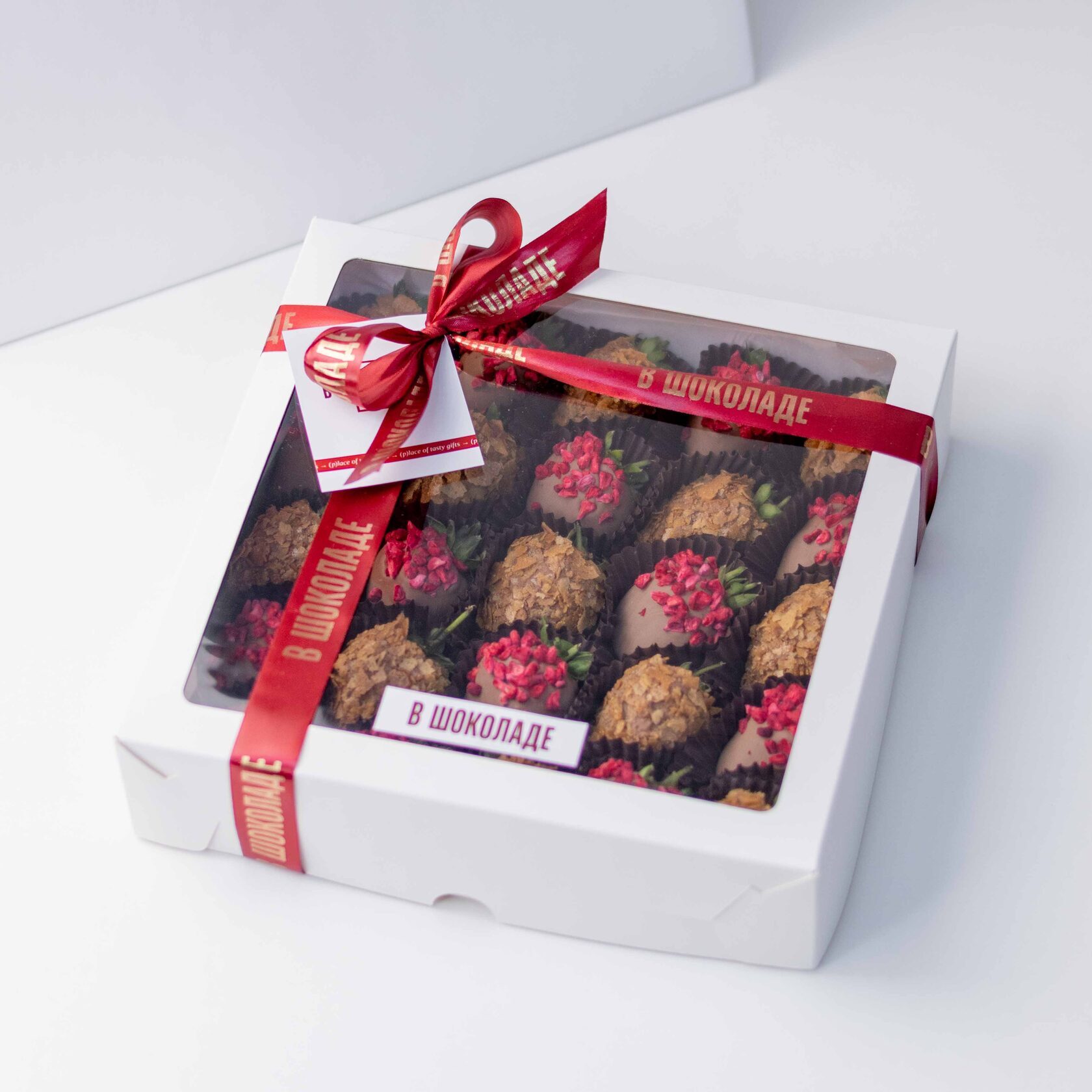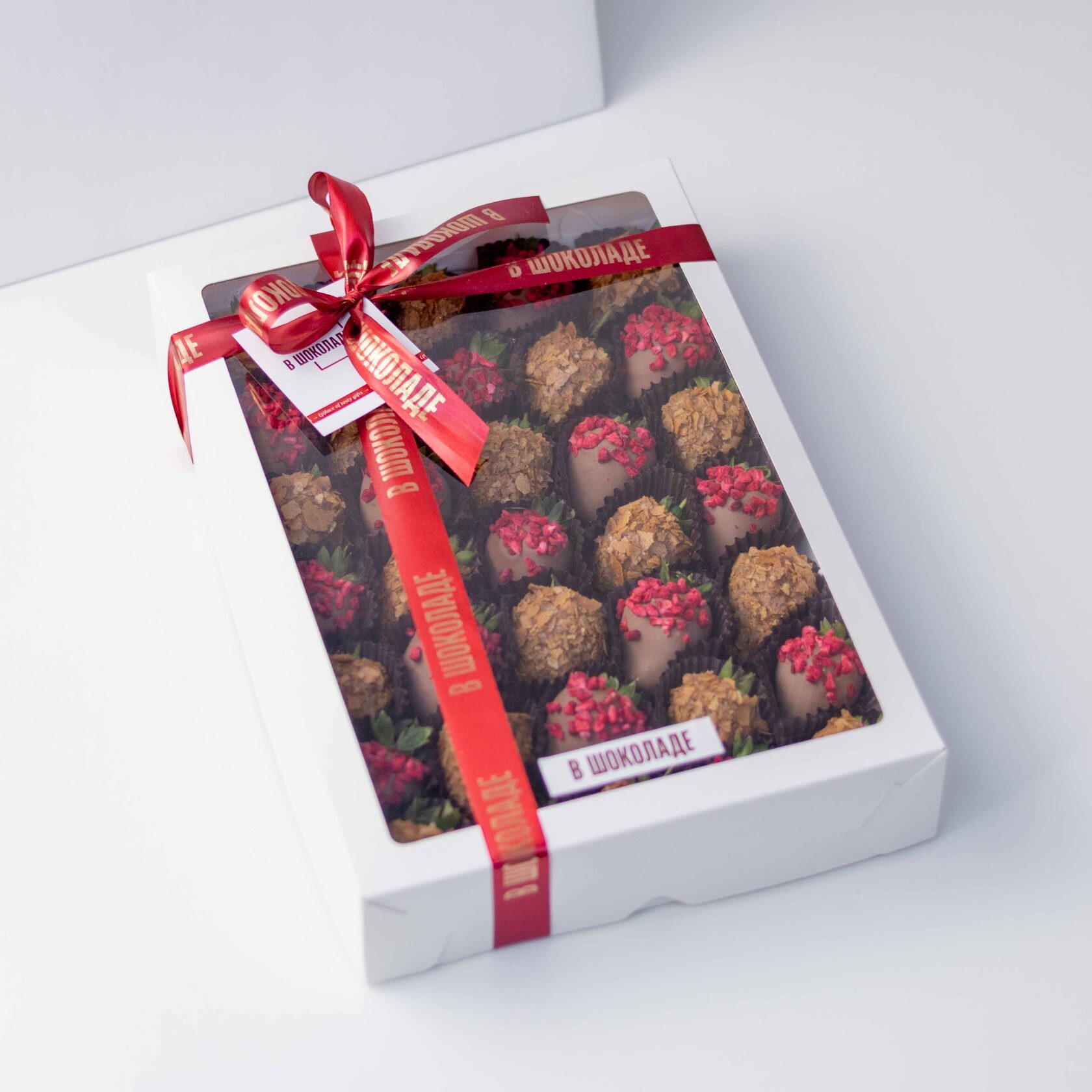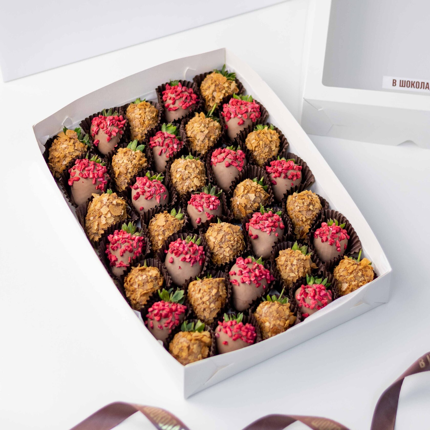 Большой, яркий набор клубники в молочном шоколаде хрустящей вафельной крошкой и сушеной малиной!