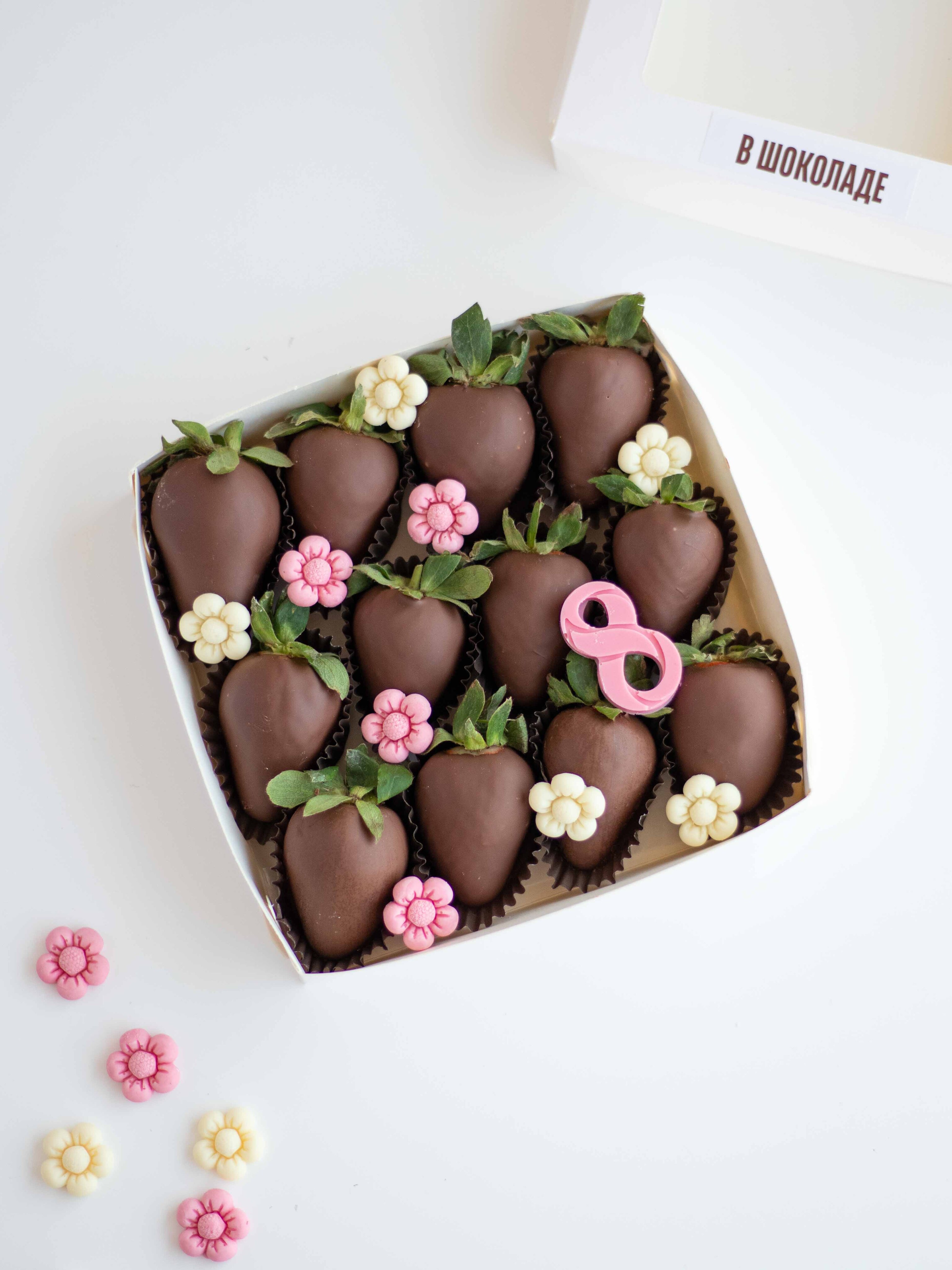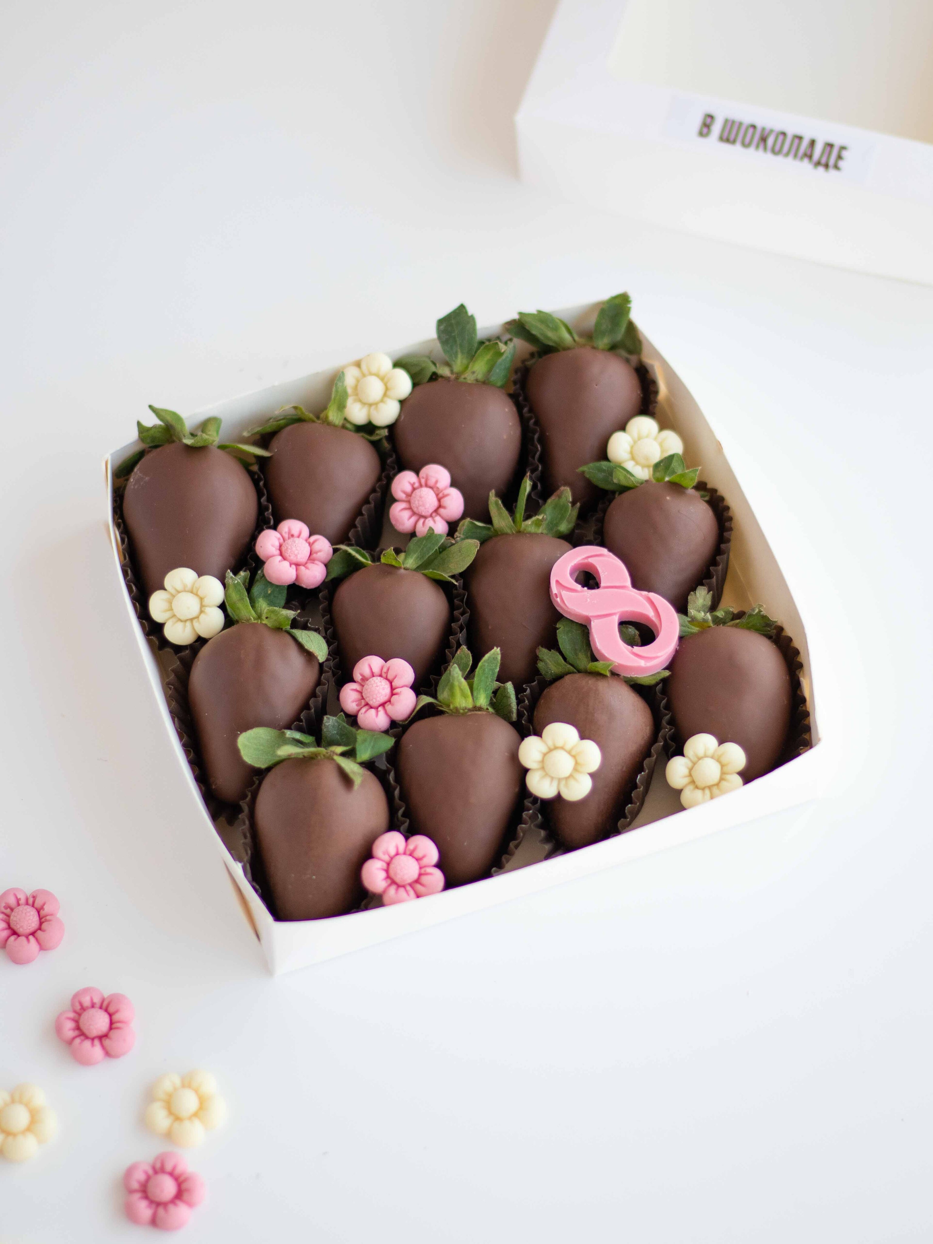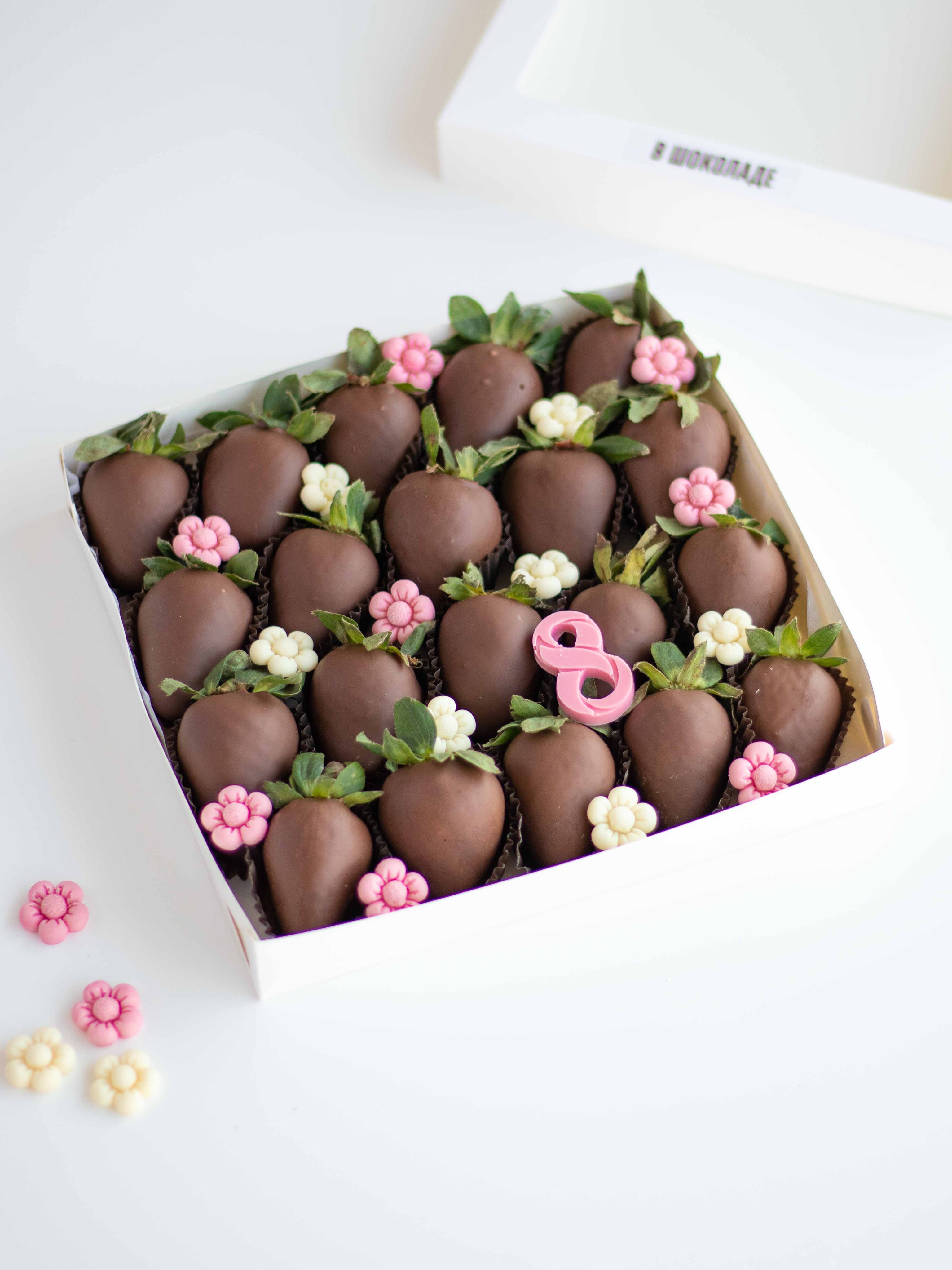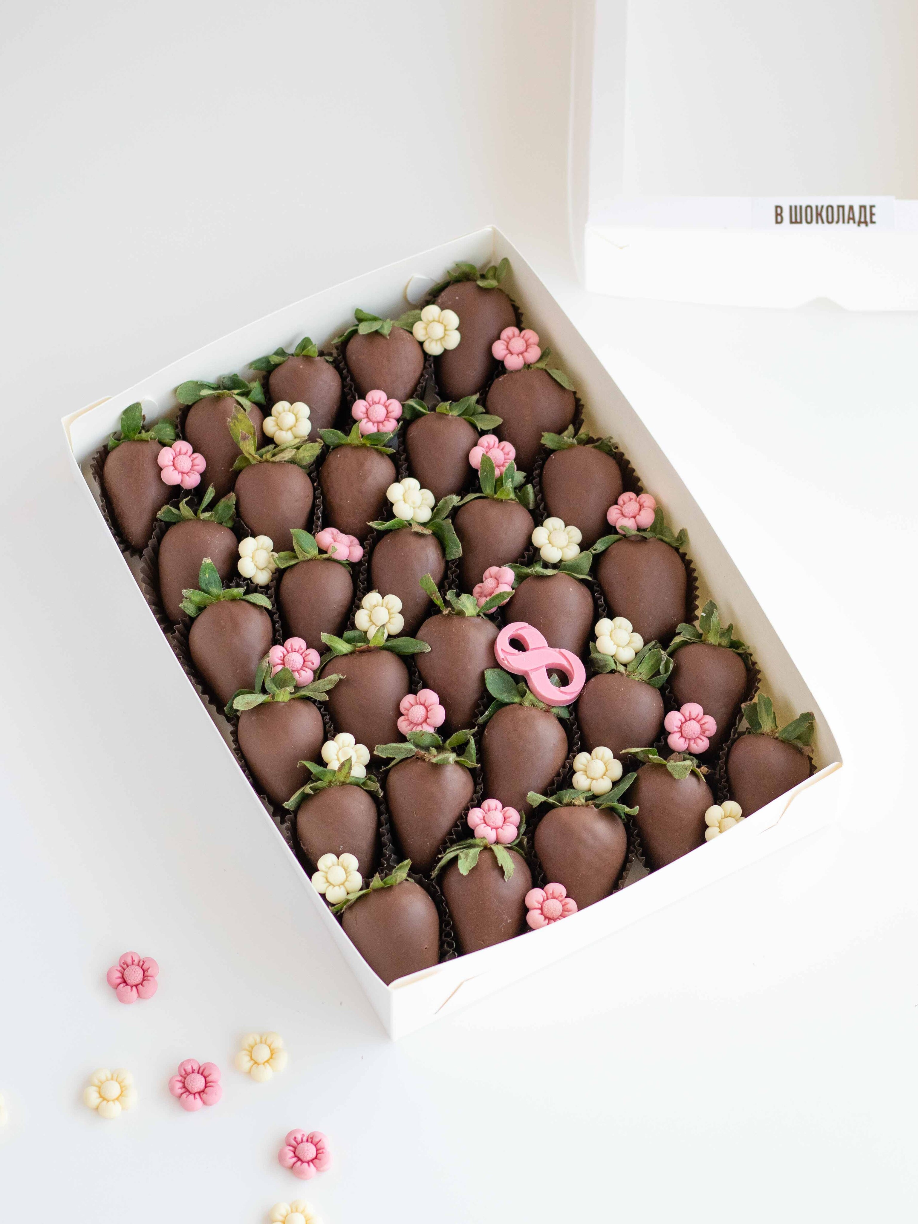 Состав: Клубника свежая отборная, Шоколад молочный, Шоколадный декор